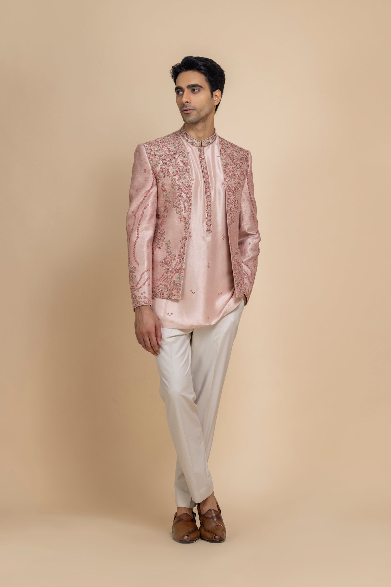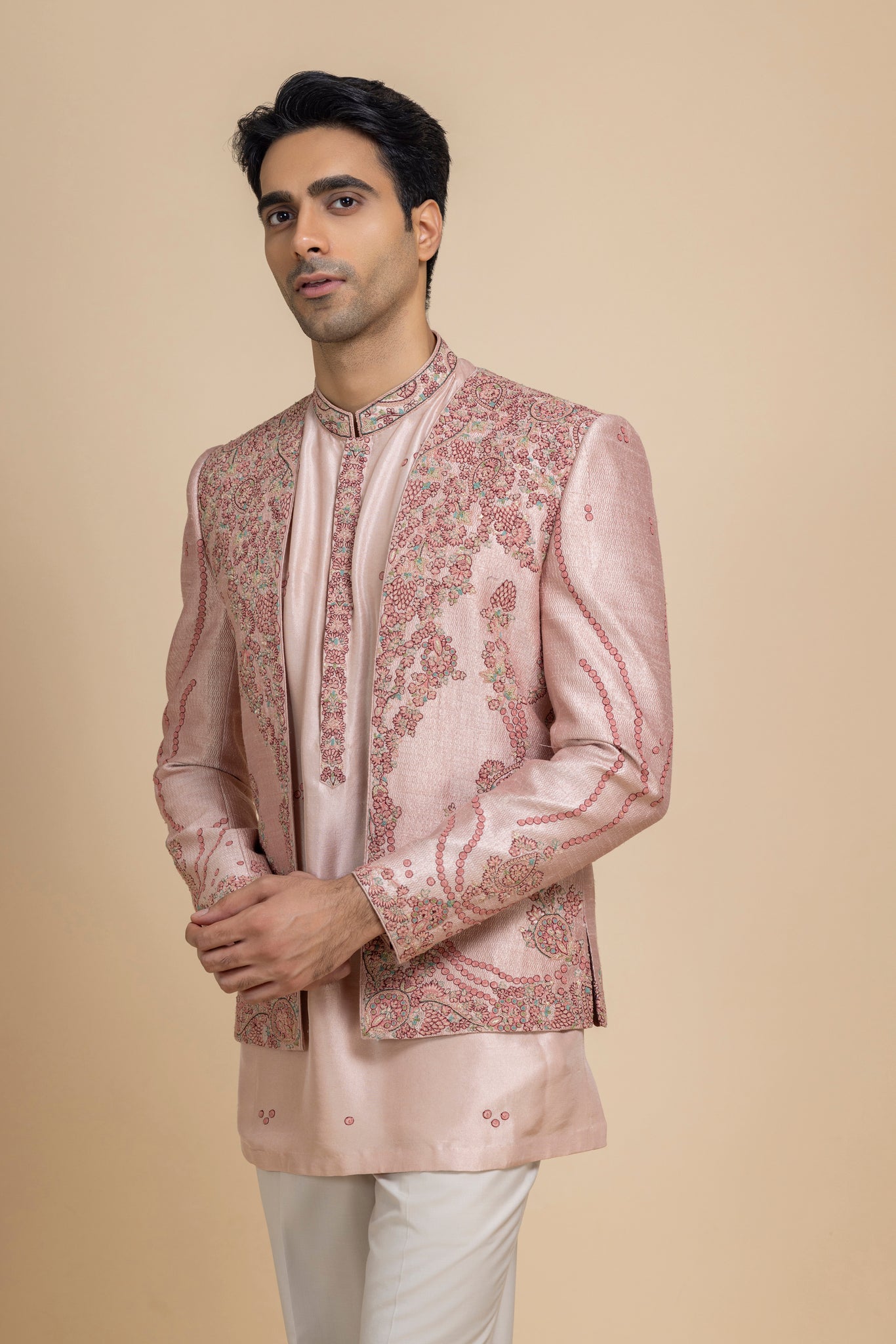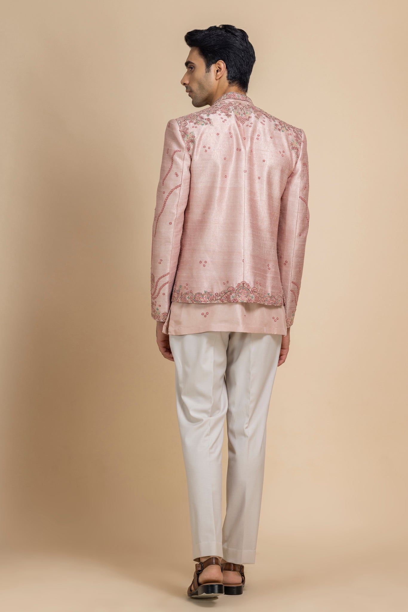 "This Pink Rose Raw Silk Jacket Paired With A Dupion Silk Kurta And Cotton Silk Trousers Is Exquisitely Hand-Embroidered With Delicate Floral Motifs, Creating A Refined Focus On The Jacket. Complemented By Relaxed Trousers, This Ensemble Blends Artisanal Craftsmanship With Effortless Elegance — Perfect For Weddings, Festive Gatherings, Or Evening Celebrations."