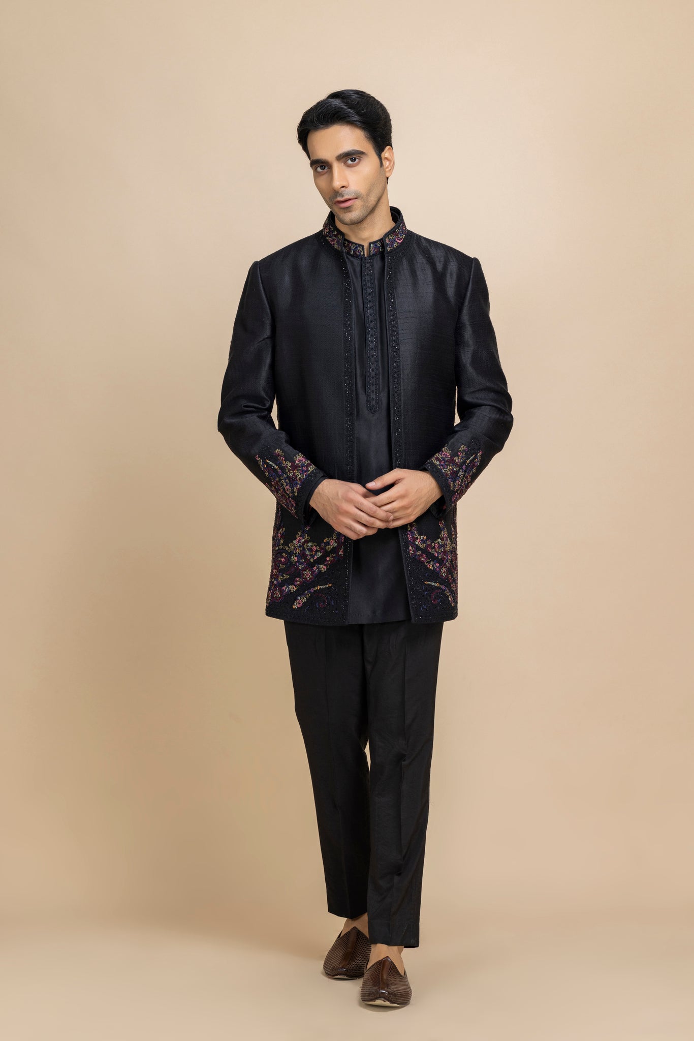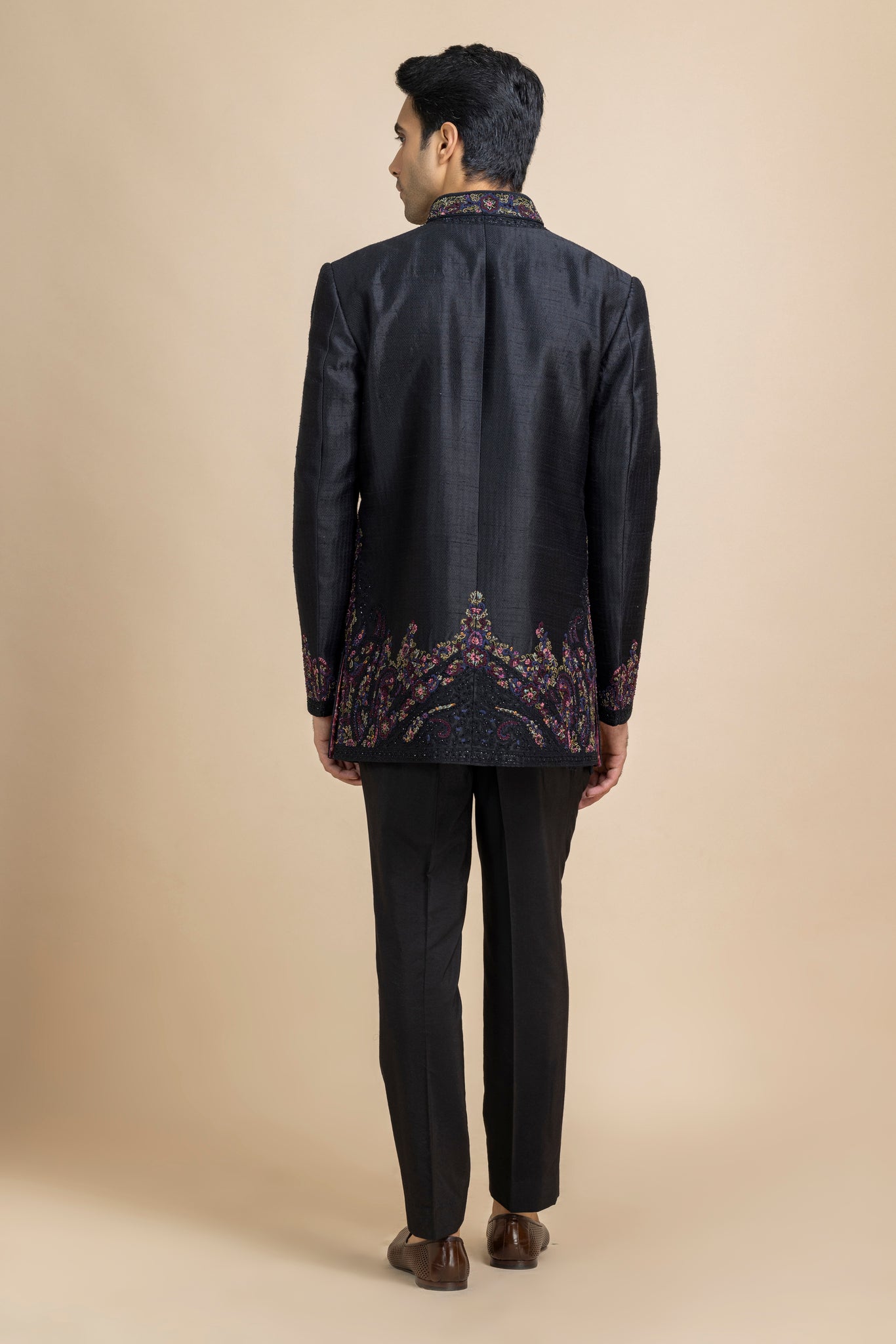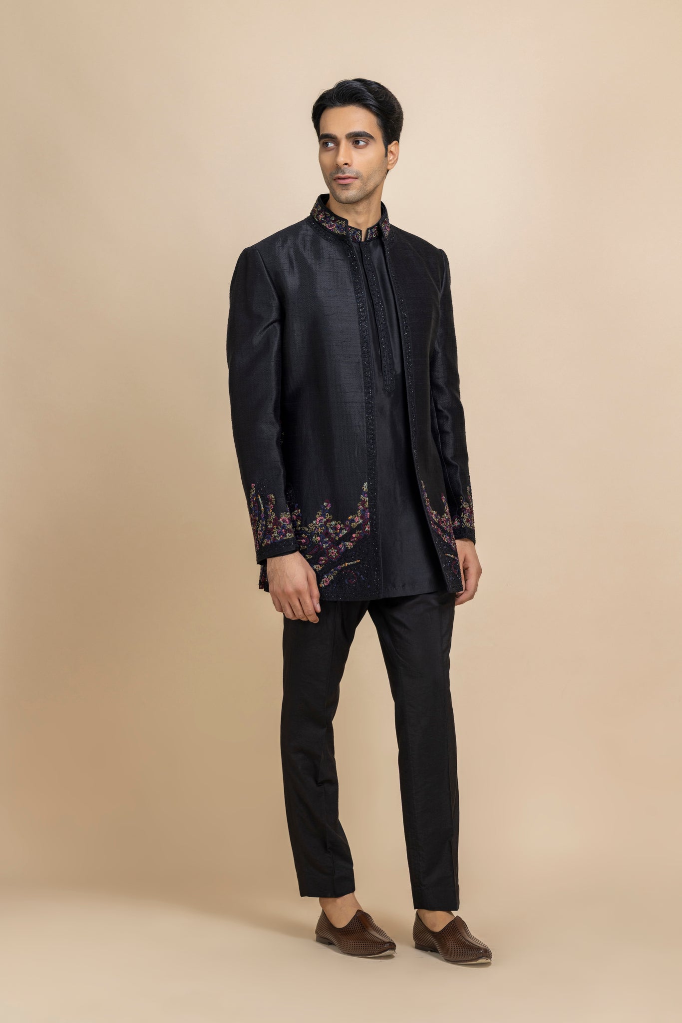 This Black Raw Silk Jacket, Paired With A Classic Dupian Silk Shirt And Refined Japanese Crepe Trousers, Is A Masterful Composition Of Texture And Silhouette. The Structure Of The Raw Silk Jacket Is A Striking Counterpoint To The Subtle Sheen Of The Silk Shirt, Creating A Sophisticated Focus For The Ensemble. Paired With The Crepe Trousers, This Look Is A Perfect Blend Of Modern Structure And Timeless Elegance