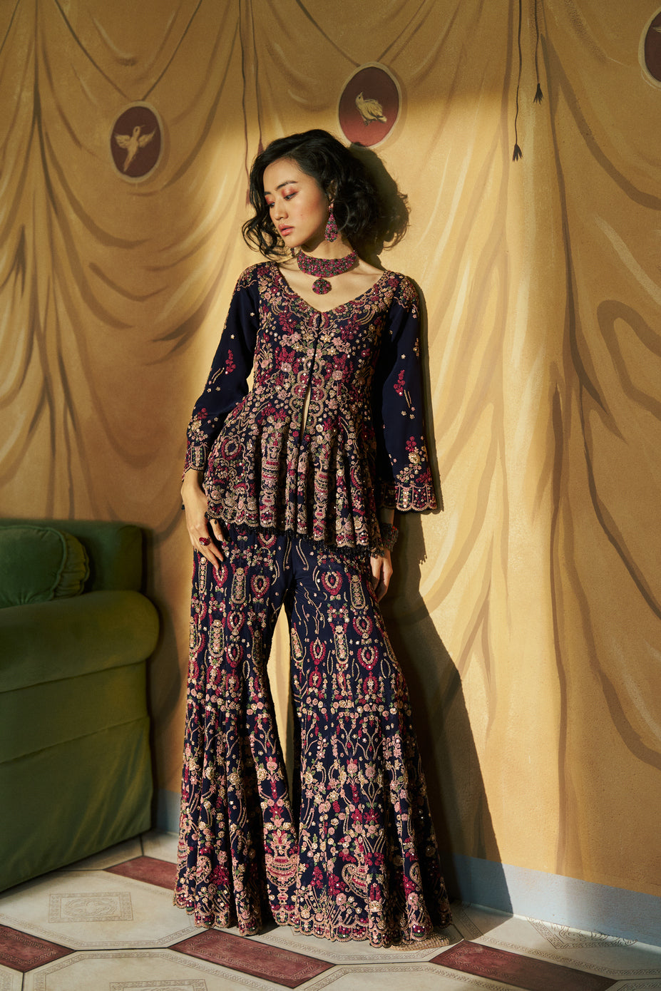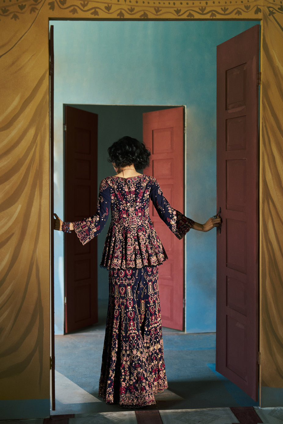 A Blue Crepe Kurta And Sharara Set, Featuring Intricate Multi-Color Dori Embroidery. The Rich Tones And Detailed Craftsmanship Make It A Timeless Pick For Festive Celebrations And Special Occasions.