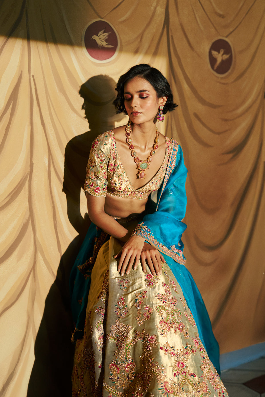 A Lustrous Green Tissue Lehenga, Sculpted In Fluid Kalis, Paired With A Contrasting Cerulean Organza Dupatta. Adorned With Vibrant Dori-Inspired Embroidery, The Ensemble Celebrates A Harmonious Blend Of Texture, Tone, And Heritage Craftsmanship—Perfect For Statement Occasions.