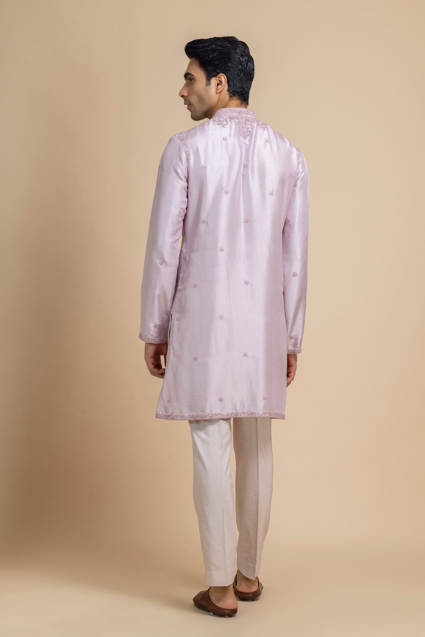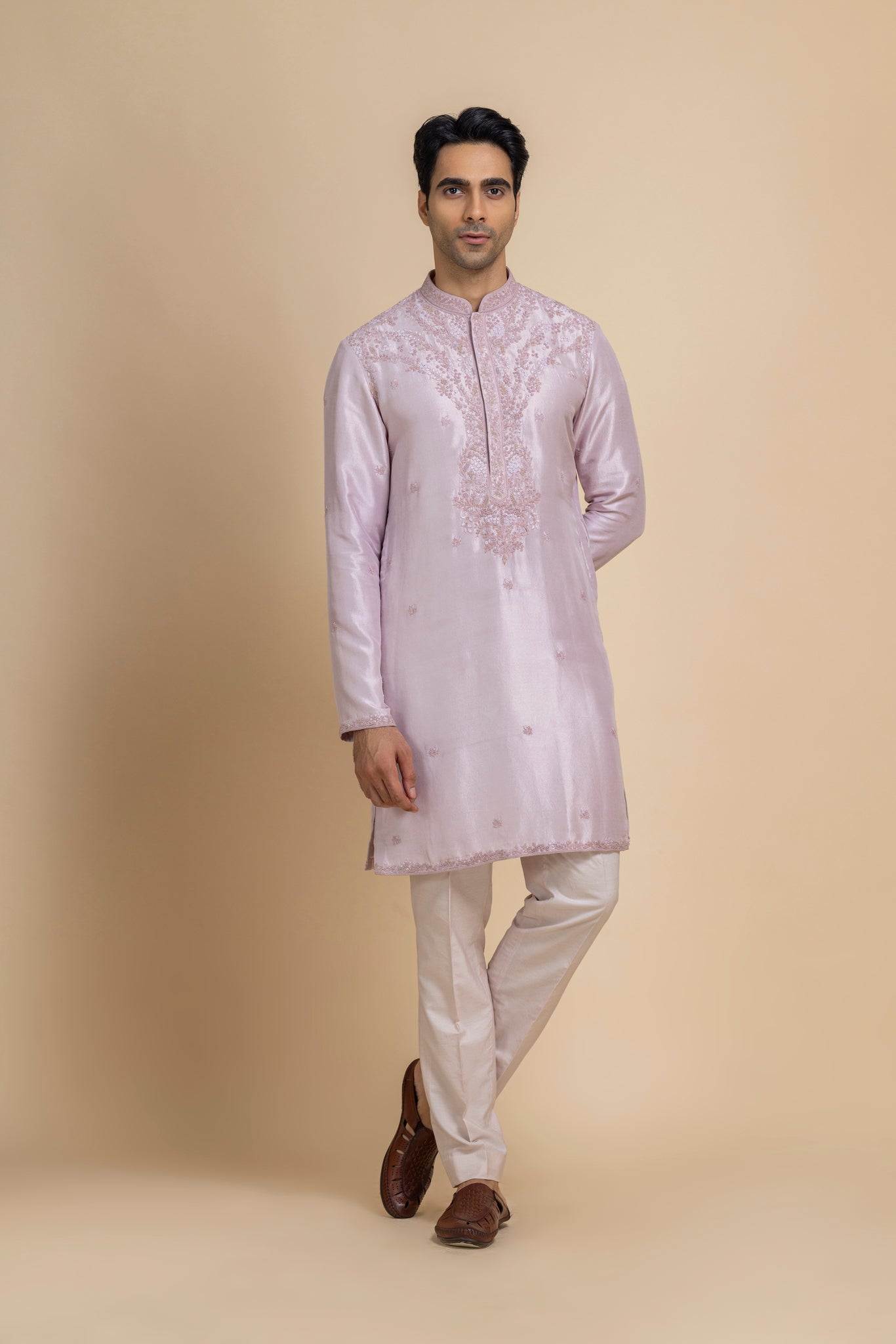 This Tonal Lavender Kurta, Crafted In Luxe Raw Silk For A Natural Sheen And Rich Texture. Subtle Tonal Embroidery Enhances The Neckline And Hem, Adding Understated Charm, While The Soft Ivory Pants Provide A Balanced, Contemporary Silhouette. Ideal For Festive Celebrations, Casual Soirées, Or Elevated Everyday Dressing.