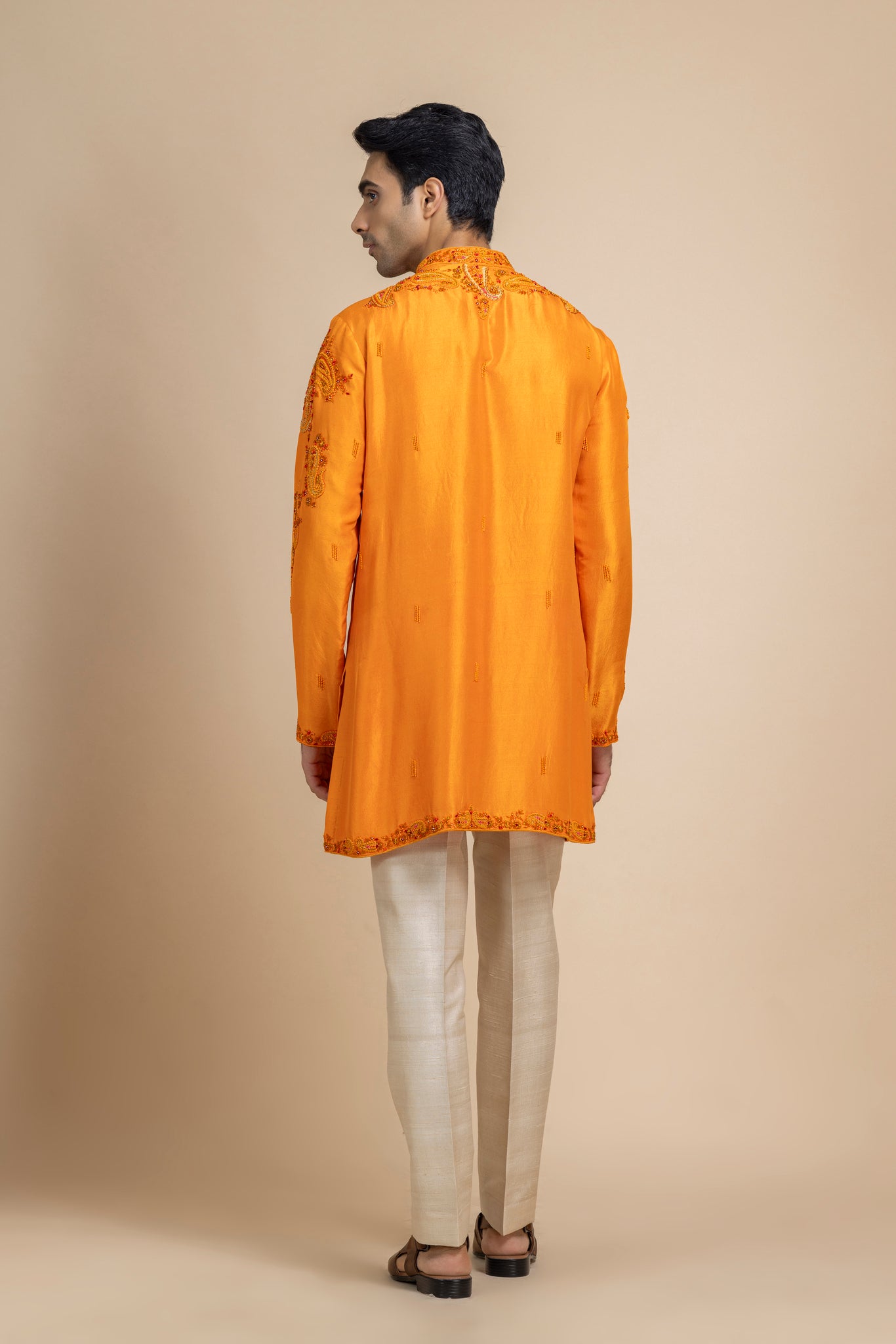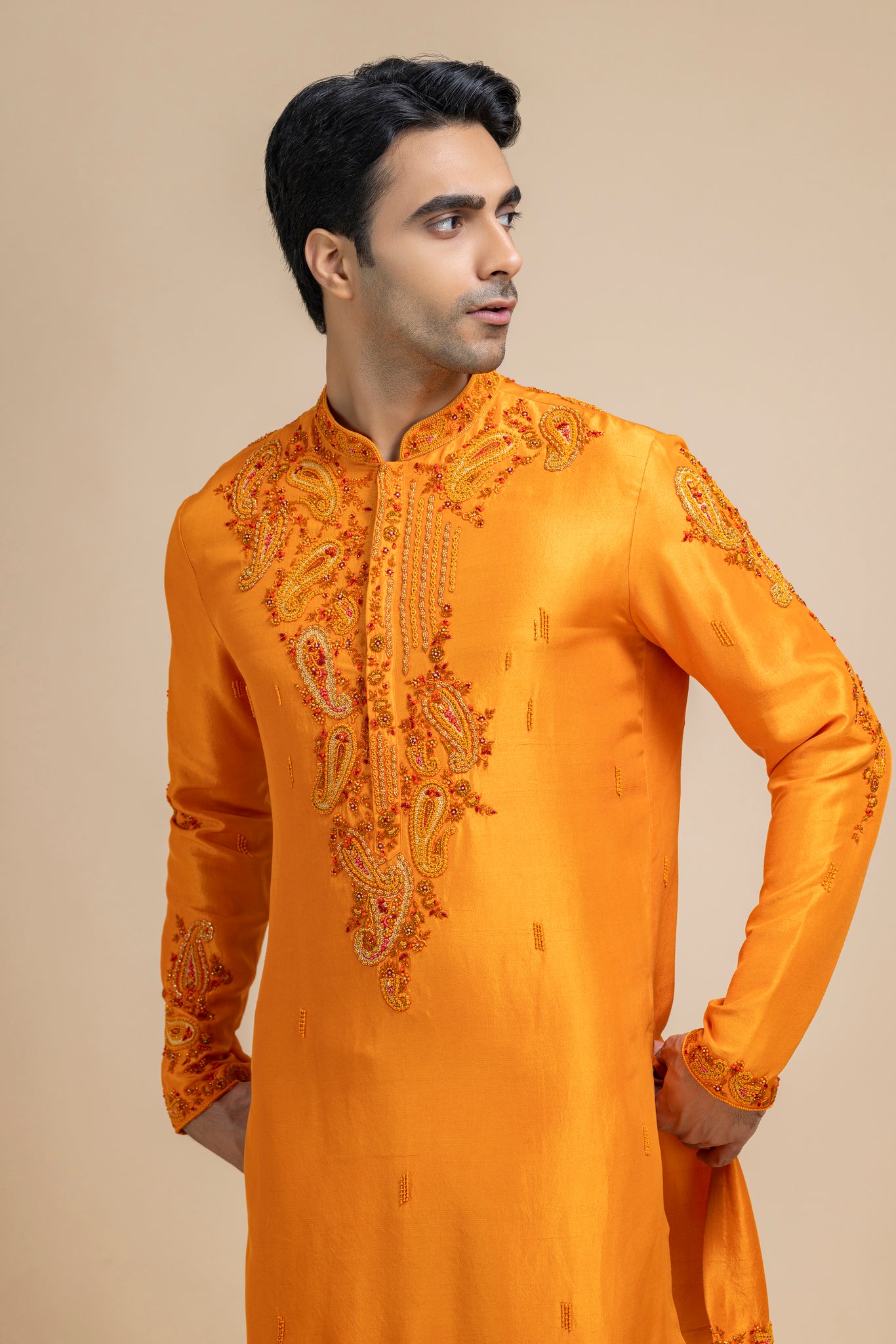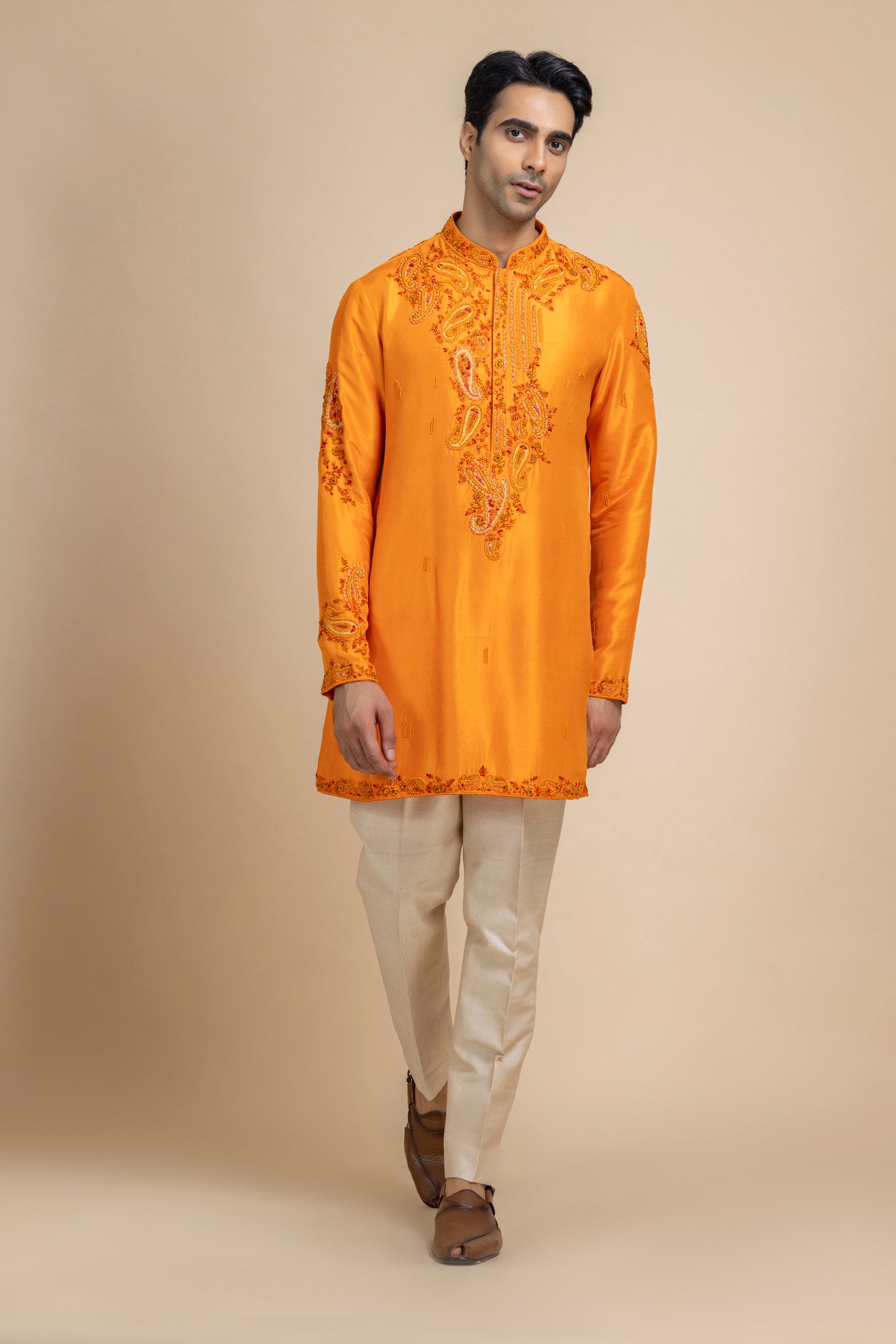 A Striking Saffron Silk Kurta Accentuated With Intricate Paisley Embroidery And Beadwork, Celebrating Heritage With A Vibrant Modern Touch Pired With A Beige Pant. Perfect For Festive Occasions And Standout Celebratory Looks.