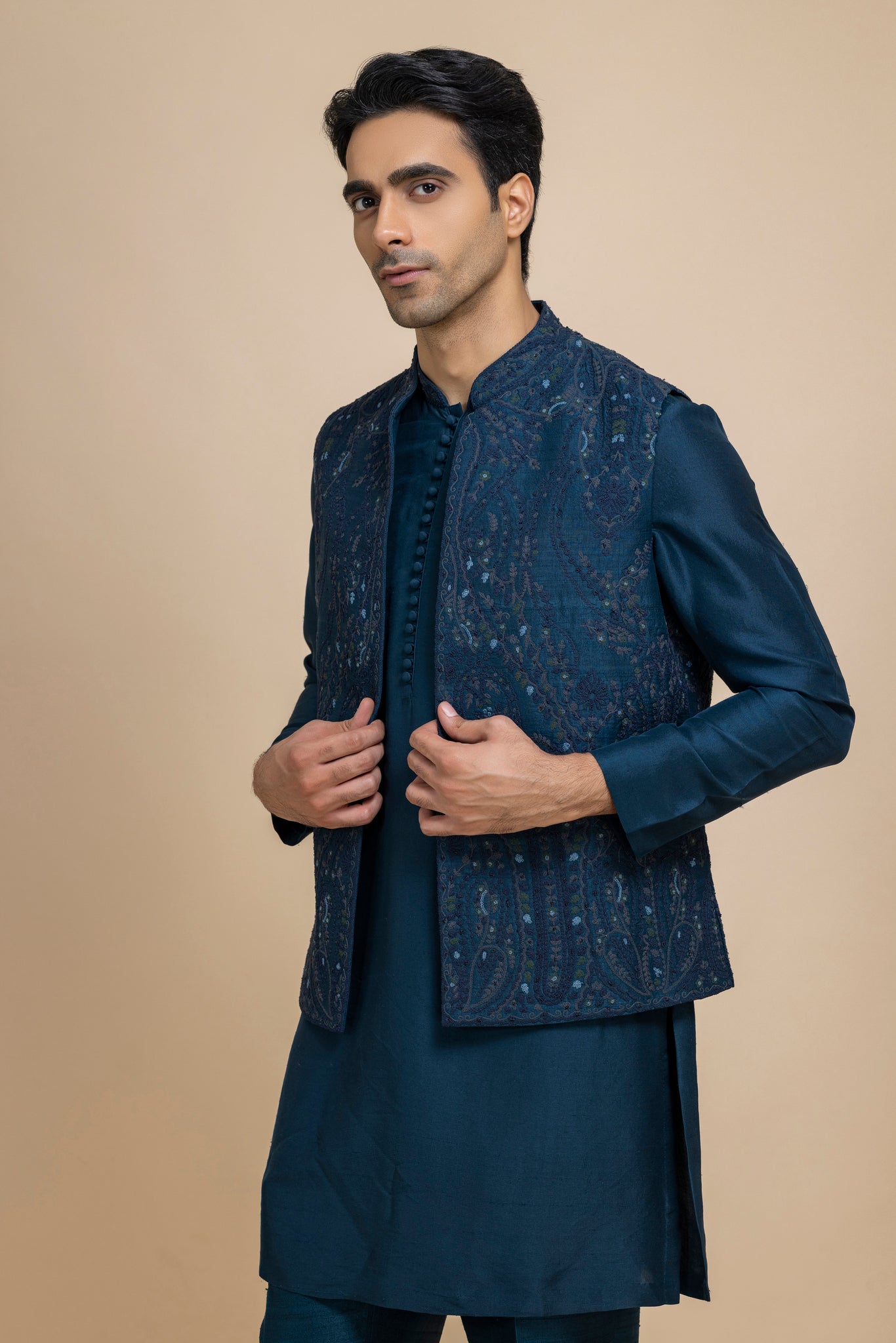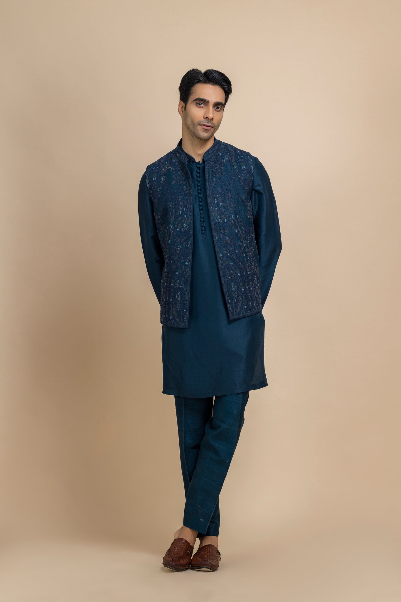 "This Midnight Blue Bundi And Kurta Pant Set Features A Raw Silk Bundi Intricately Hand-Embroidered With Tonal Motifs, Layered Over A Dupion Silk Kurta And Paired With Fluid Cotton Silk Pants. The Ensemble Exudes Refined Craftsmanship And Contemporary Elegance, Making It Perfect For Festive Gatherings, Weddings, Or Evening Celebrations."