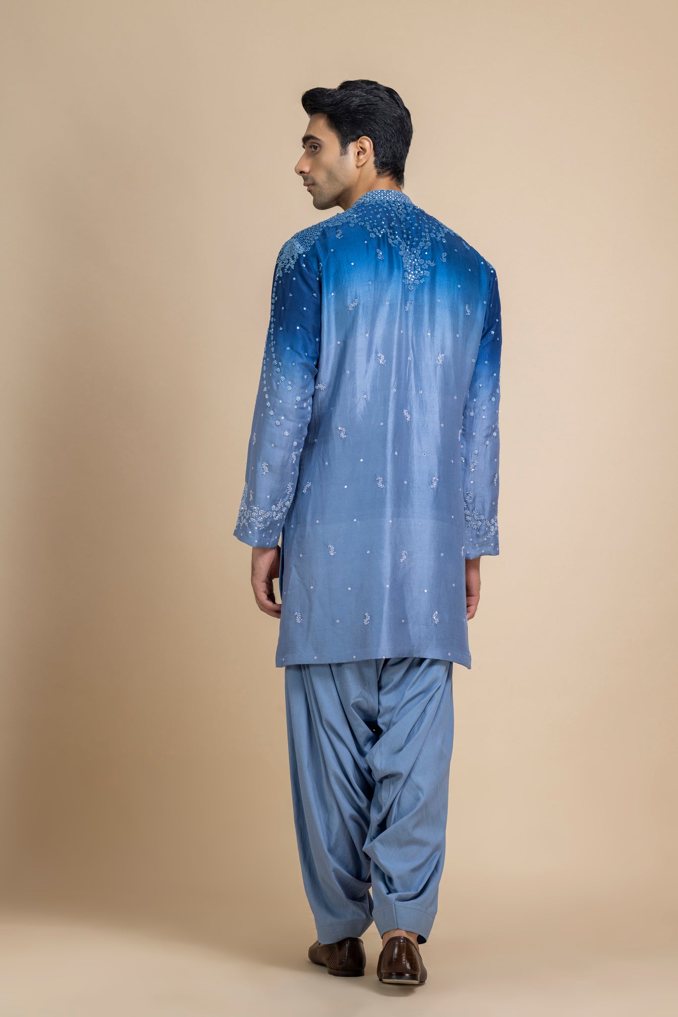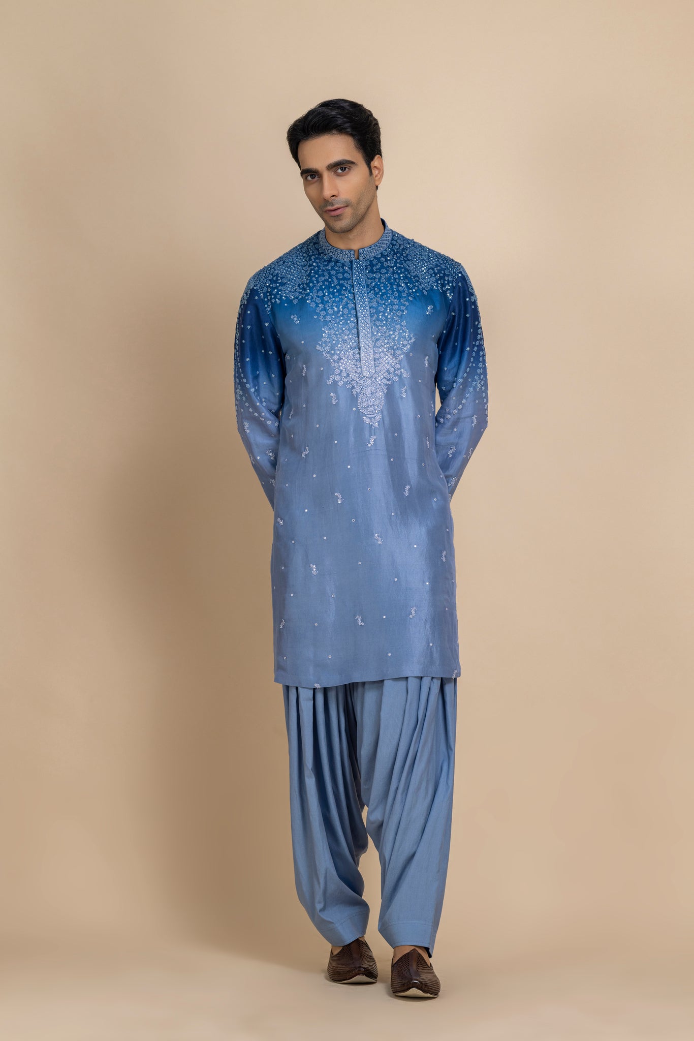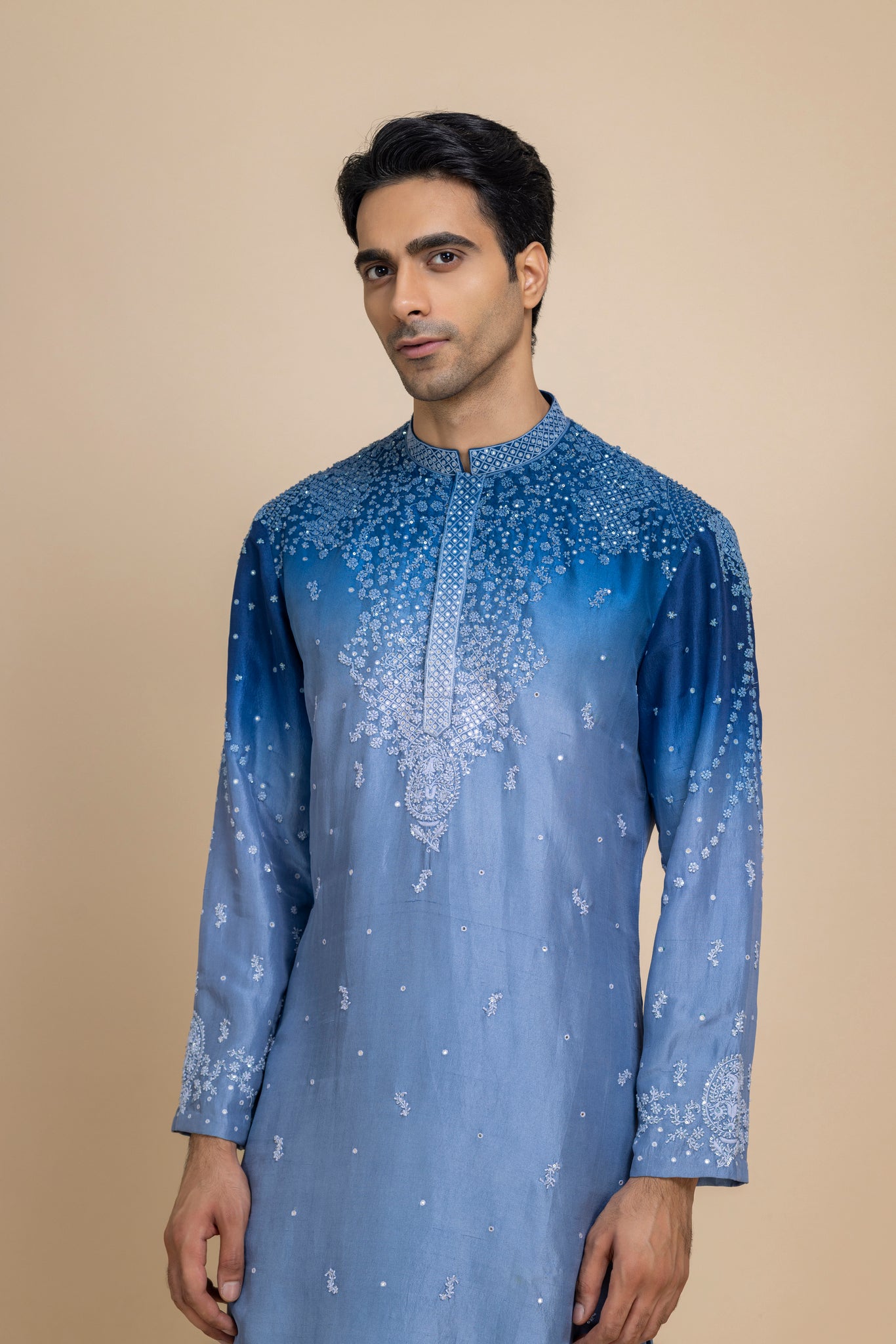 This Gradient Ombré Kurta Set In Soothing Shades Of Blue Is Delicately Hand-Embroidered With Tonal Threadwork, Creating A Striking Neckline Focus. Paired With Relaxed Salwar, This Look Is A Perfect Blend Of Tradition And Effortless Sophistication — Ideal For Weddings, Festive Soirées, Or Evening Celebrations.