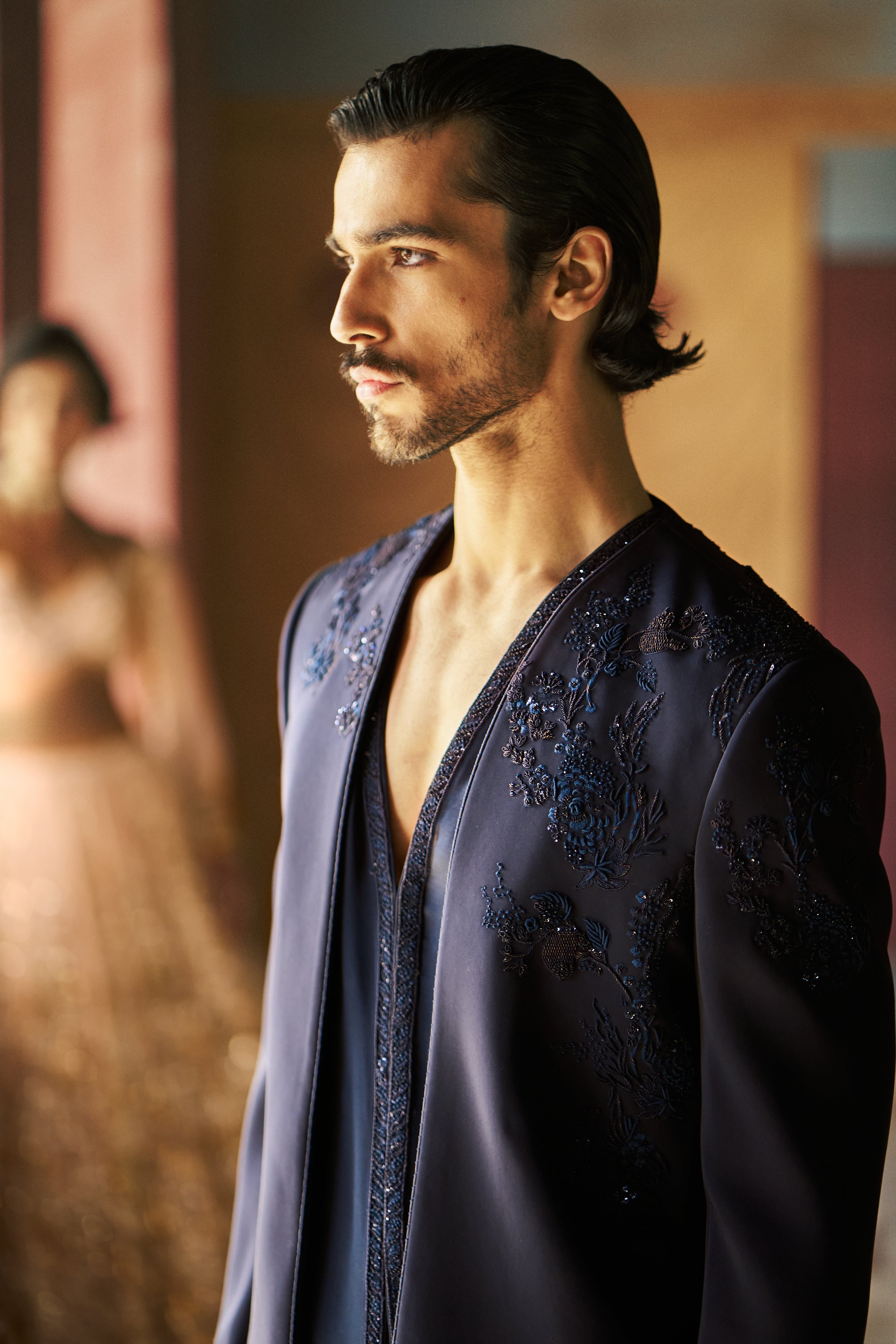 Crafted In A Rich Sapphire Hue, This Japanese Crepe Jacket Showcases Exquisite Tonal Hand Embroidery, Adding A Layer Of Refinement And Texture. Paired With A Luxurious Georgette Satin Shirt And Tailored Pants, This Ensemble Exudes Contemporary Elegance And Timeless Craftsmanship.