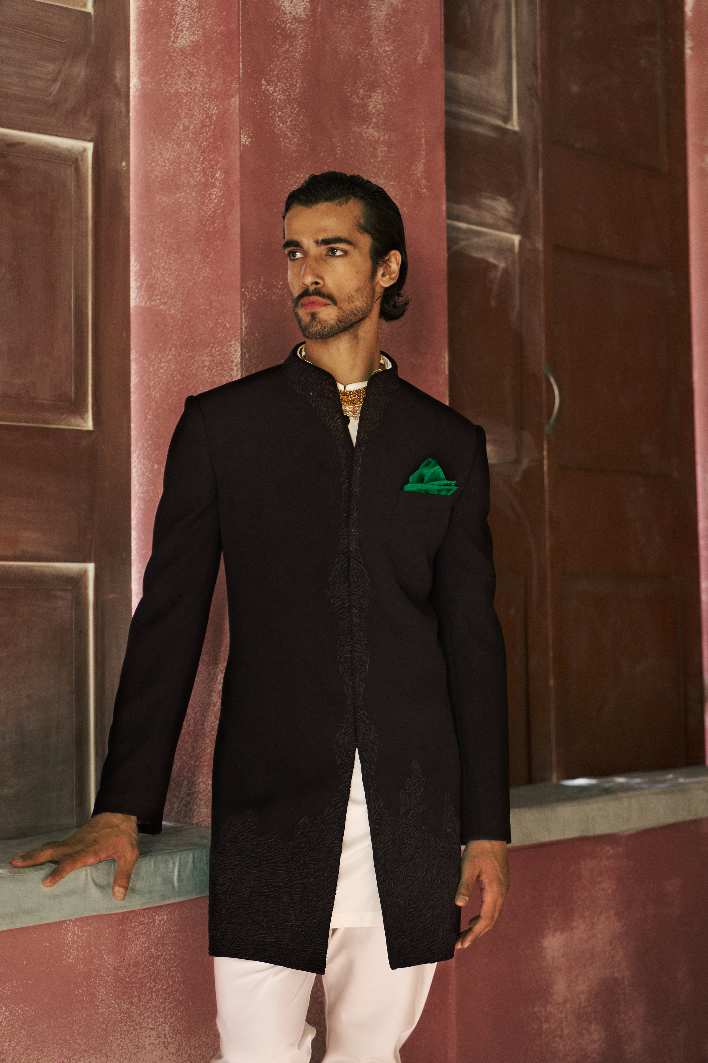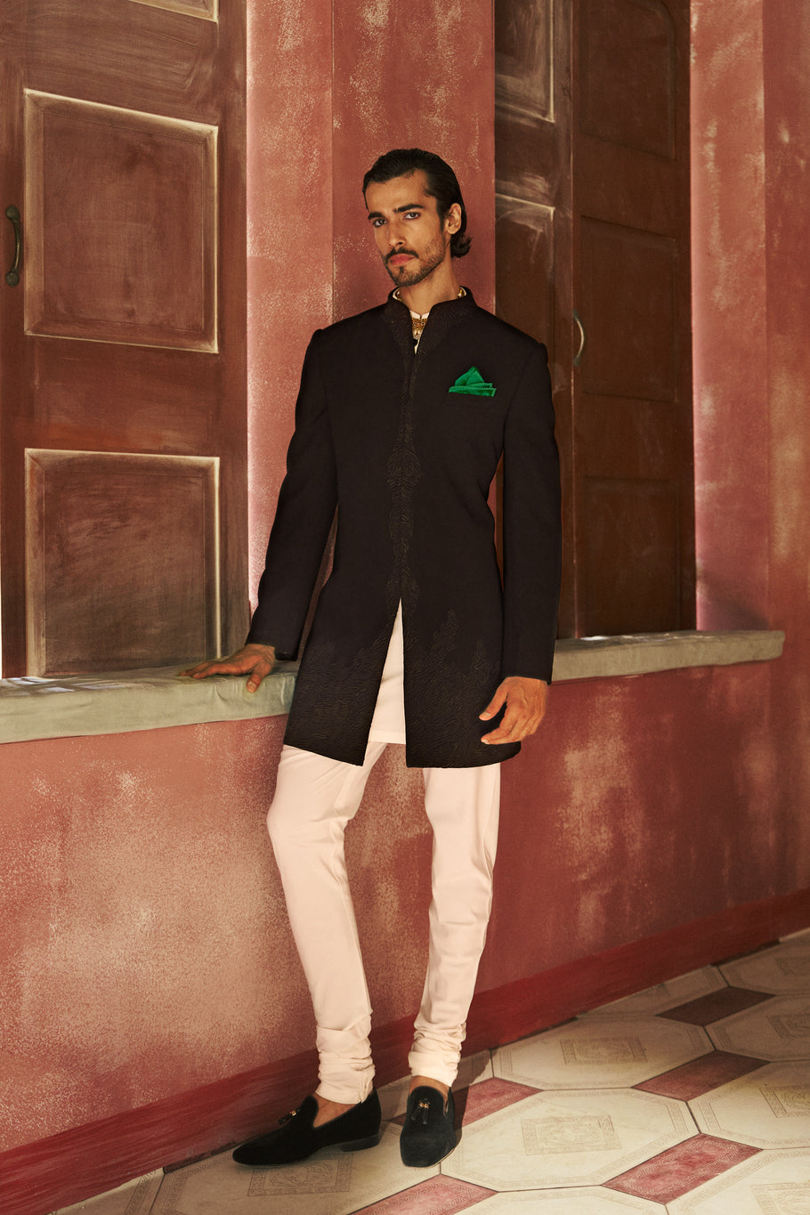 Crafted In A Deep Obsidian Hue, This Japanese Crepe Achkan Is Adorned With Tonal Threadwork And Opulent Bead Embellishments. Paired With A Cotton-Silk Kurta And Churidar, This Ensemble Offers A Refined Fusion Of Tradition And Luxury, With Meticulous Detailing That Epitomizes Sophisticated Craftsmanship.