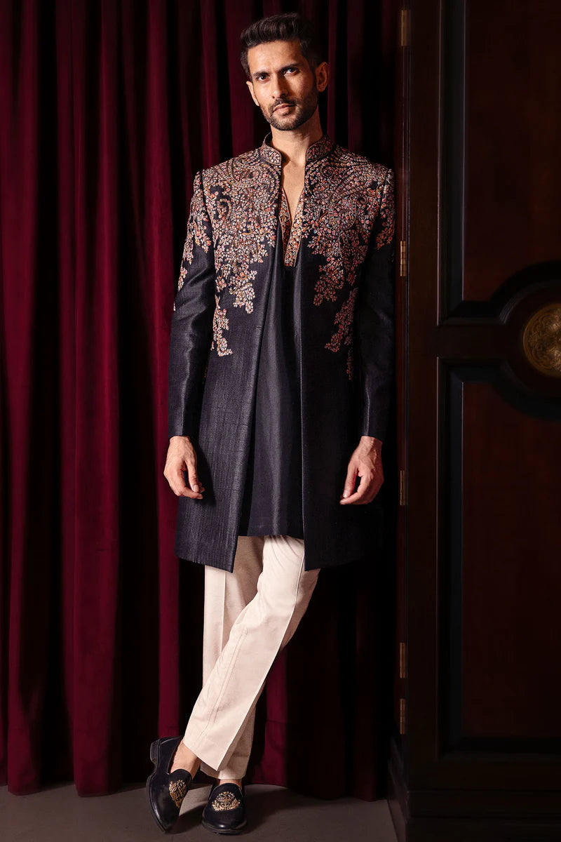 Tailored In Woven Raw Silk, This Black Long Open Jacket Is Adorned With Intricate Kashmiri Hand Embroidery, Accentuated By Fine Silk Cording For A Tactile Richness. Paired With A Dupion Silk Kurta And Cotton Silk Aligarhi Pants, The Ensemble Merges Classic Craftsmanship With Contemporary Silhouette Fluidity.