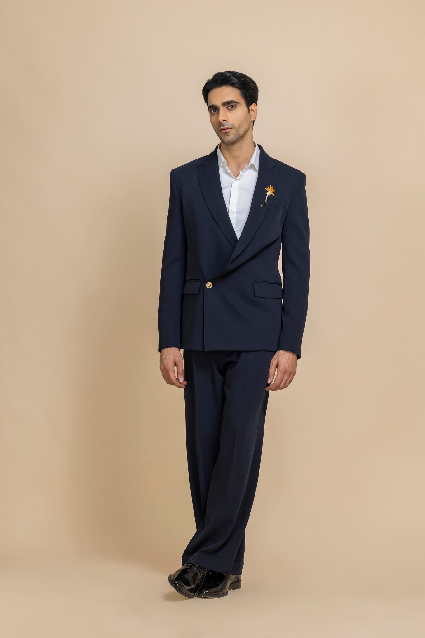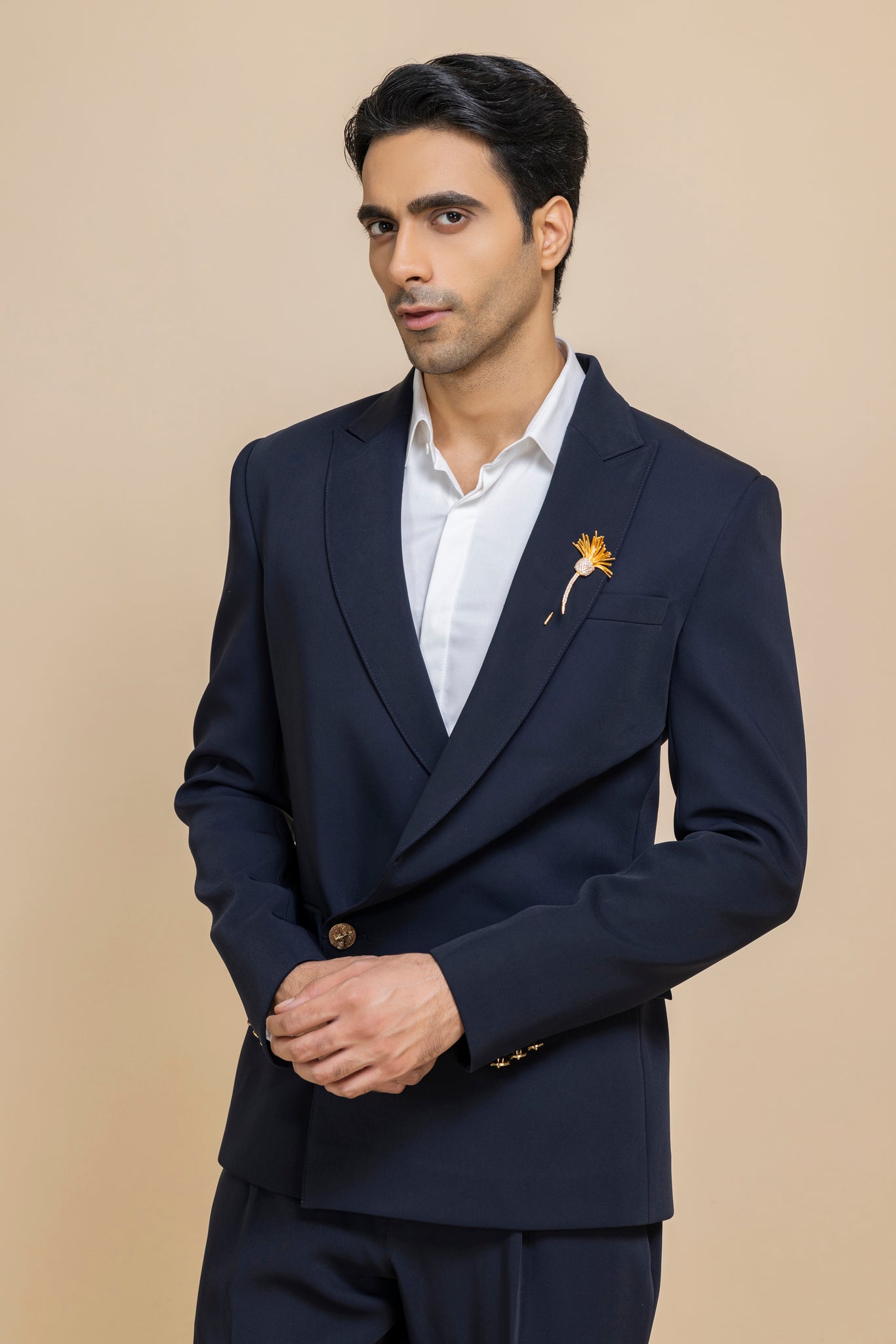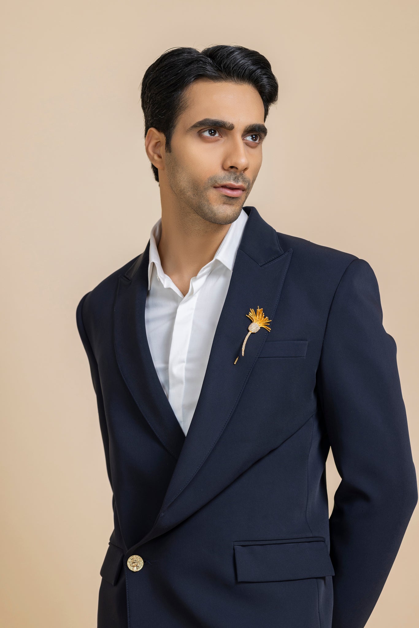 "This Navy Japanese Crepe Tuxedo Suit Is Exquisitely Crafted With Fine Tailoring, Paired With A Crisp Cotton Shirt And Accented With A Metallic Lapel Pin For A Subtle Statement. The Ensemble Exudes Refined Sophistication, Making It Perfect For Weddings, Evening Soirées, Or Celebratory Occasions."
