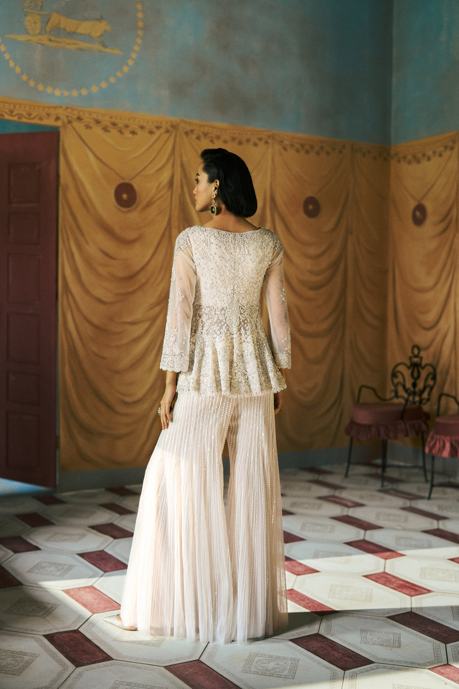 A Soft Ivory Tulle Kurta-Sharara Set, Beautifully Detailed With Tonal Pearl And Dori Embroidery. Elegant And Understated, It Brings Together Delicate Textures And Graceful Charm—Perfect For Daytime Celebrations Or Festive Evenings.