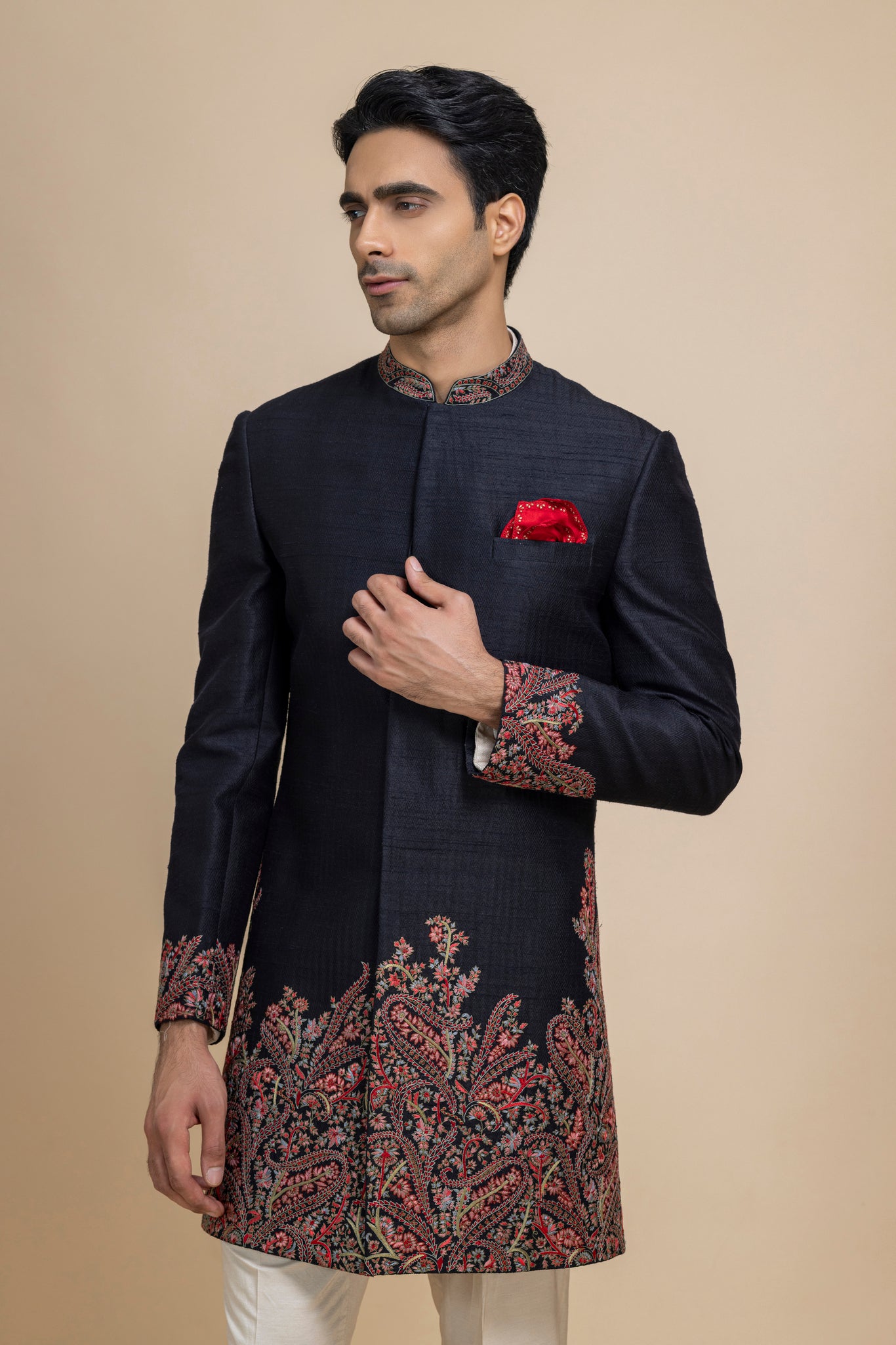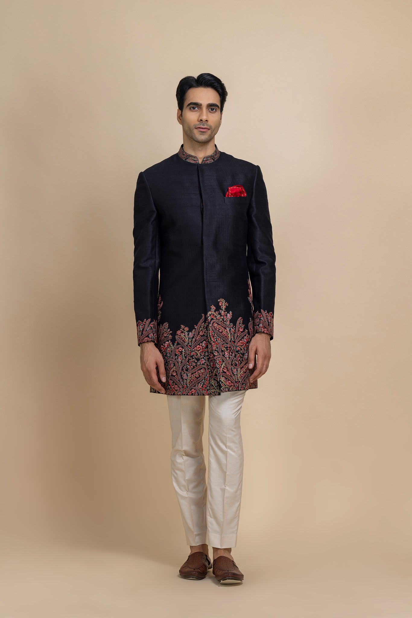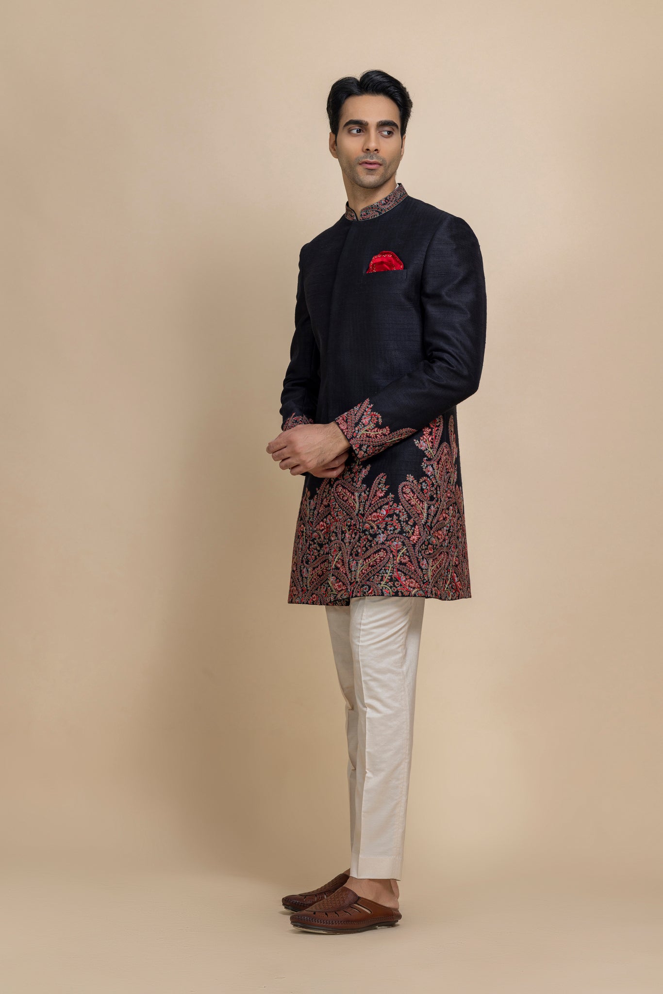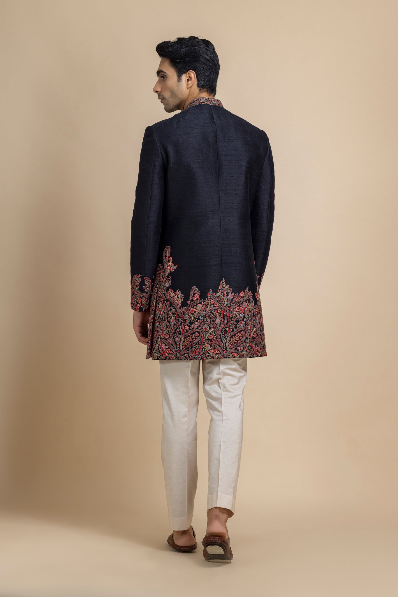 Crafted In Deep Black Raw Silk, This Piece Features Meticulously Hand-Embroidered Kashmiri Motifs That Bring Heritage Craftsmanship Into A Contemporary Silhouette. Designed To Be Versatile, It Pairs Beautifully With Matching Trousers & A Kurta, Making It Perfect For Both Celebratory Occasions And Distinguished Gatherings. The Tonal Kashidakari Embroidery Adds Subtle Depth, Letting You Shine With Understated Opulence.
