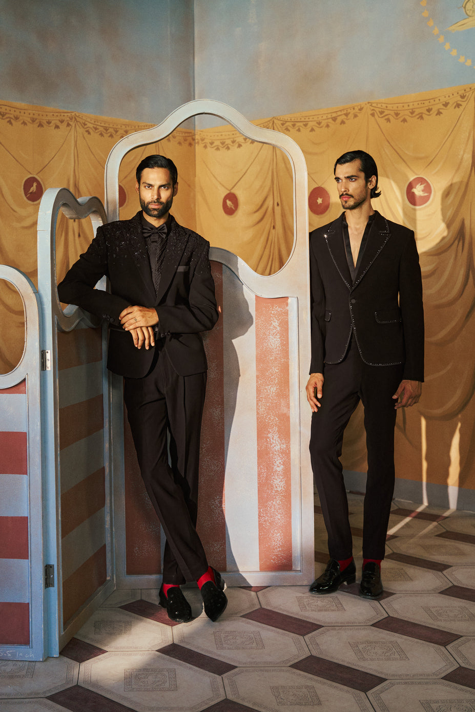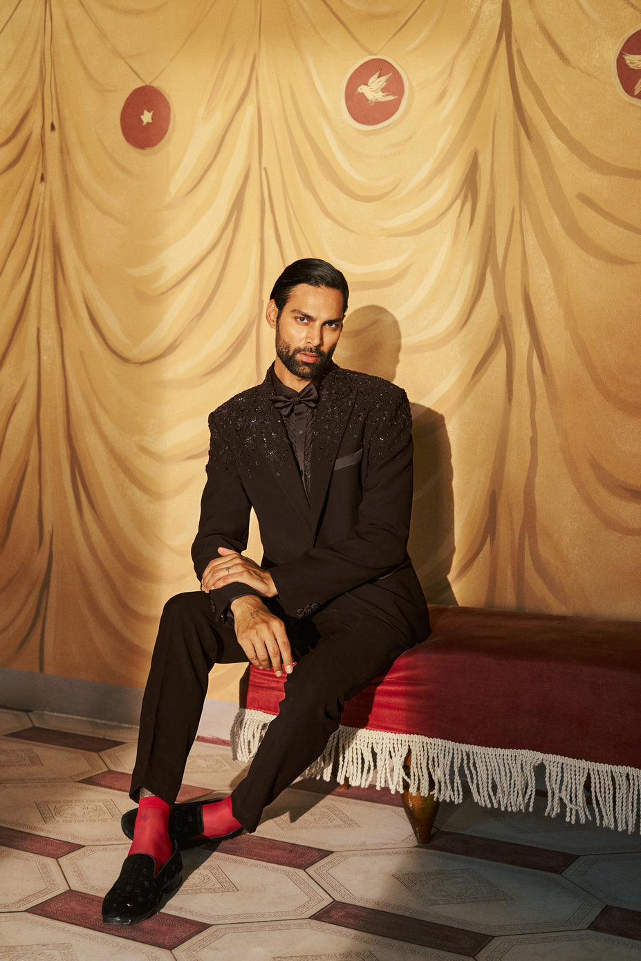 Rendered In A Deep Onyx Hue, This Classic Tuxedo Is Paired With A Black Georgette Satin Shirt, Featuring Precision Pin-Tuck Detailing And Intricate Embroidery. The Ensemble Is Elevated By A Striking 3D-Embellished Honeybee Jacket, Adorned With Tonal Embroidery And Delicate Threadwork, Creating A Sophisticated, Contemporary Statement.