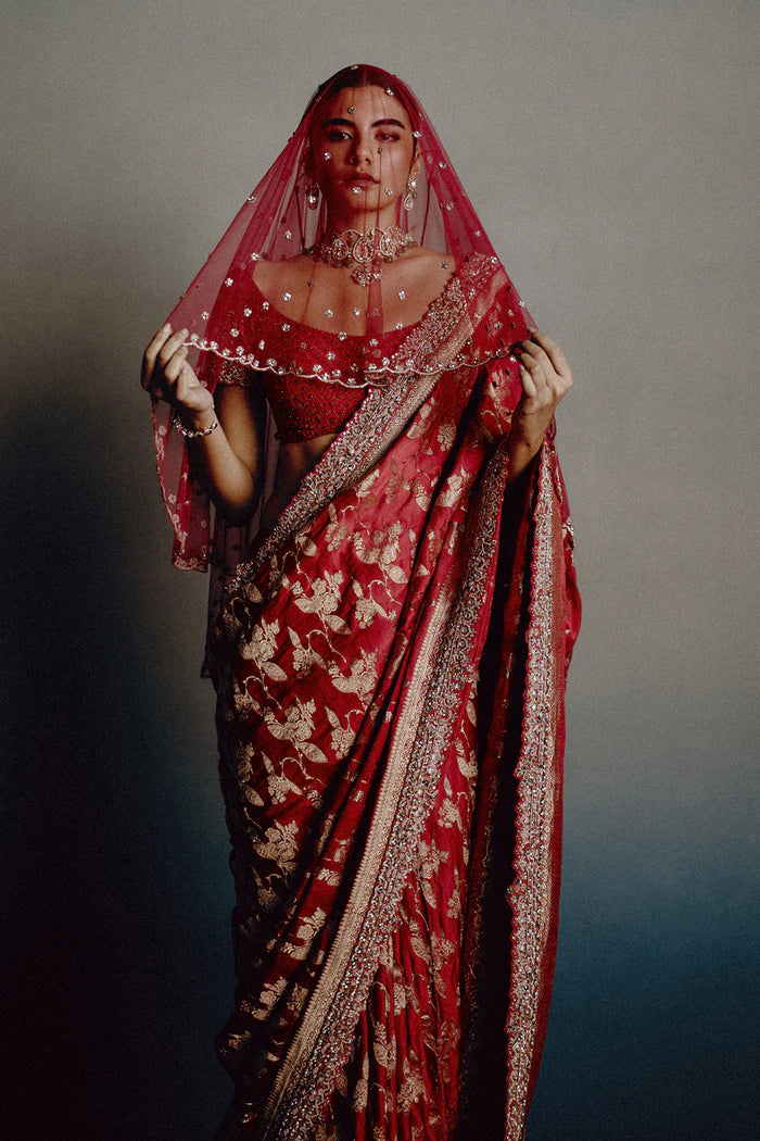 This Red Banarasi Bridal Saree Is A Celebration Of Heirloom Craftsmanship, Woven In Rich Silk With Intricate Zari Motifs And Paired With A Sculpted Couture Blouse. The Ensemble Comes With Two Veil Options—A Sheer Organza Veil For A Soft, Ethereal Finish, And A Scattered Embroidered Tulle Veil For A More Ornate Bridal Statement. A Timeless Choice For The Modern Bride Seeking Classic Grandeur With Contemporary Finesse.