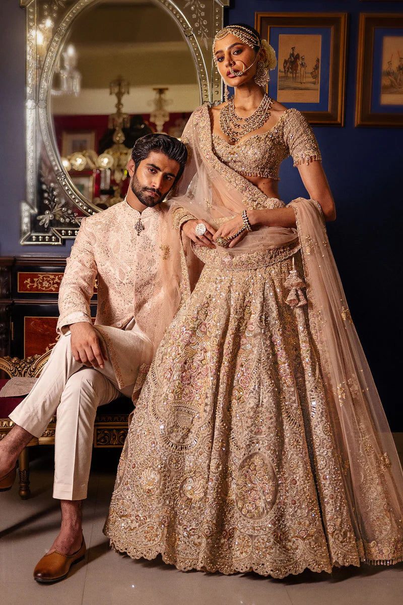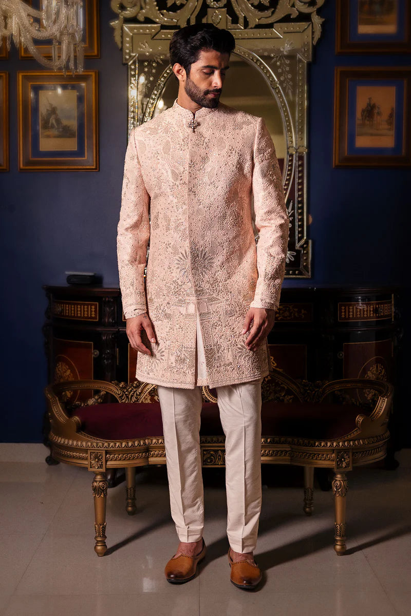 In A Serene Hue Of Pale Pink, This Raw Silk Sherwani Is Enriched With Meticulous Hand Embroidery And Woven Silk Tracery, Lending It A Quiet Regality. Complemented By A Textured Monga Silk Kurta And Tailored Aligarhi Pants, The Ensemble Bridges Traditional Detail With Modern Finesse.