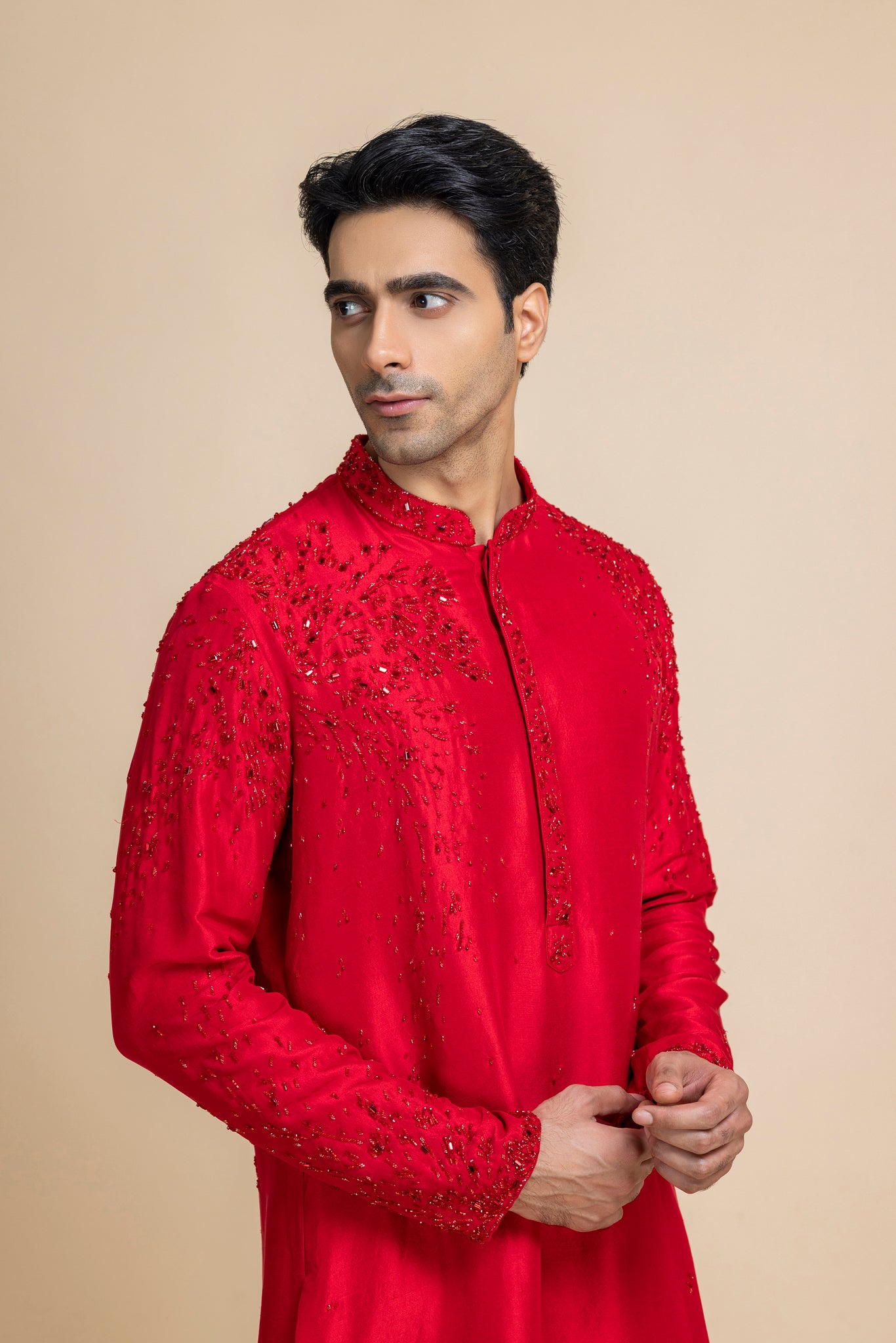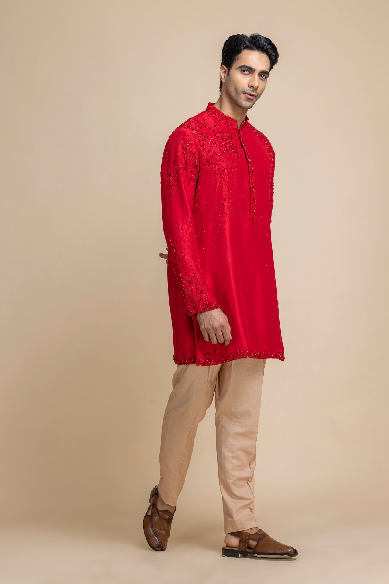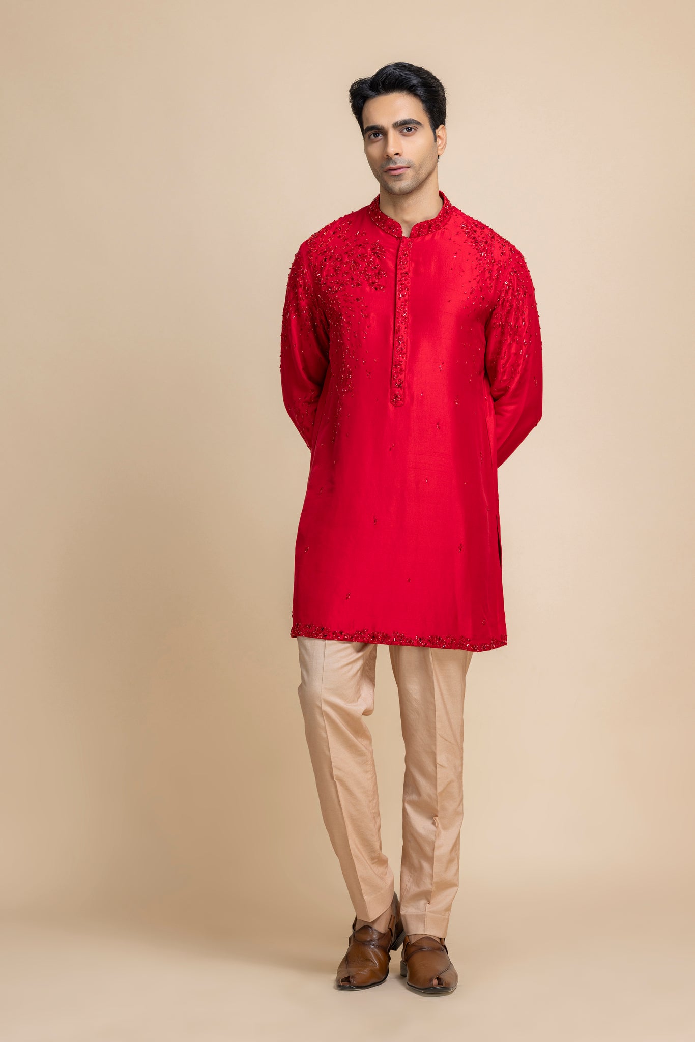 This Tonal Red Kurta, Crafted In Luxe Raw Silk For A Natural Sheen And Rich Texture. Subtle Tonal Embroidery Enhances The Neckline And Hem, Adding Understated Charm, While The Soft Beige Pants Provide A Balanced, Contemporary Silhouette. Ideal For Festive Celebrations, Casual Soirées, Or Elevated Everyday Dressing.