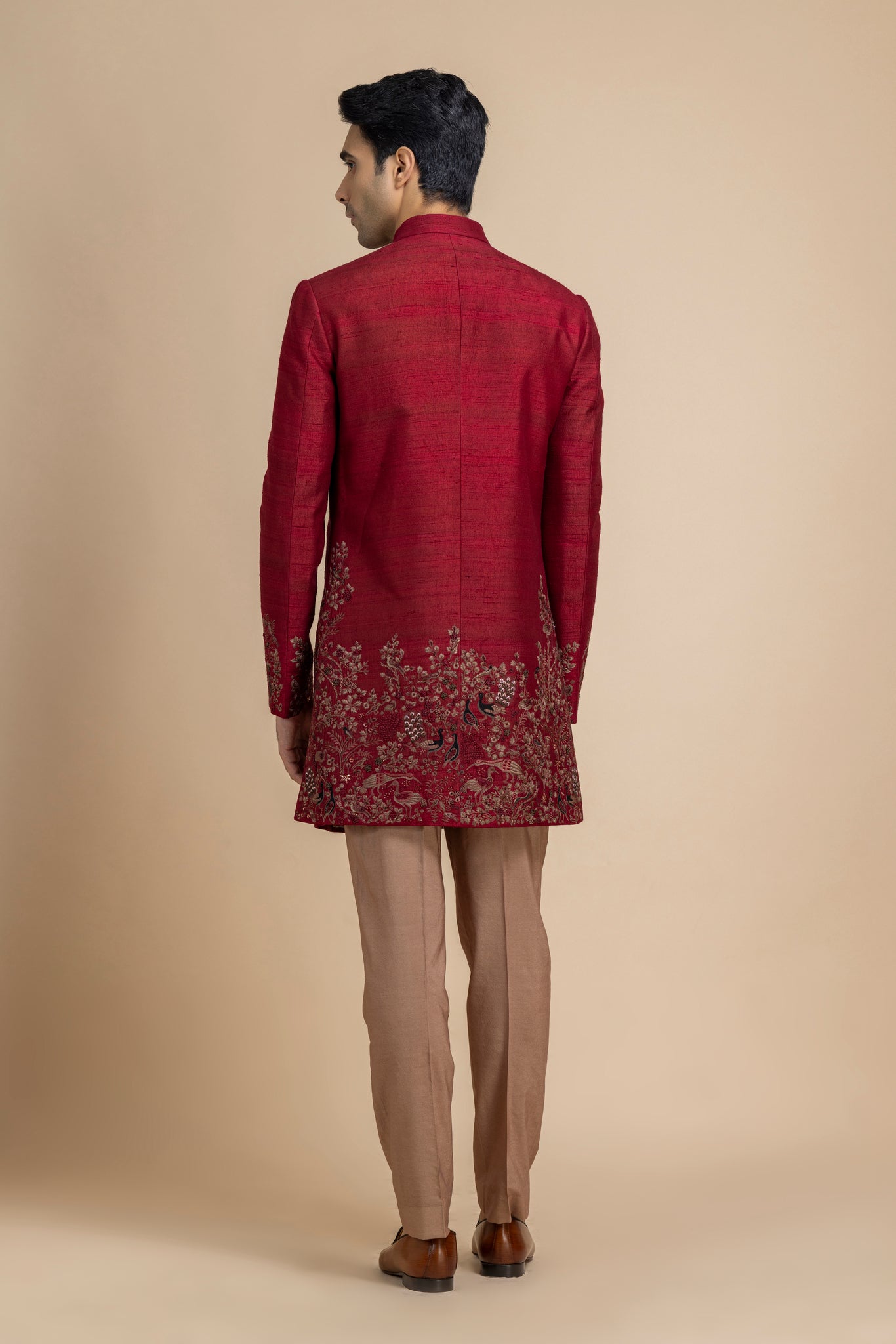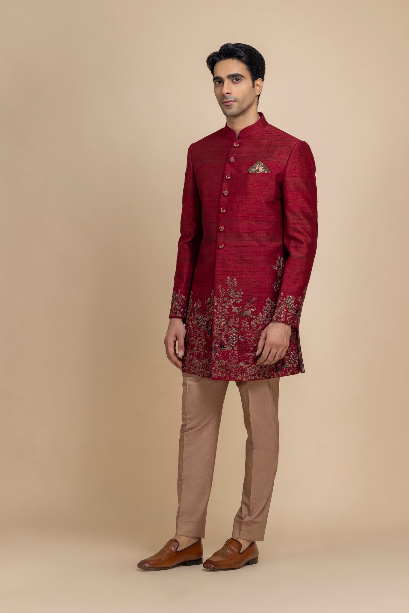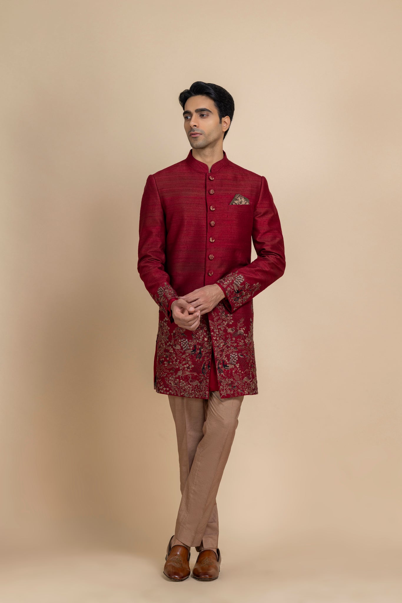 Crafted With Vintage Hand Embroidery That Tells A Story Of Timeless Artistry, This Piece Is Paired With A Beige-Brown Trouser And Accentuated With An Embroidered Pocket Square For A Refined Finishing Touch. The Handmade Buttons Details Add A Bespoke Charm, Making This Achkan Perfect For Festive Occasions, Weddings, Or Grand Celebrations. Experience A Blend Of Tradition And Contemporary Sophistication In Every Thread.