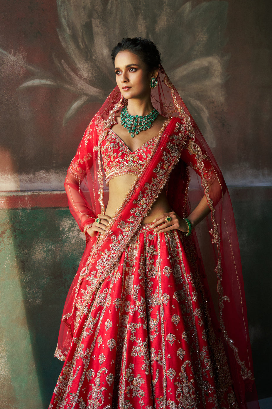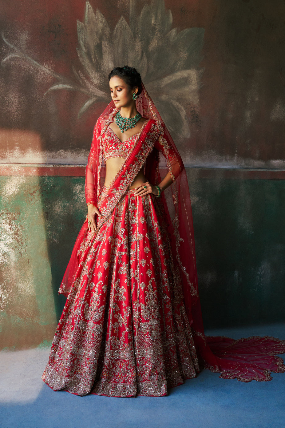 Draped In A Deep Scarlet Hue, This Bridal Lehenga Is Adorned With Heritage Handcrafted Gilded Embroidery, Echoing Regal Craftsmanship. Paired With A Sheer Tulle Dupatta And A Cascading Veil, It’S A Modern Heirloom Made For The Aisle.