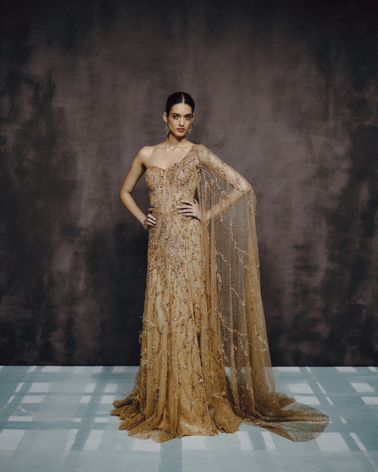 A One-Shoulder Gold Couture Gown Richly Hand-Embroidered With Sequins, Crystals, And Textured Threadwork. Paired With A Sheer Embellished Cape Sleeve That Adds Fluid Drama, The Silhouette Falls Into A Soft, Structured Flare—Perfect For Receptions, Cocktail Nights, And Modern Bridal Soirées.