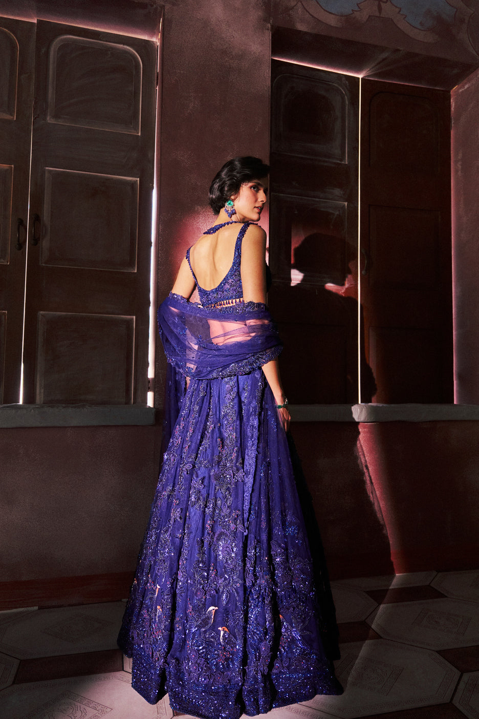In A Captivating Midnight Indigo Shade, This Lehenga Set Is Enriched With Elaborate Dori Embroidery And Dimensional 3D Details. The Flowing Tulle Dupatta With Tassels Completes This Refined Look, Effortlessly Blending Classic Charm With Contemporary Flair.
