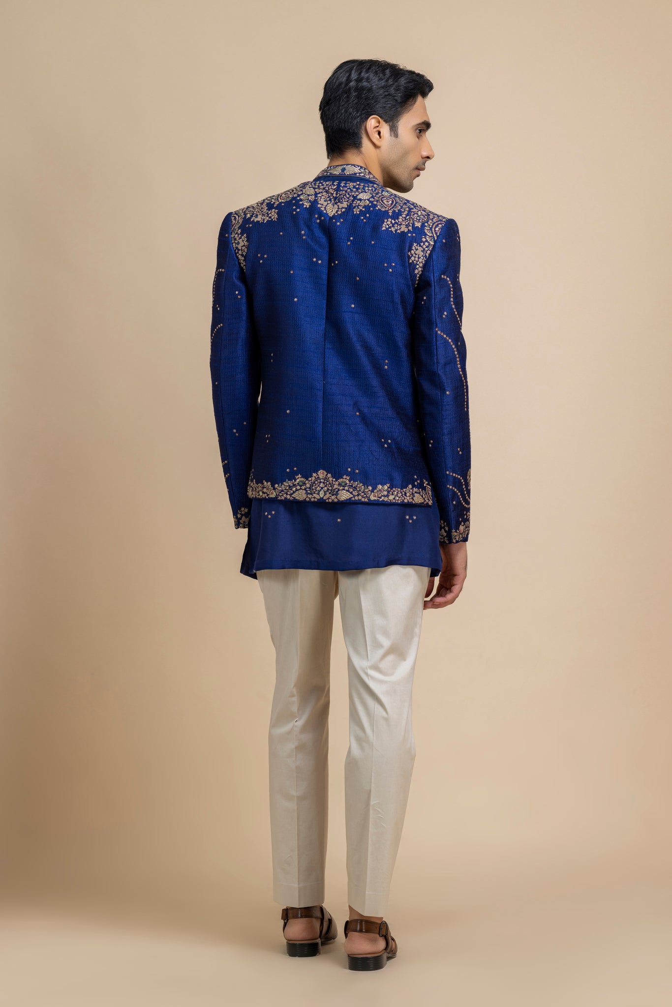 "This Royal Blue Raw Silk Jacket, Intricately Hand-Embroidered With Artisanal Threadwork, Is Paired With A Dupion Silk Kurta And Cotton Silk Trousers. The Ensemble Exudes Refined Craftsmanship And Contemporary Elegance, Making It Perfect For Weddings, Festive Soirées, Or Evening Celebrations."