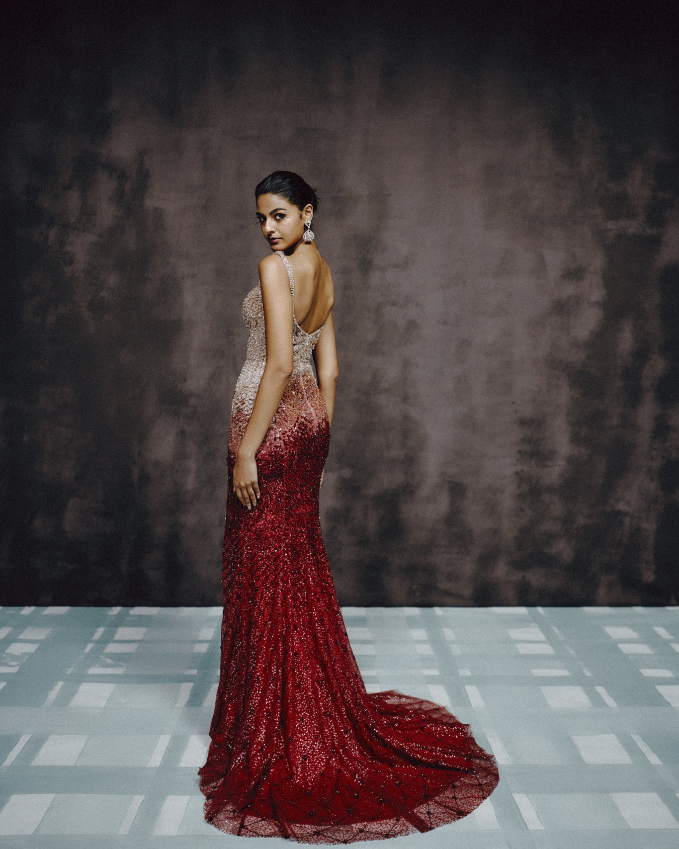 A Stunning Gradient Couture Gown Transitioning From Champagne Sparkle To Deep Crimson. Hand-Embroidered With Sequins, Crystals, And Tonal Beadwork, The Fitted Silhouette Features A Thigh-High Slit For Added Drama. A Modern, Sculpted Evening Look Crafted For Receptions, Cocktails, And Elevated Red-Carpet Moments.