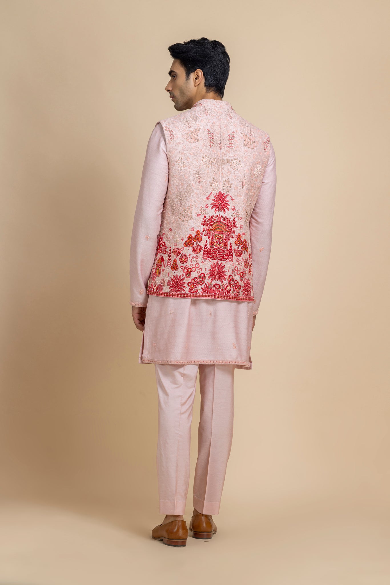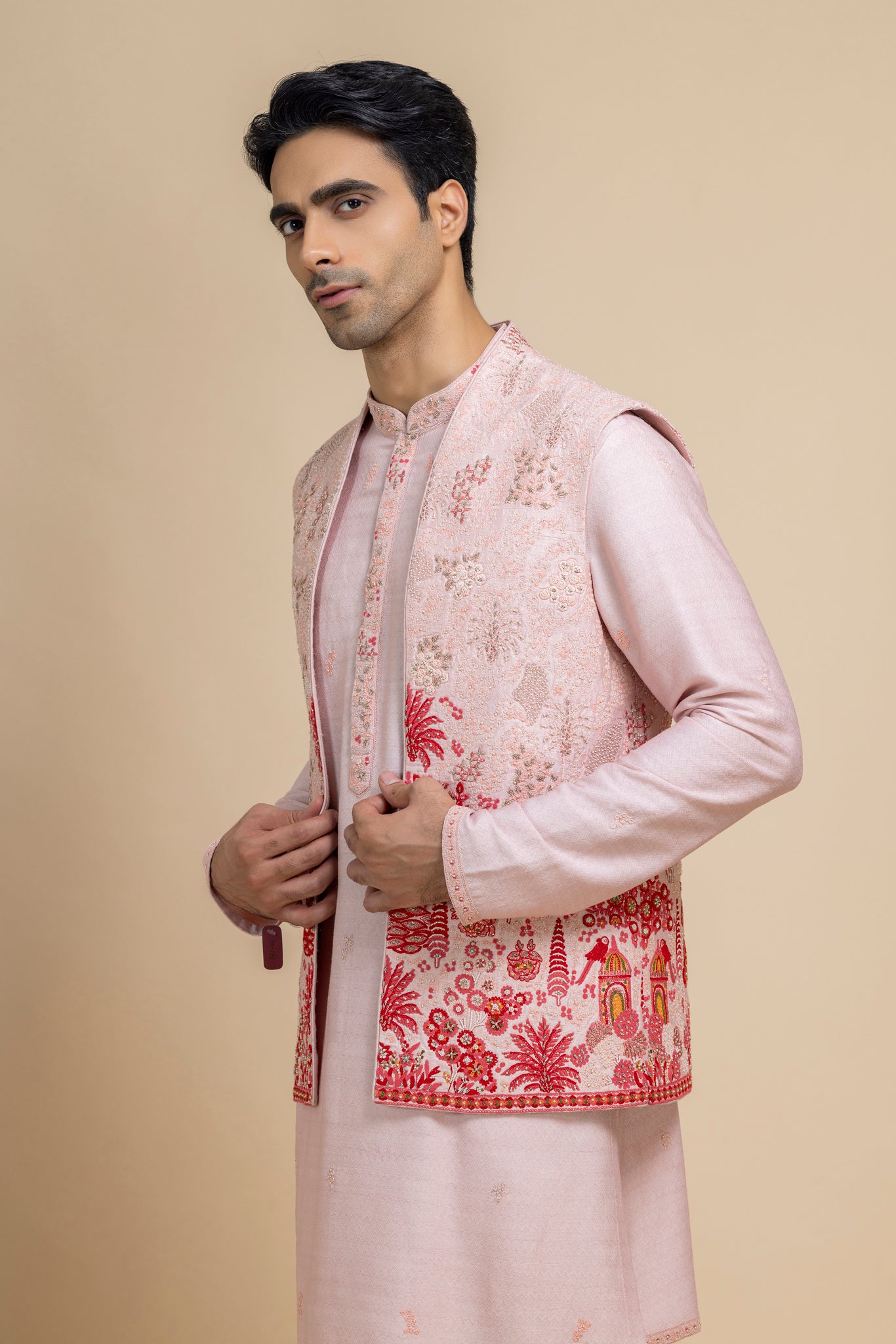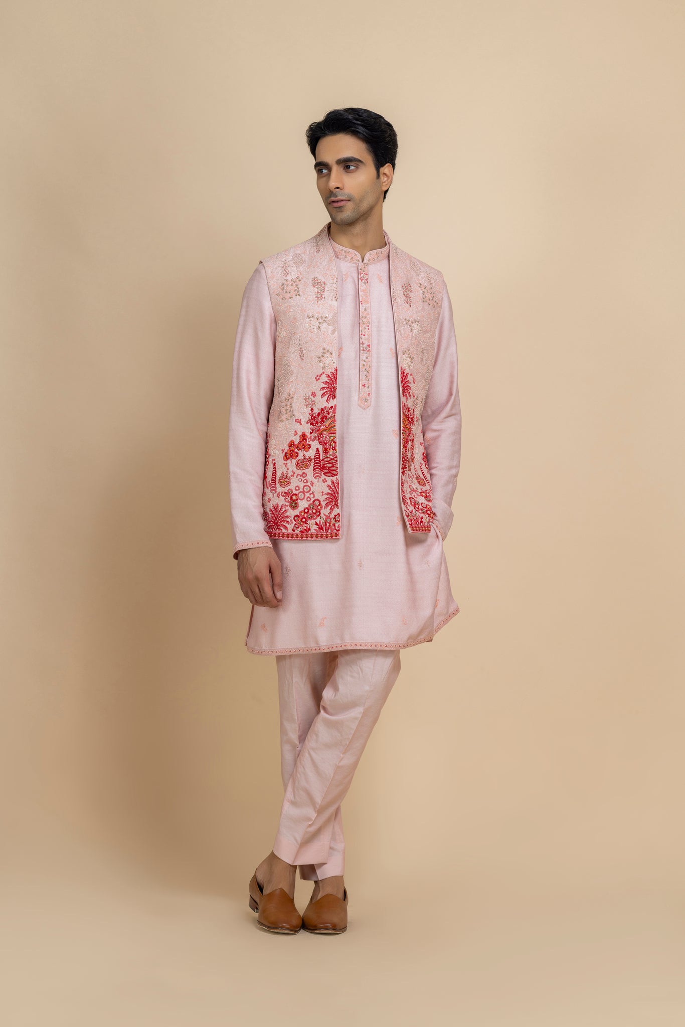 "This Blush Pink Bundi And Kurta Pant Set Exudes Understated Elegance, Featuring A Raw Silk Embroidered Jacket Layered Over A Dupion Silk Kurta And Cotton Silk Trousers. Intricate Hand Embroidery Adds Artisanal Charm, Making This Ensemble A Perfect Blend Of Traditional Craftsmanship And Contemporary Sophistication — Ideal For Weddings, Festive Celebrations, Or Evening Soirées."