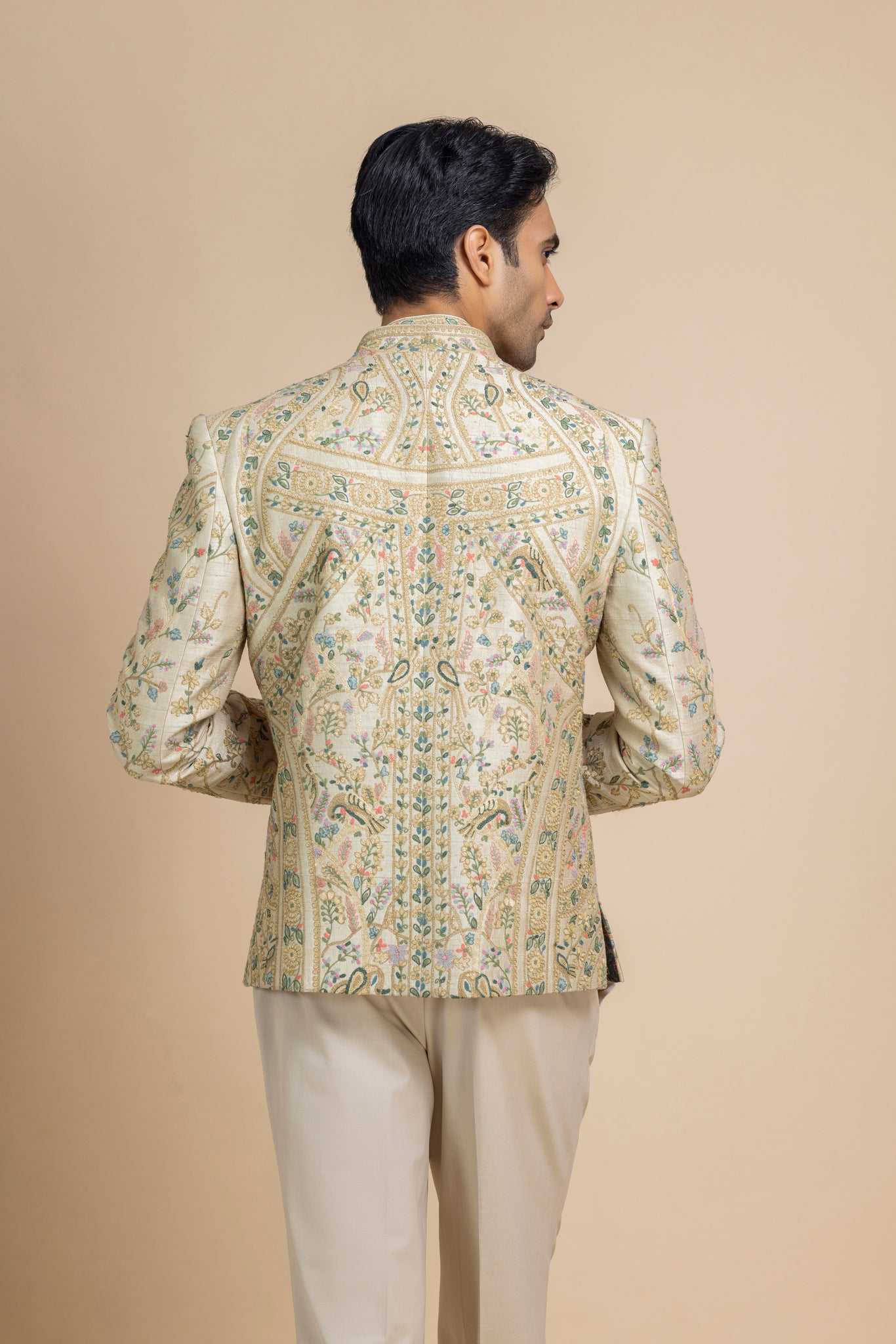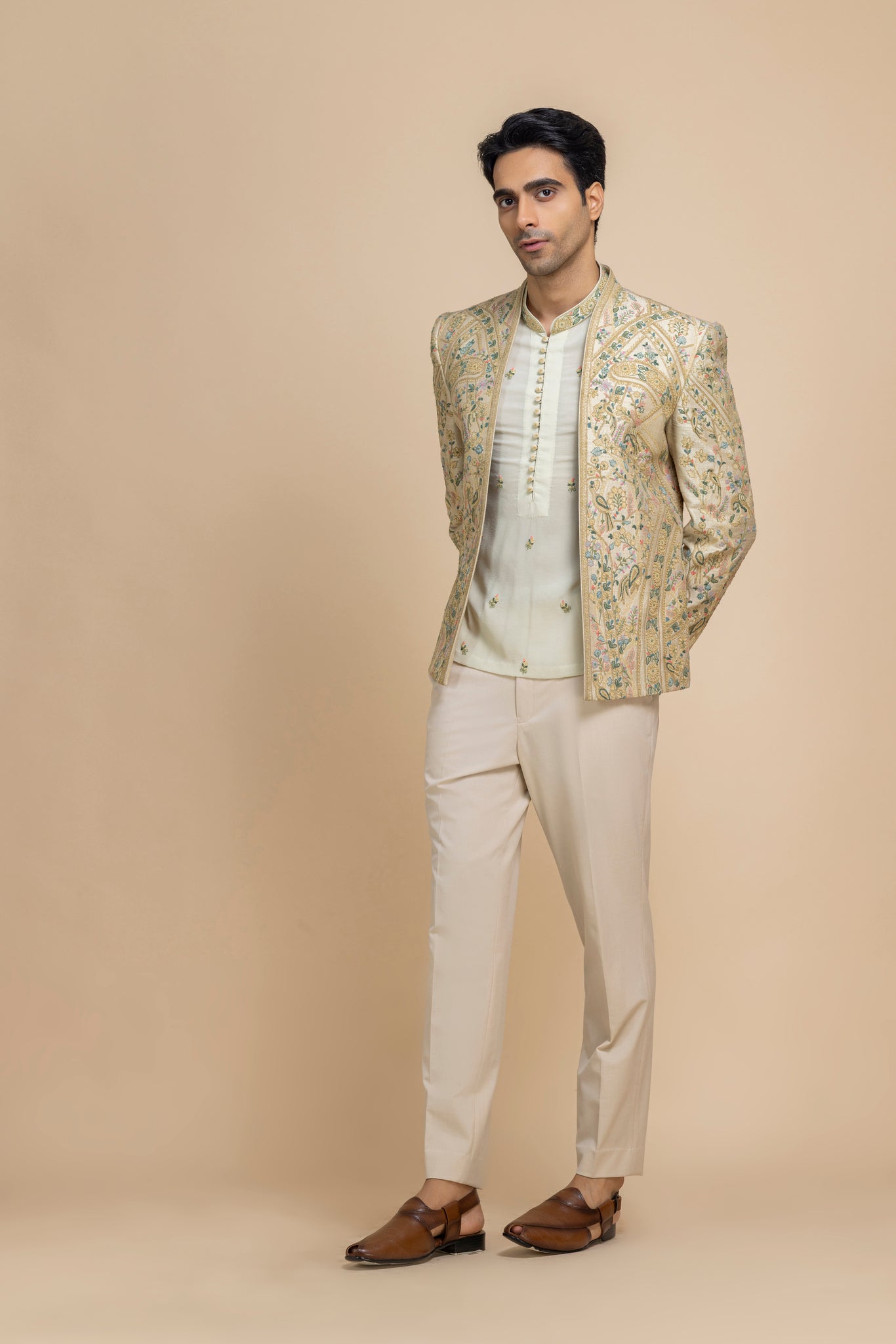 "This Pistachio Green Raw Silk Jacket Is Exquisitely Hand-Embroidered With Intricate Motifs, Paired With A Fluid Crepe Shirt And Soft Cotton Silk Trousers. The Ensemble Exudes Refined Craftsmanship And Understated Elegance — Perfect For Festive Occasions, Weddings, Or Sophisticated Evening Gatherings."