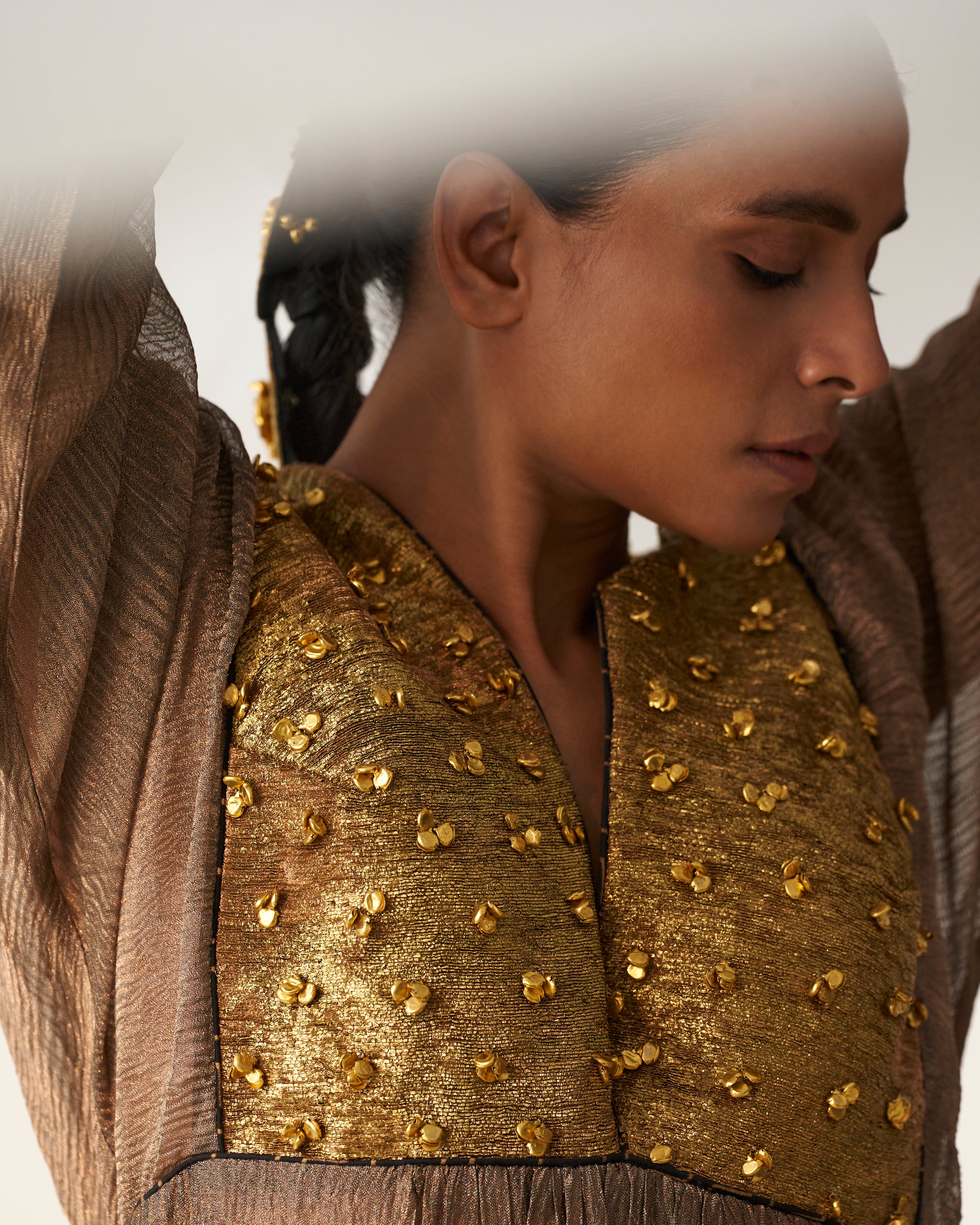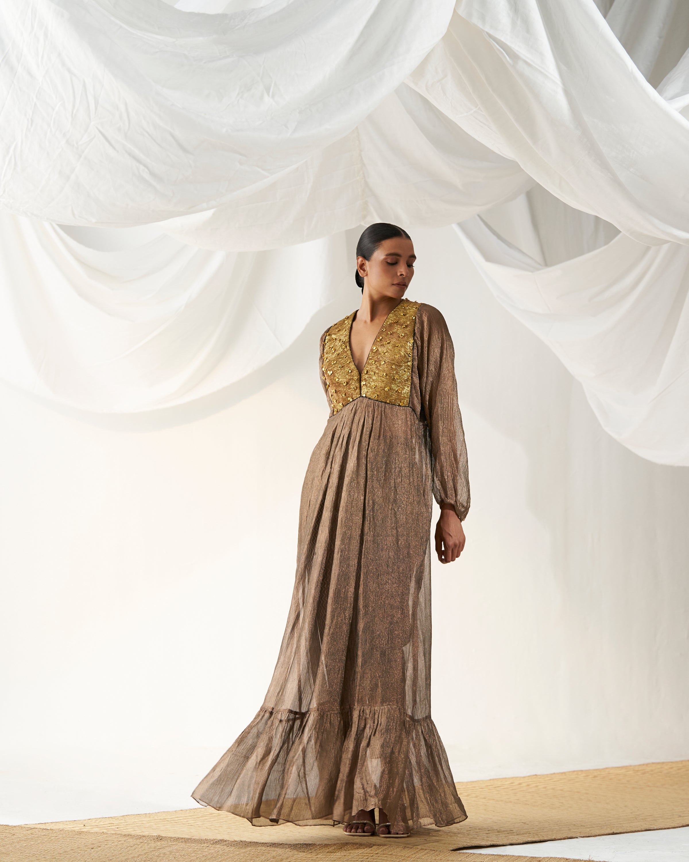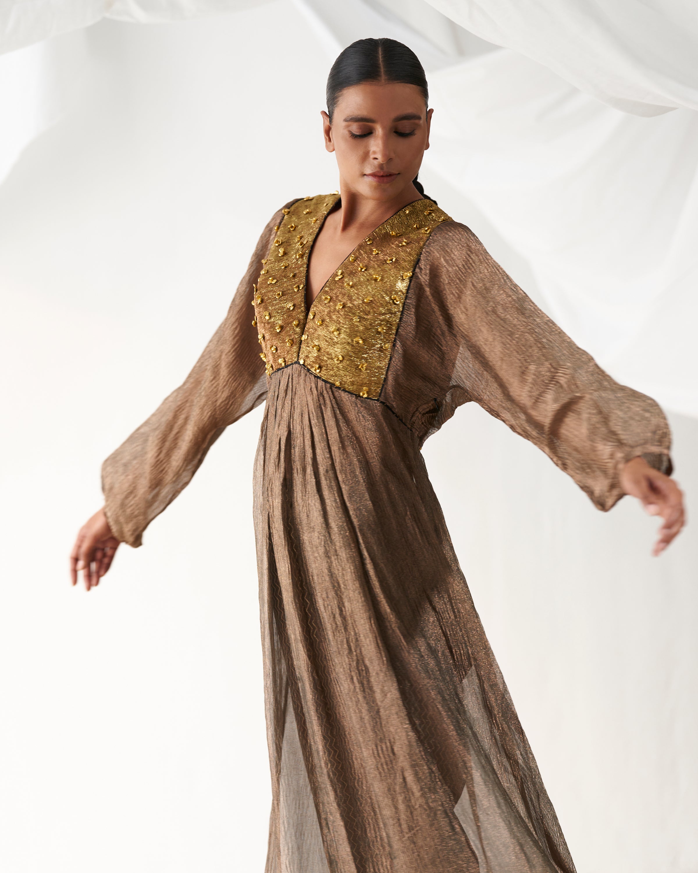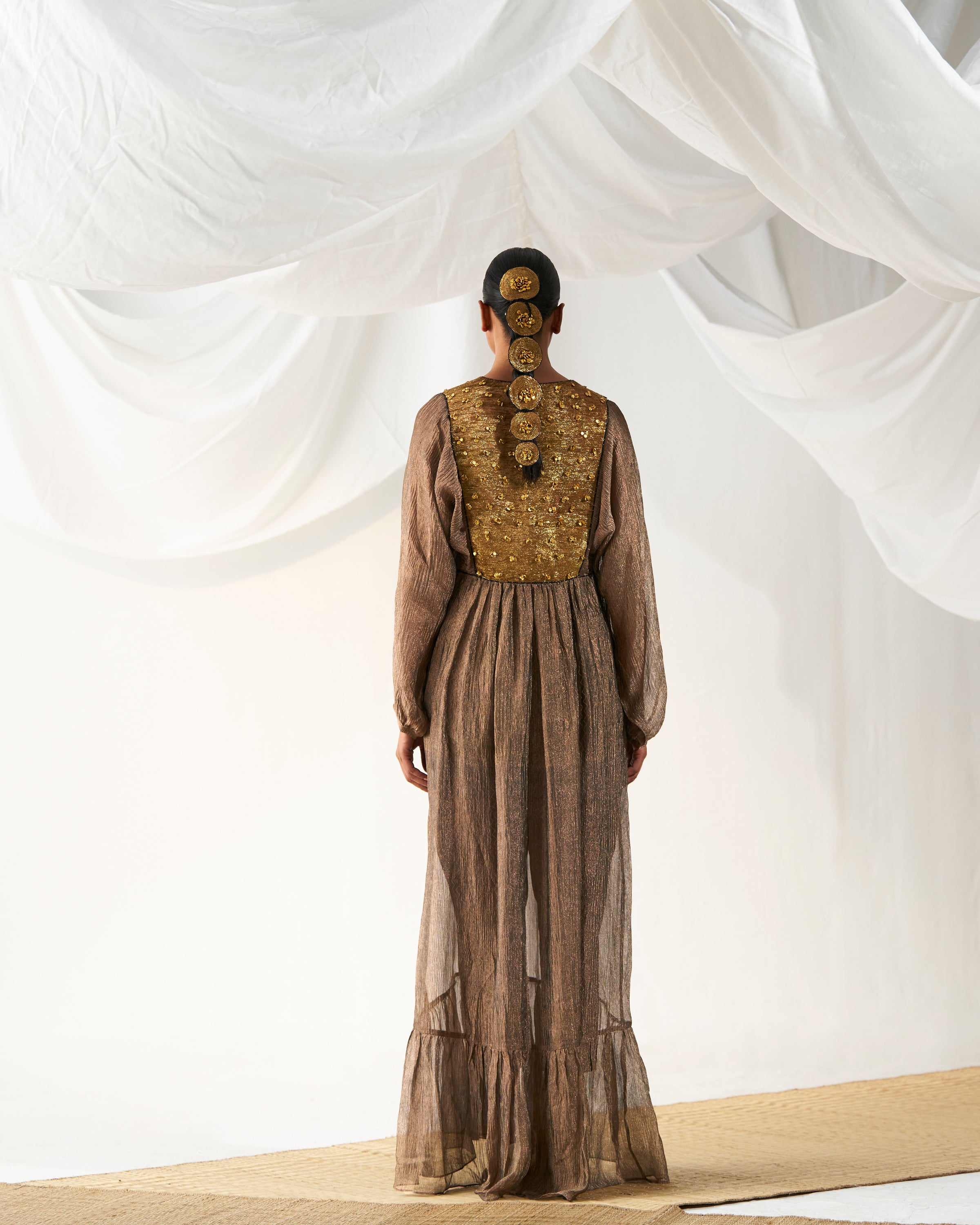 Black long dress with balloon sleeves and gathering on bottom which has intricated antique embroidery on bodice