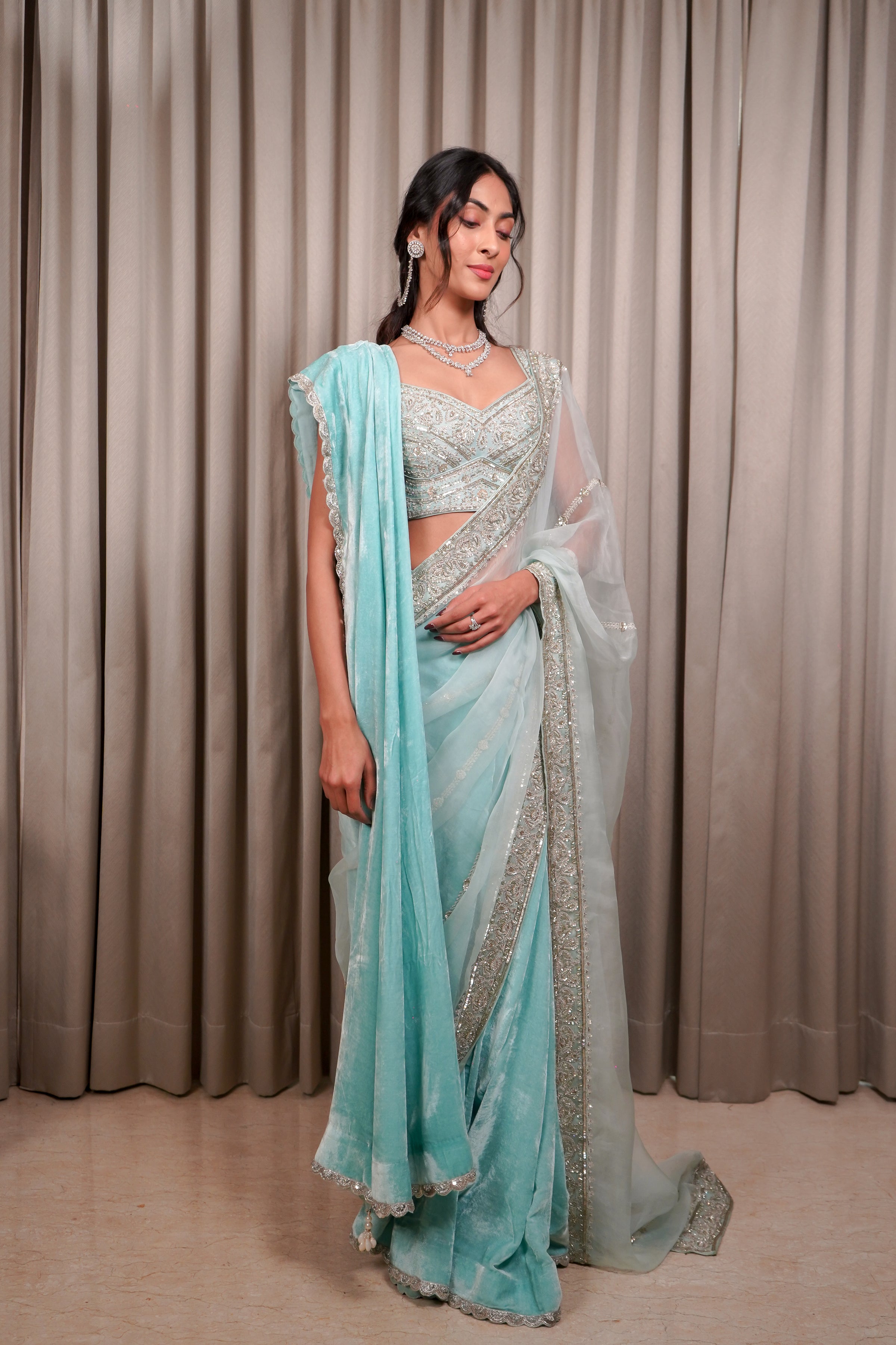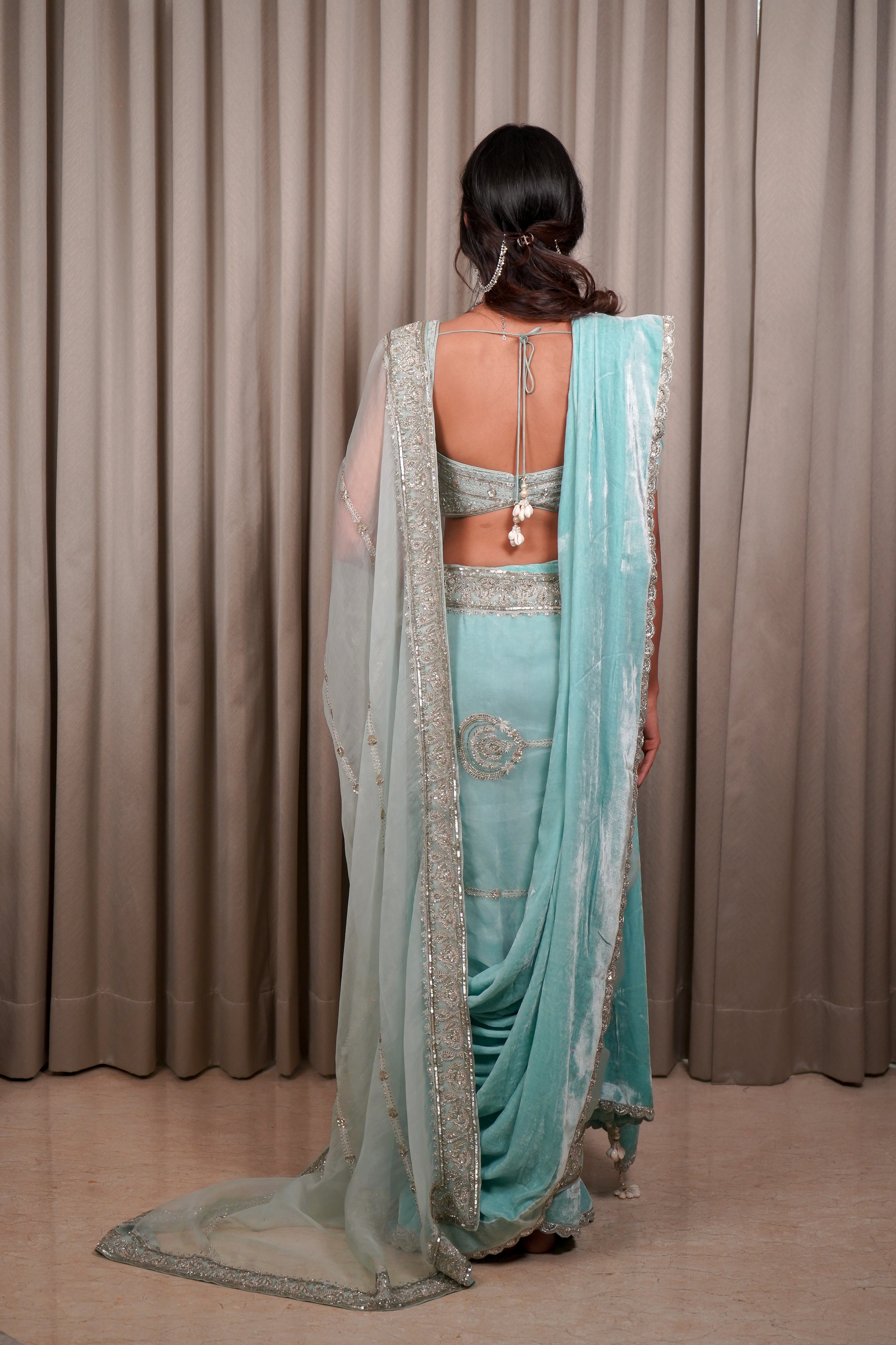 This Product consists of velvet saree paired with chanderi blouse featuring heavily embellished with Badla with sequins.It is paired with Organza Dupatta.Paired with Peticot.
