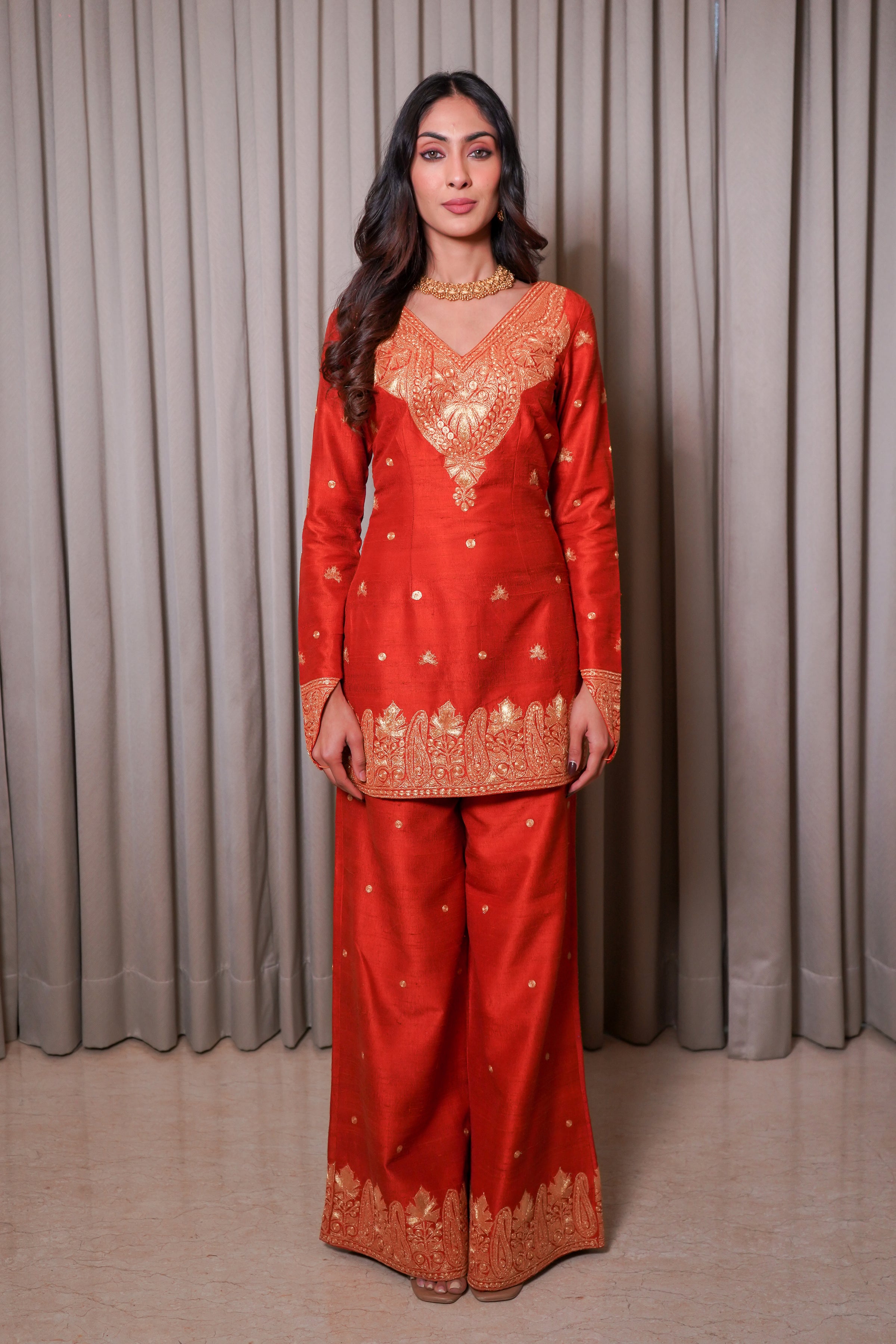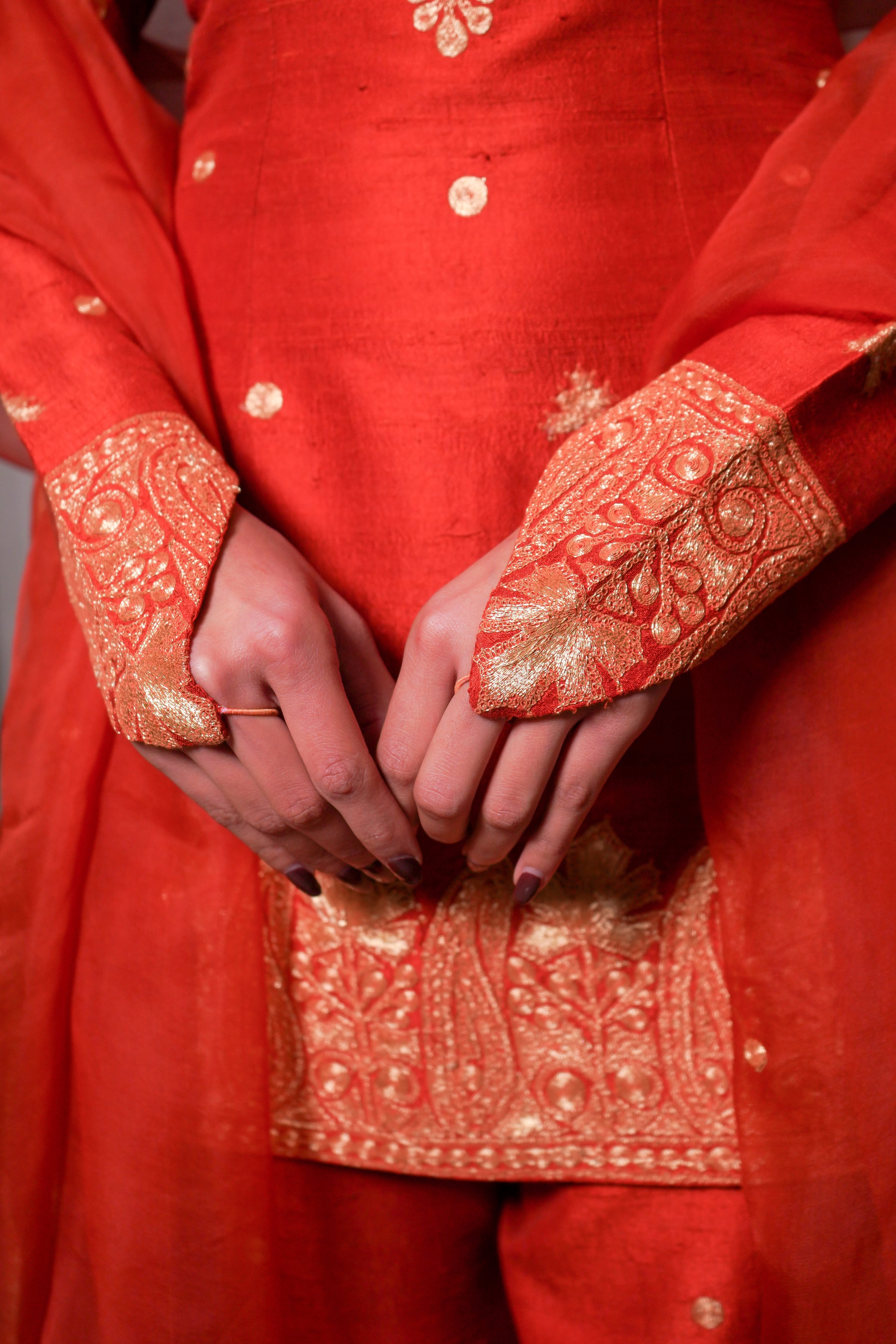 This Product Consists of Raw silk base Kurta embellished with Kashmiri work. It is Paired with Pant and Organza Dupatta .