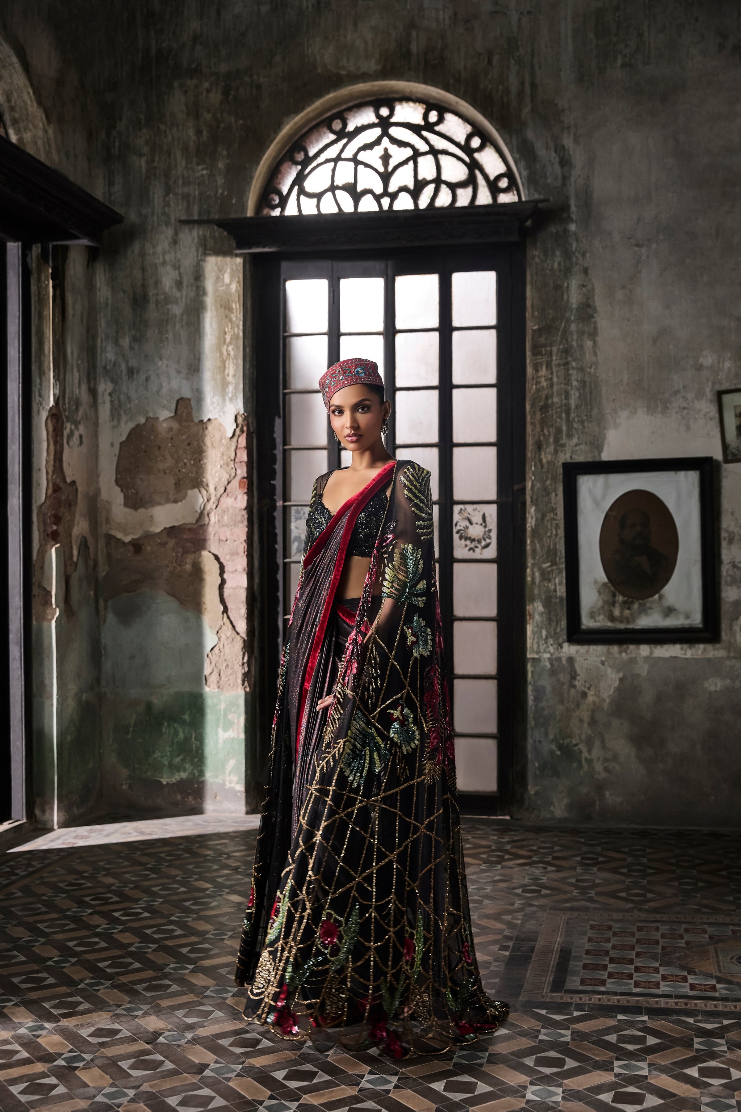 Black Foil Pre-Stitched Drape Sari With Hand Embroidered Cape and Blouse