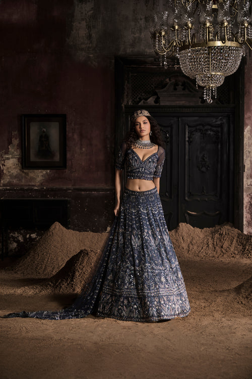 Navy Blue Organza Lehenga With Threadwork Blouse and Dupatta