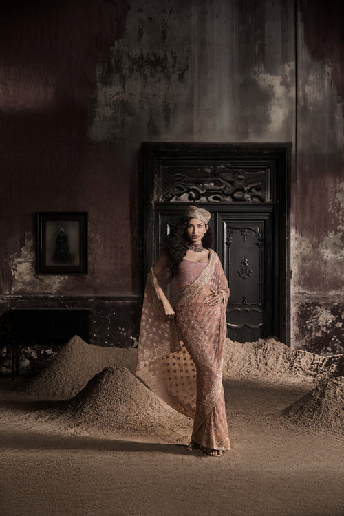 Peach Pre-Stitched Tulle Sari With Crystal Embellished Blouse