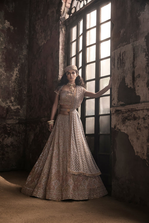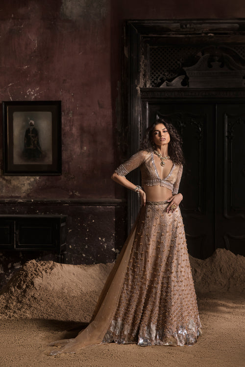 Nude 3D Petal Organza Lehenga With Hand Embroidered Blouse and Dupatta