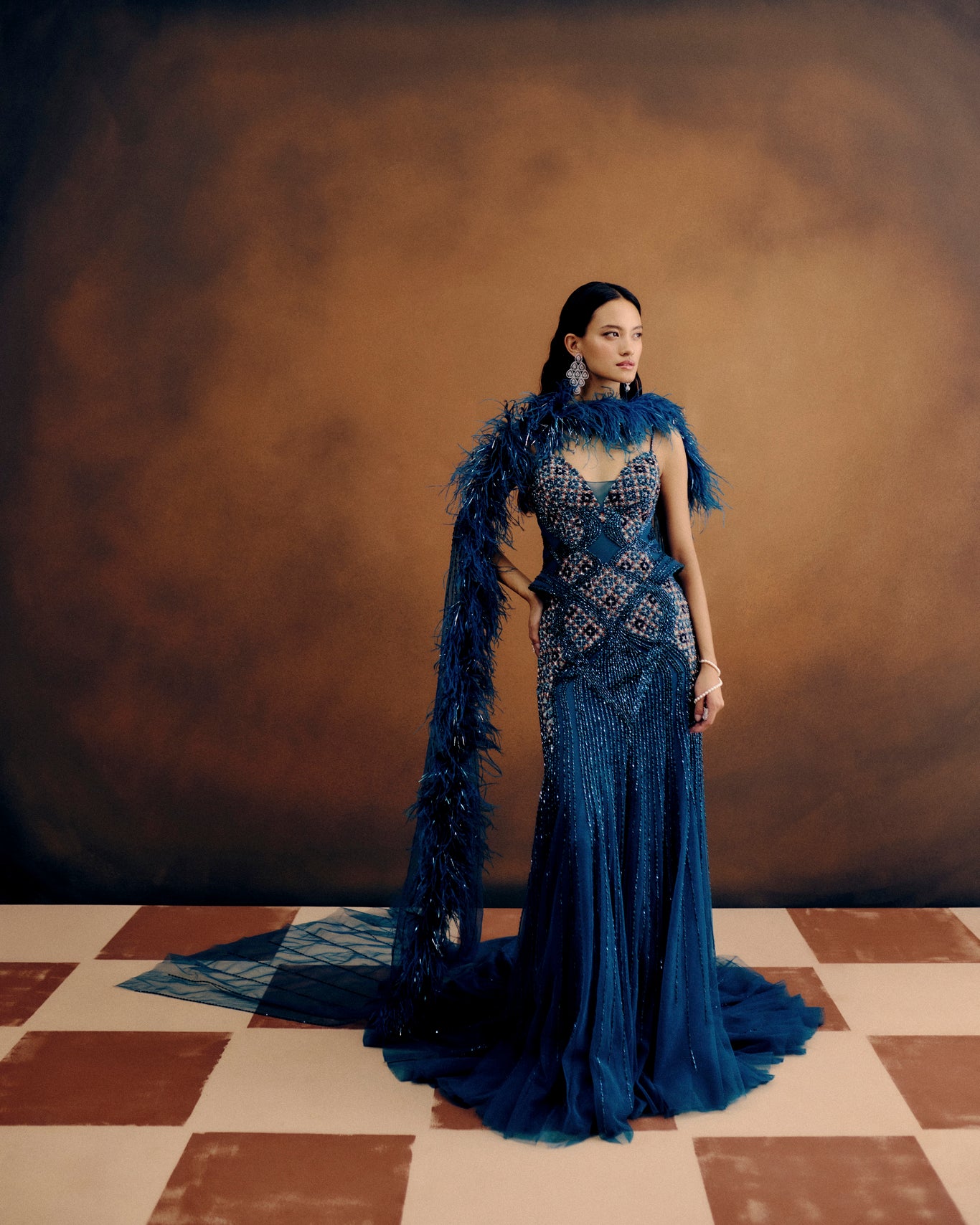 An Exquisite Hand-Embroidered Gown In Deep Teal, Encrusted With Crystals And Intricate Beadwork That Catch Light With Every Movement. Sculpted To Perfection, It Features A Dramatic Feather-Accented Drape And A Sheer Train, Merging Couture Artistry With Cinematic Grandeur.