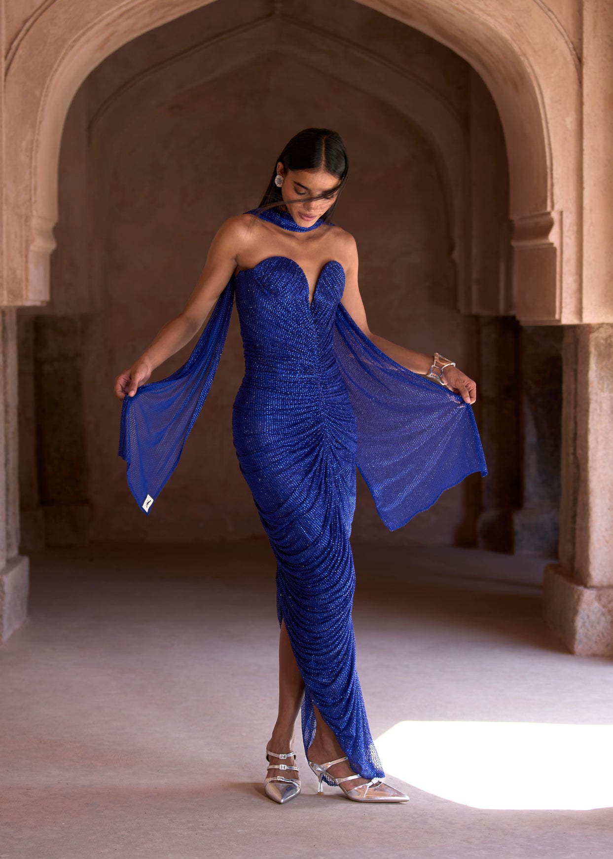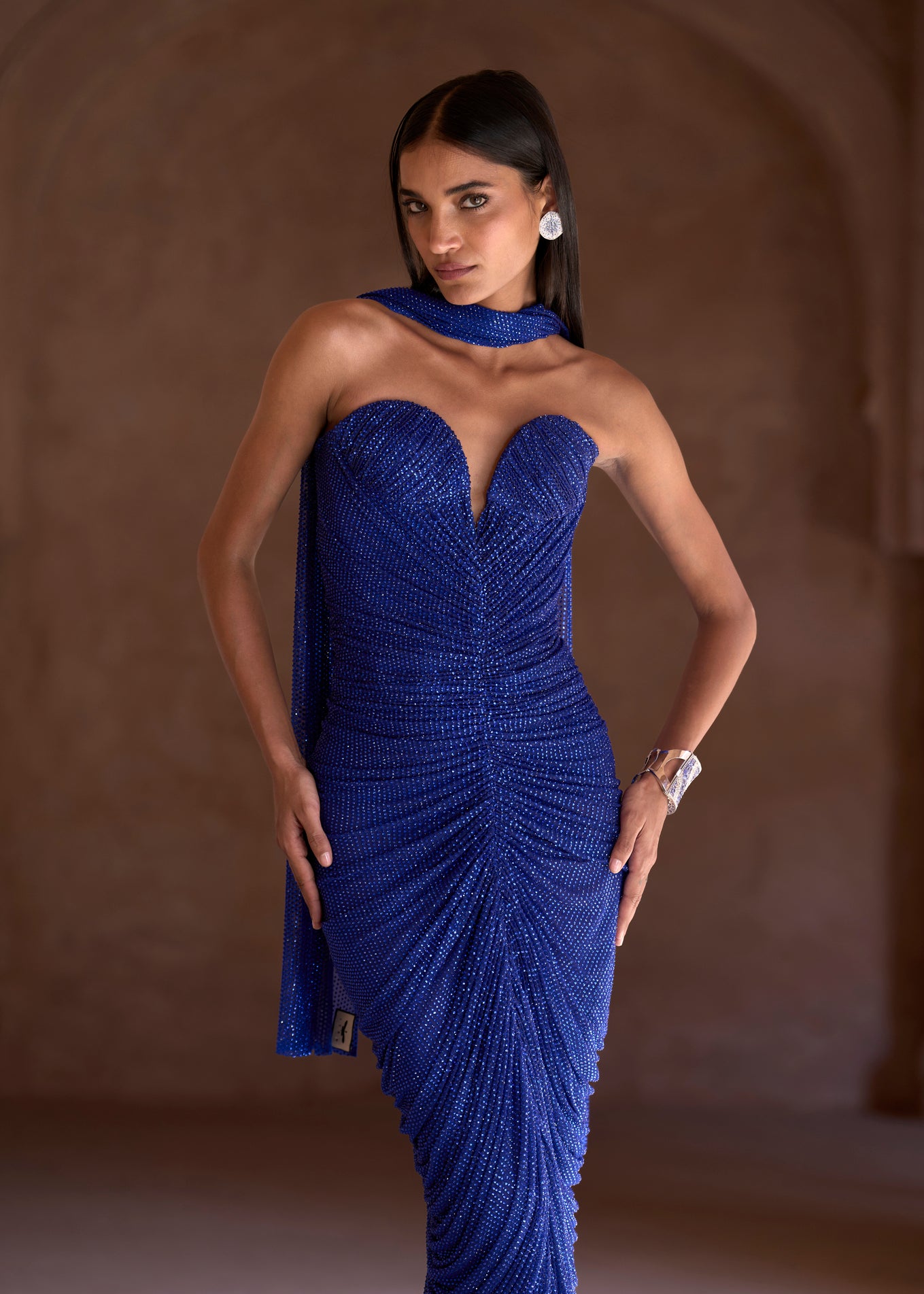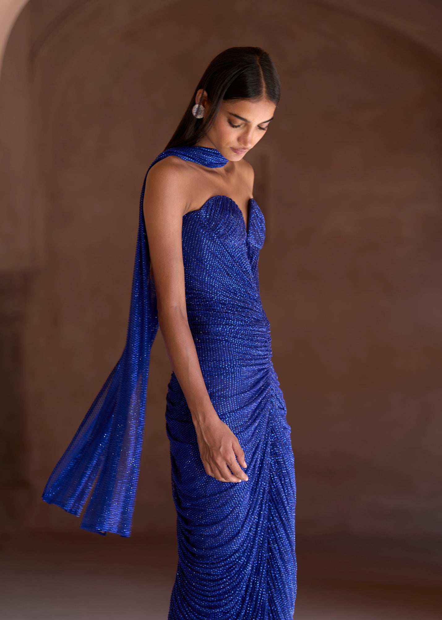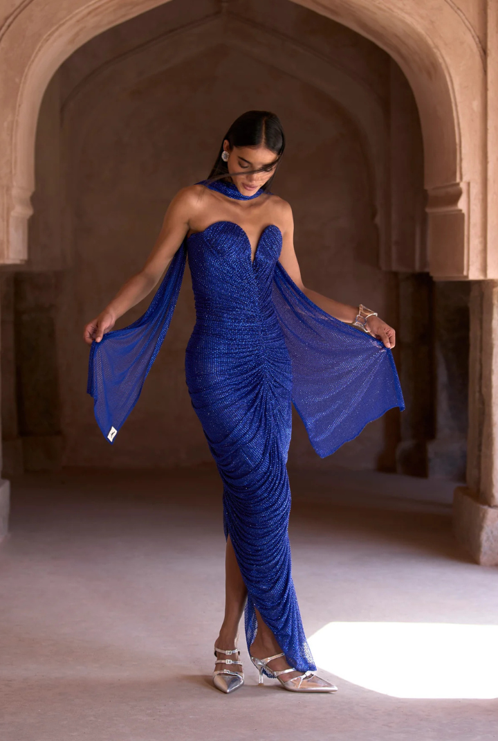 Crystal-embellished electric blue ruched gown with an attached corset, paired with a matching stole.