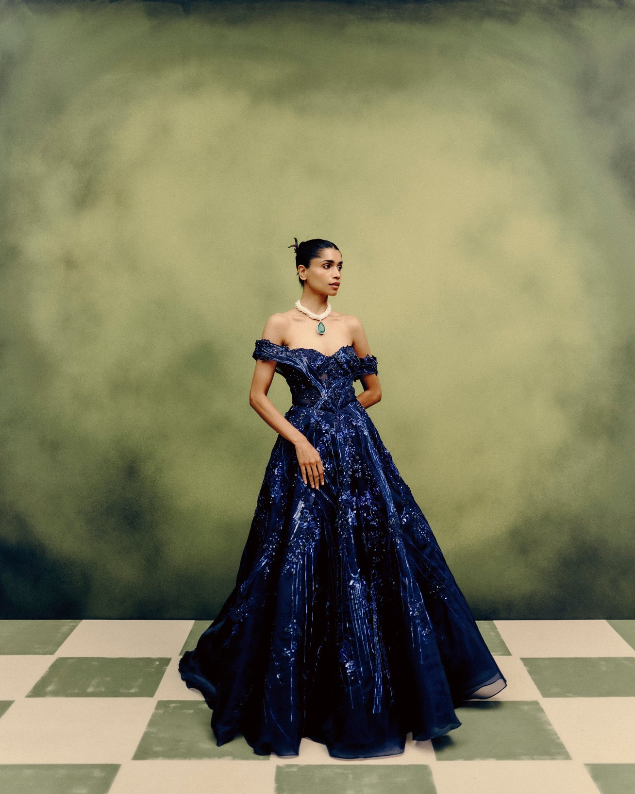 A Vision Of Deep Allure, This Neon Navy Ball Gown Is Exquisitely Hand Embroidered, With Each Stitch Echoing A Refined Artistry. The Organza Neckline Detailing Adds An Airy Elegance, Framing The Silhouette With Sculptural Grace And Modern Couture Sophistication.