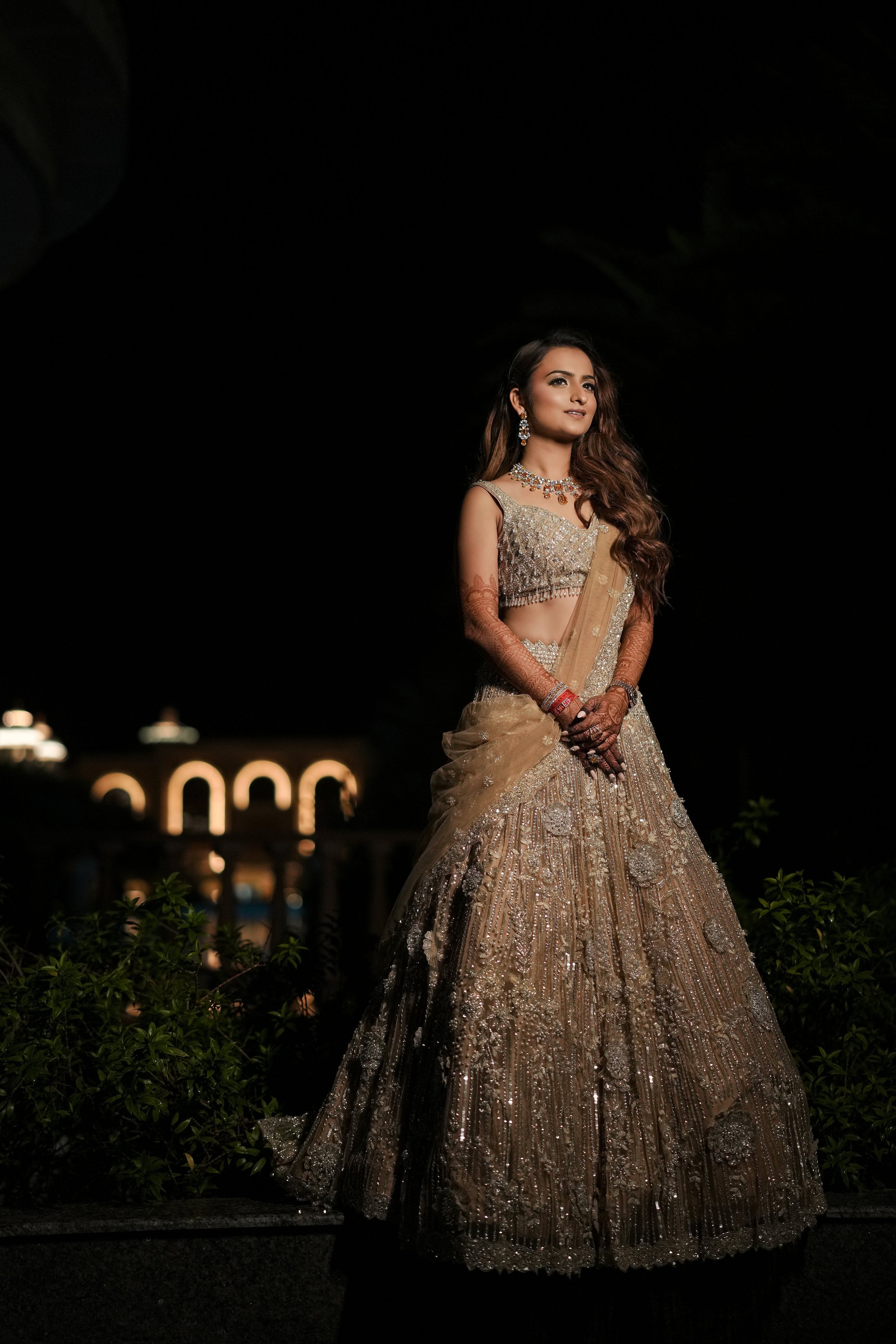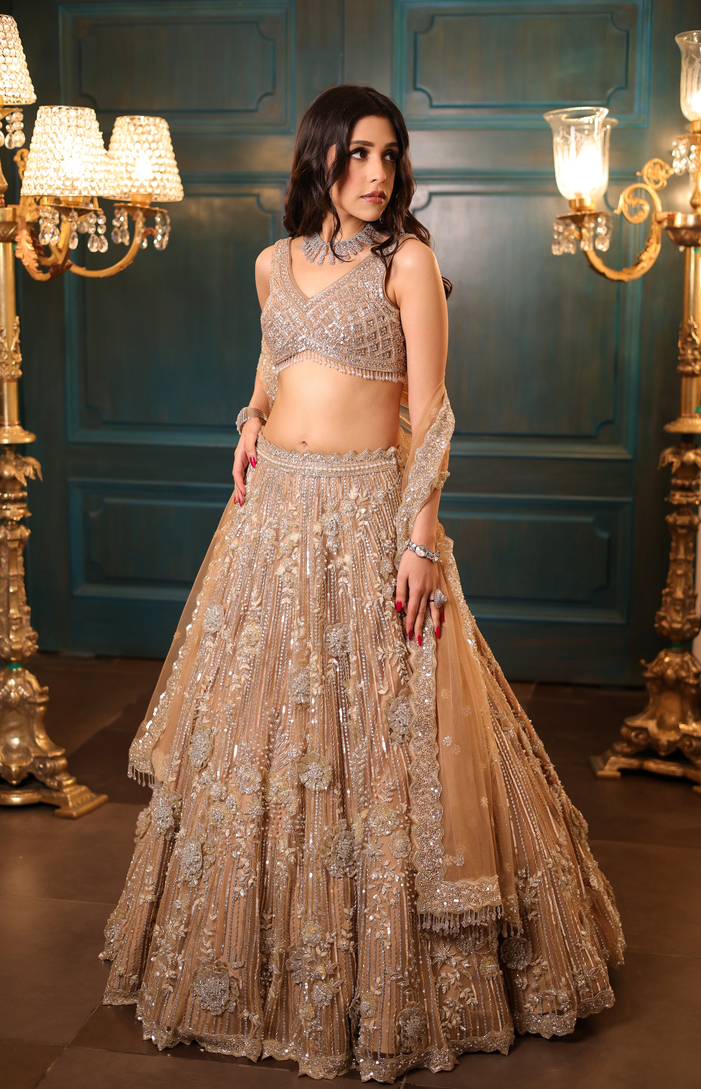 This gold lehenga features hand embroidered 3D flowers throughout along with sequin,crystal, pearl and cutdana embroidery. It is paired with a matching embroidered V neck blouse detailing,and an embroidered dupatta.