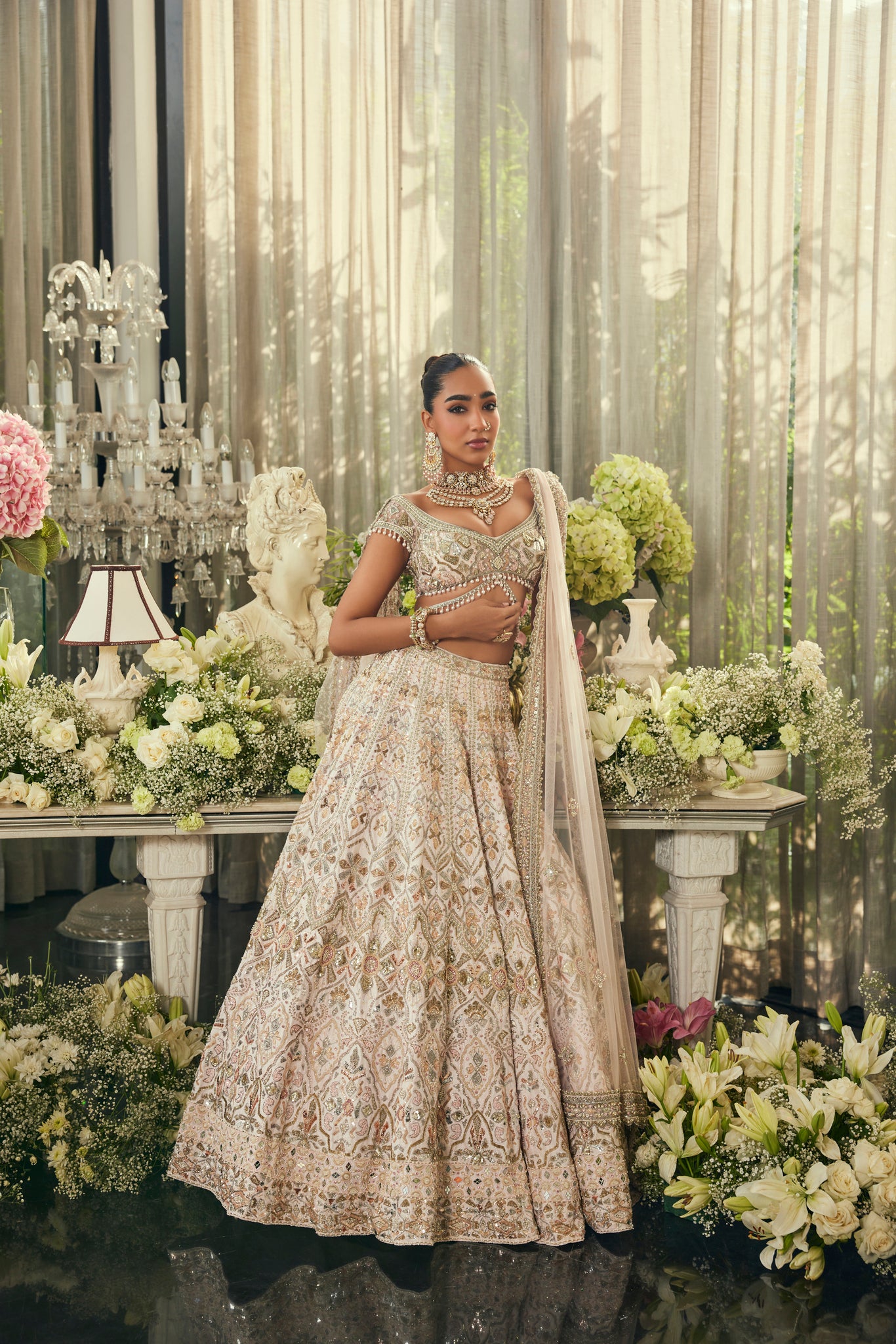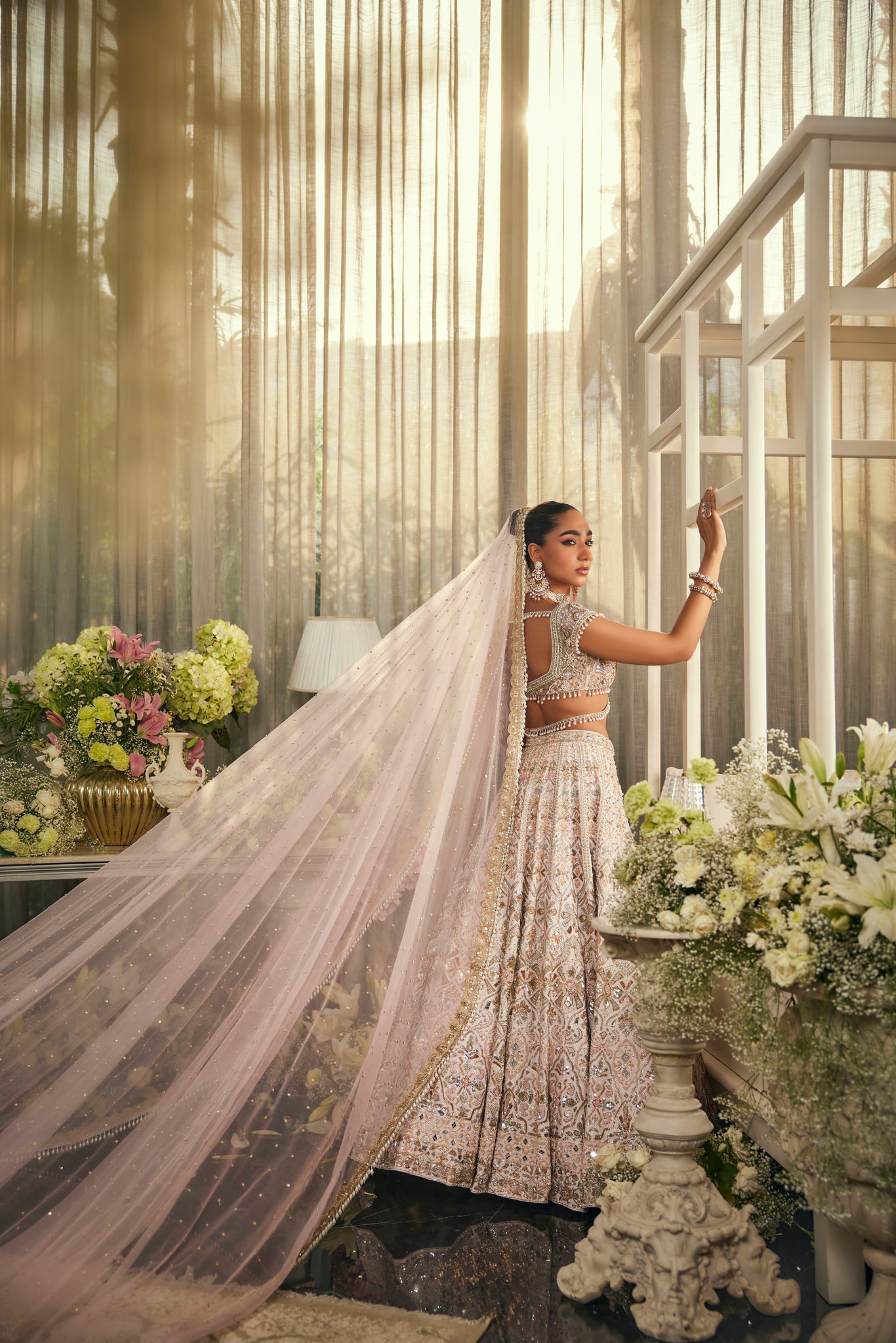 This blush pink lehenga set features multicolour embroidery with a mix of sequin, crystal, beads, stones, zardozi and thread embroidered. Paired with a delicate elbow-sleeve blouse with tassel detailing and matching embroidered dupatta. A second dupatta or veil is available on request
