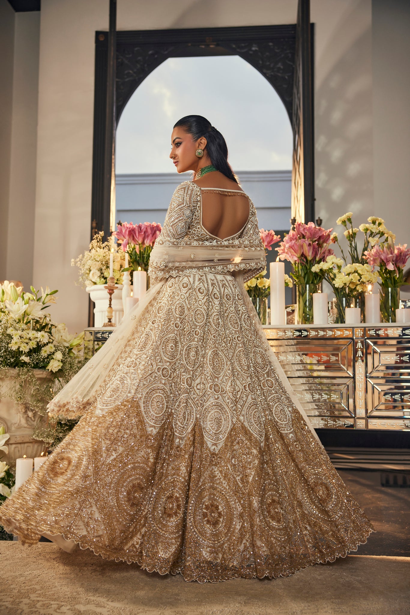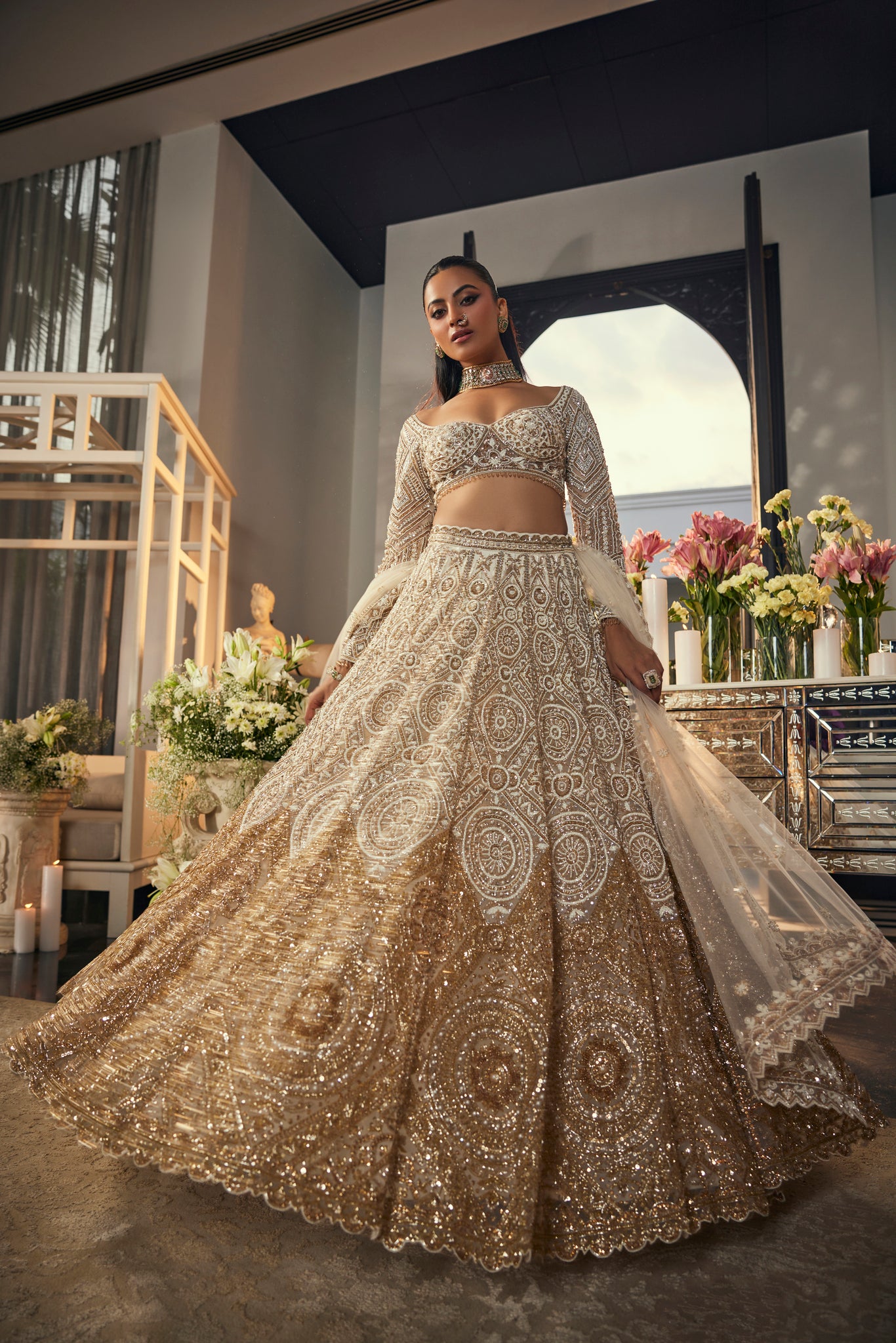 Ethereal ivory and gold shaded lehenga with all over geometric motifs. The outfit features sequin, crystal cutdana and pearl embroidery with a matching full sleeves blouse and embellished dupatta.