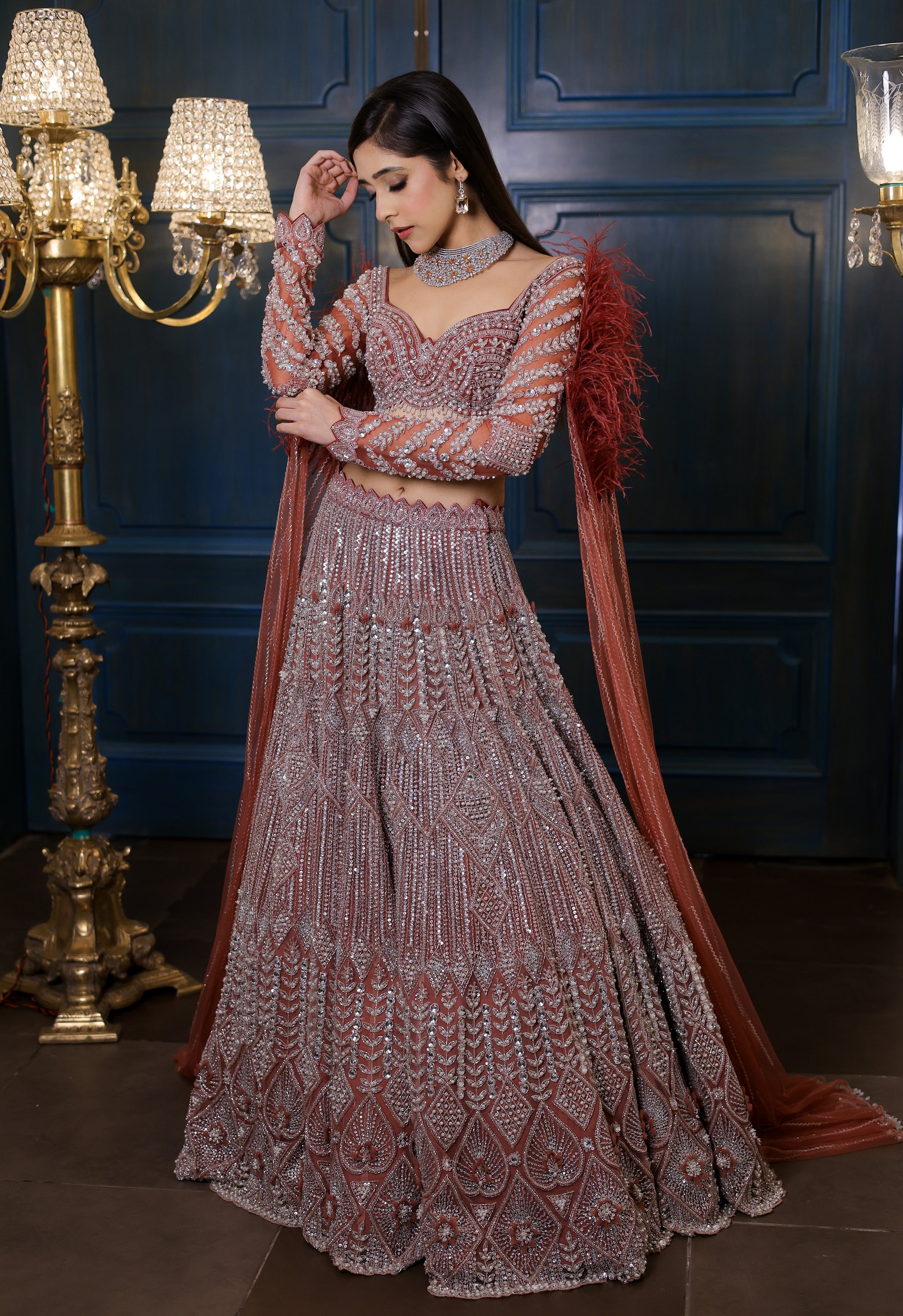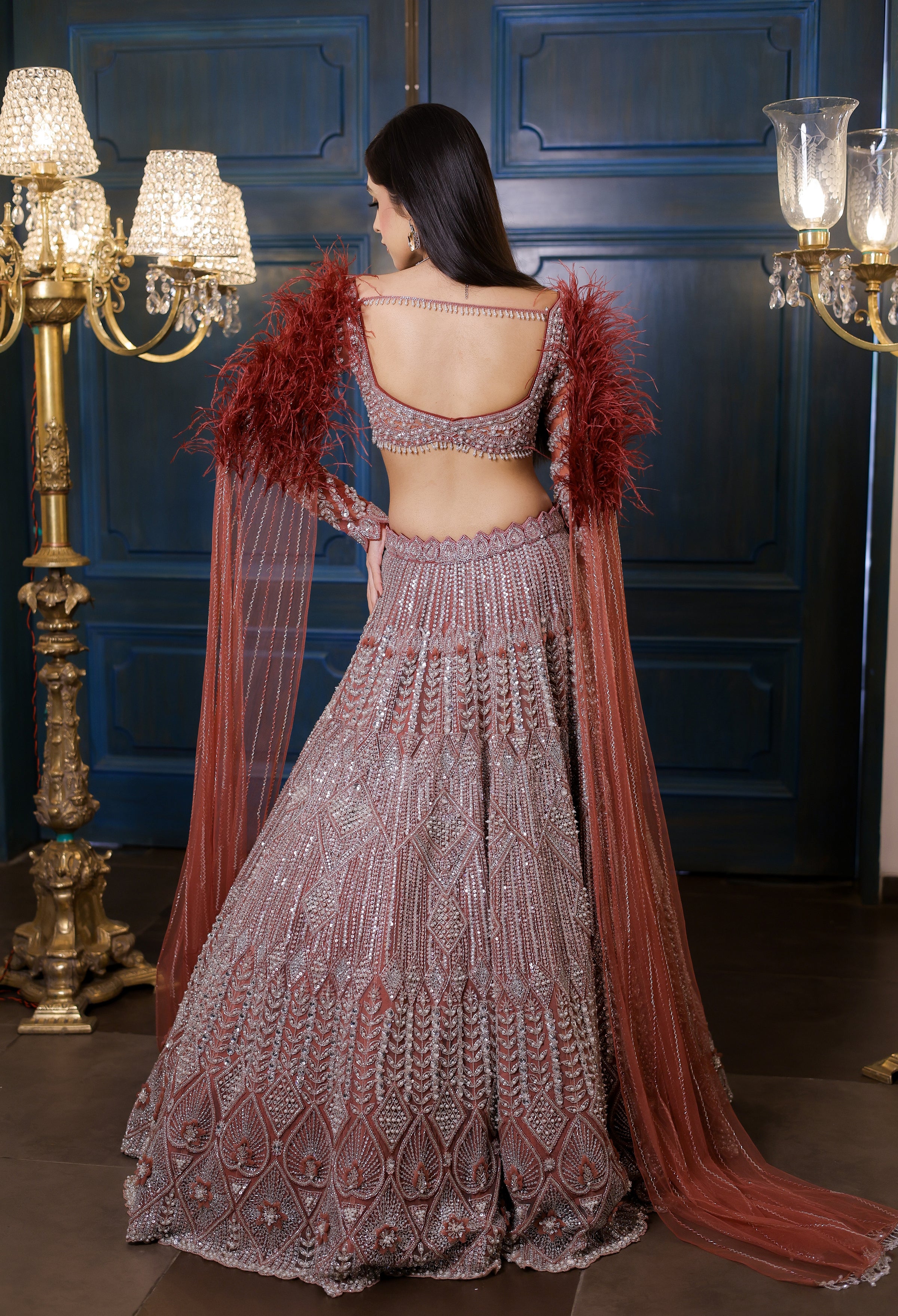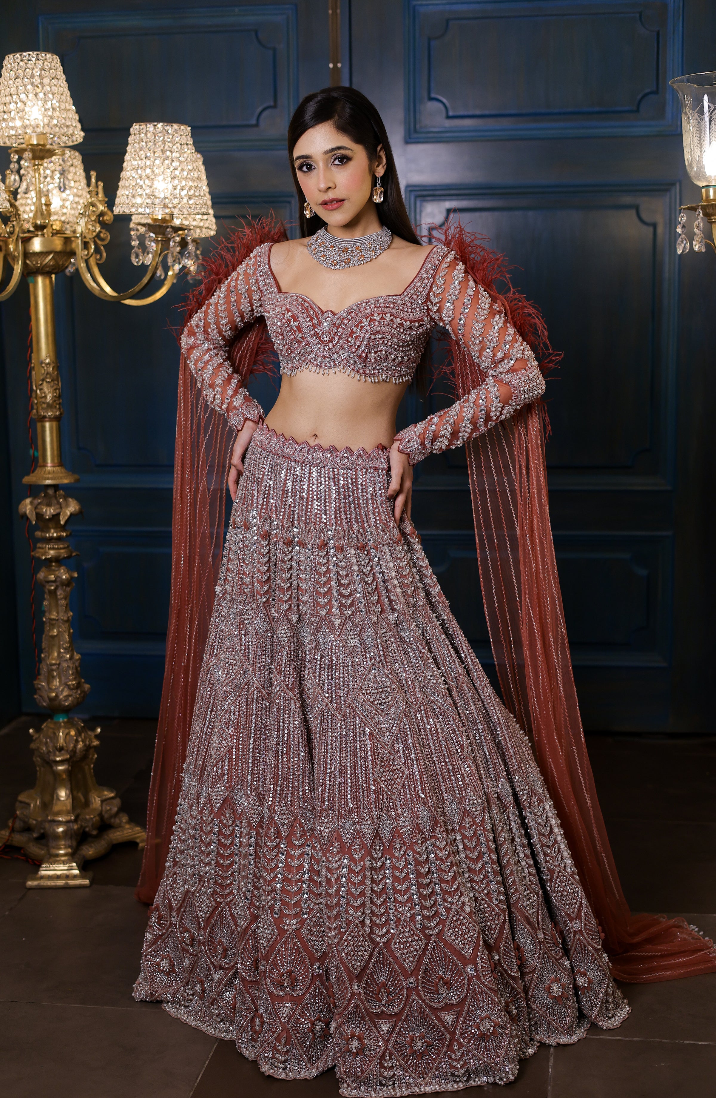 This striking rust and silver lehenga features all over sequin crystal and cutdana embroidery in silver and self-tones. Paired with a statement blouse with flowing side drapes and dramatic feather drape detailing.