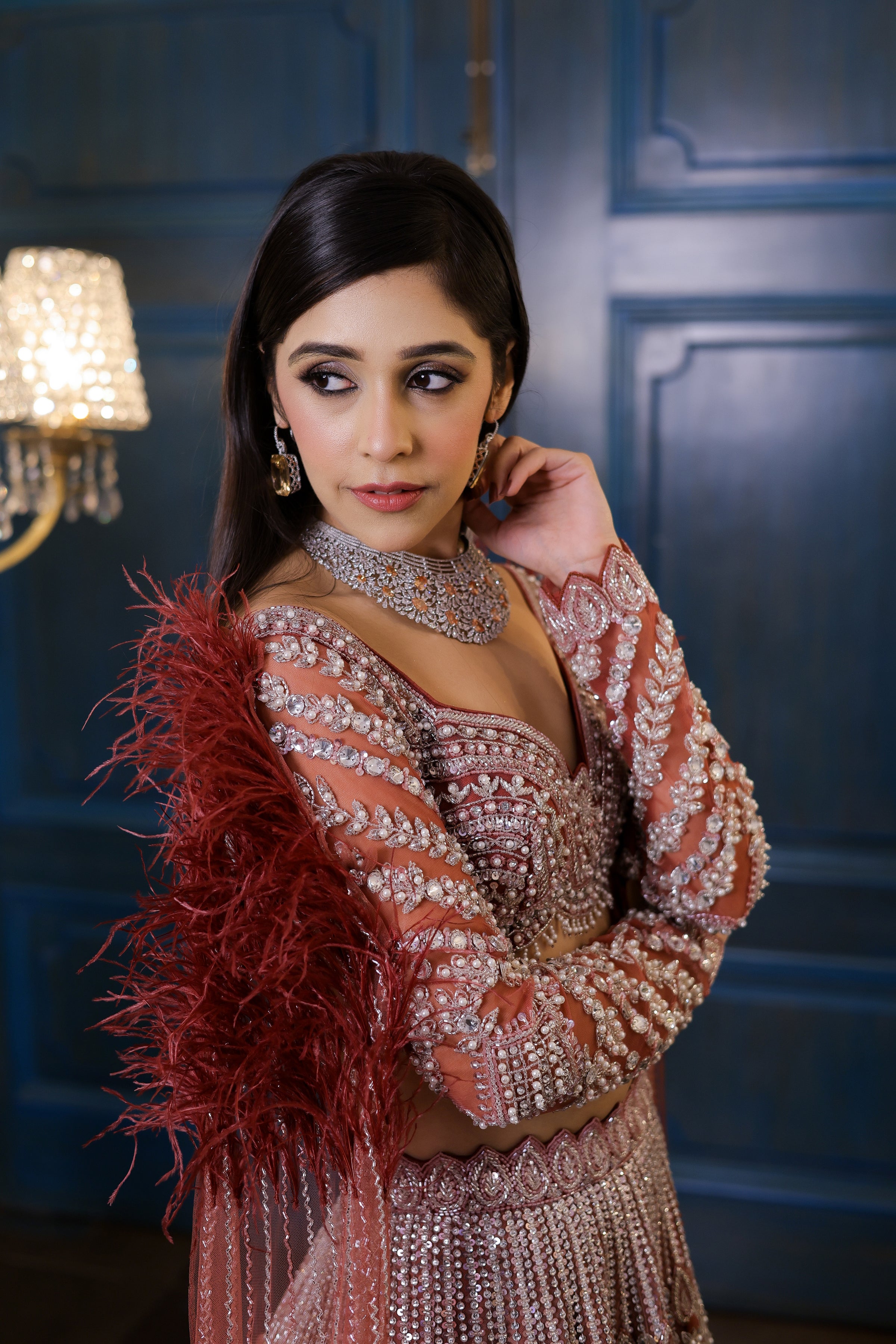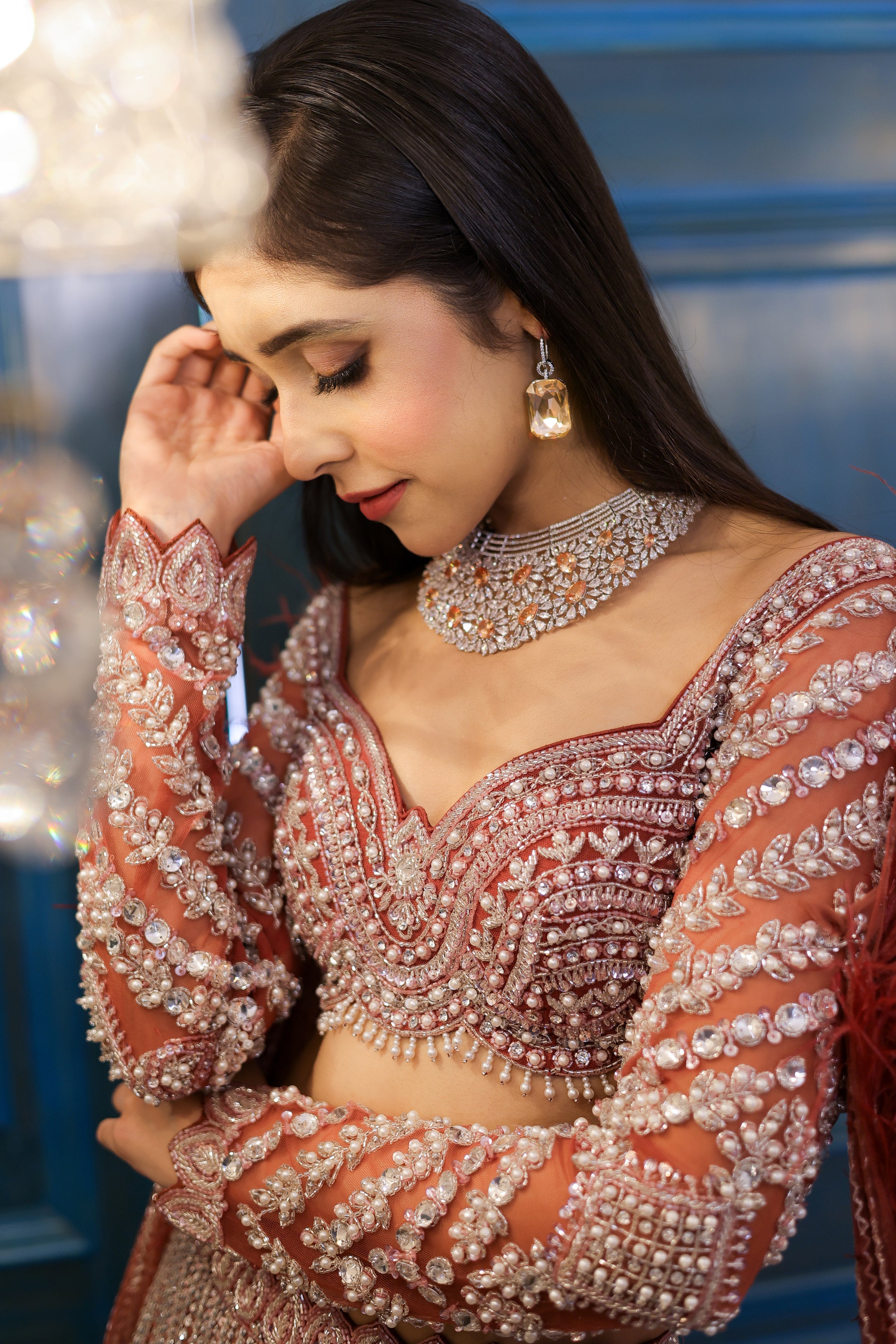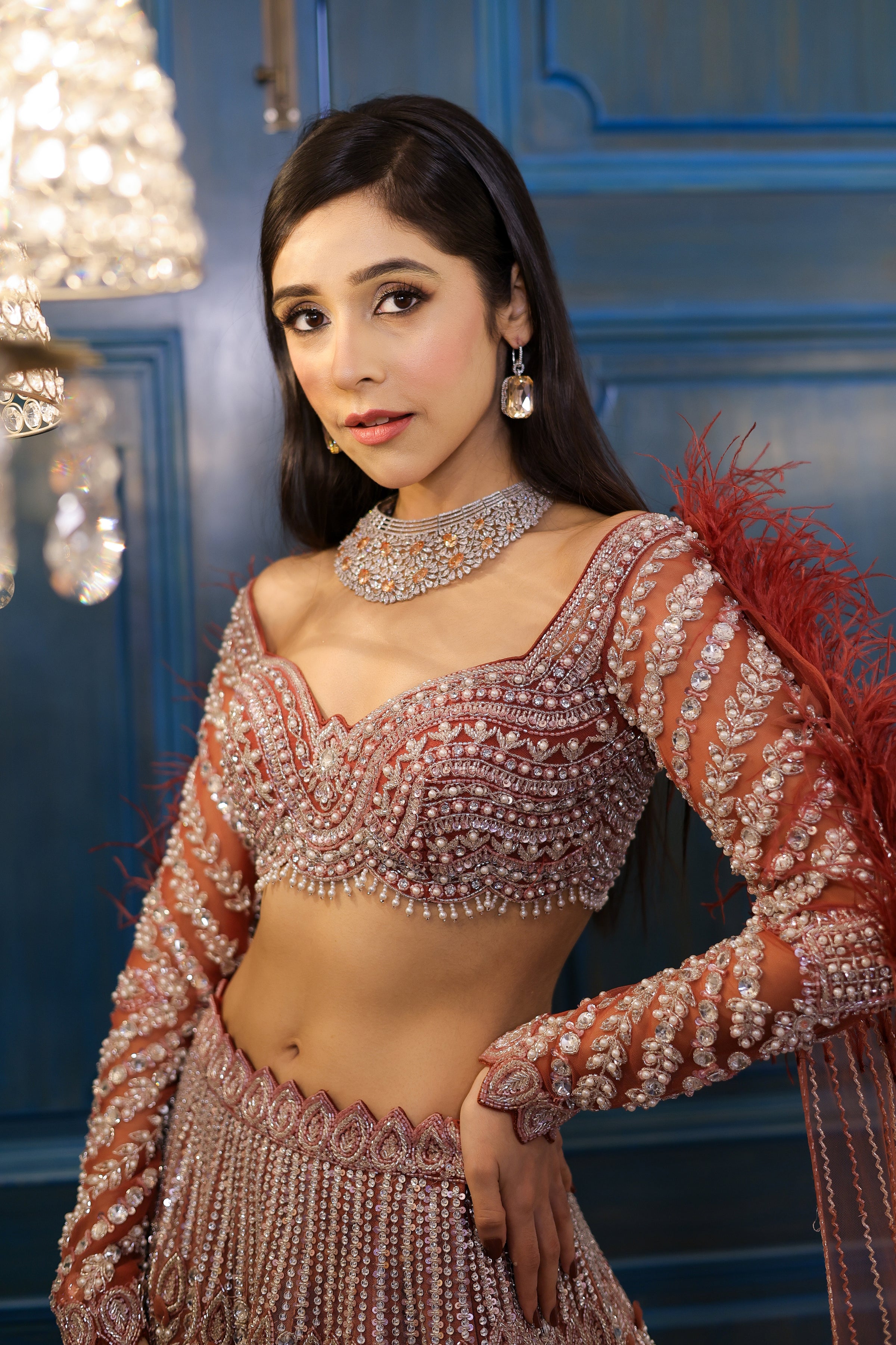 This striking rust and silver lehenga features all over sequin crystal and cutdana embroidery in silver and self-tones. Paired with a statement blouse with flowing side drapes and dramatic feather drape detailing.