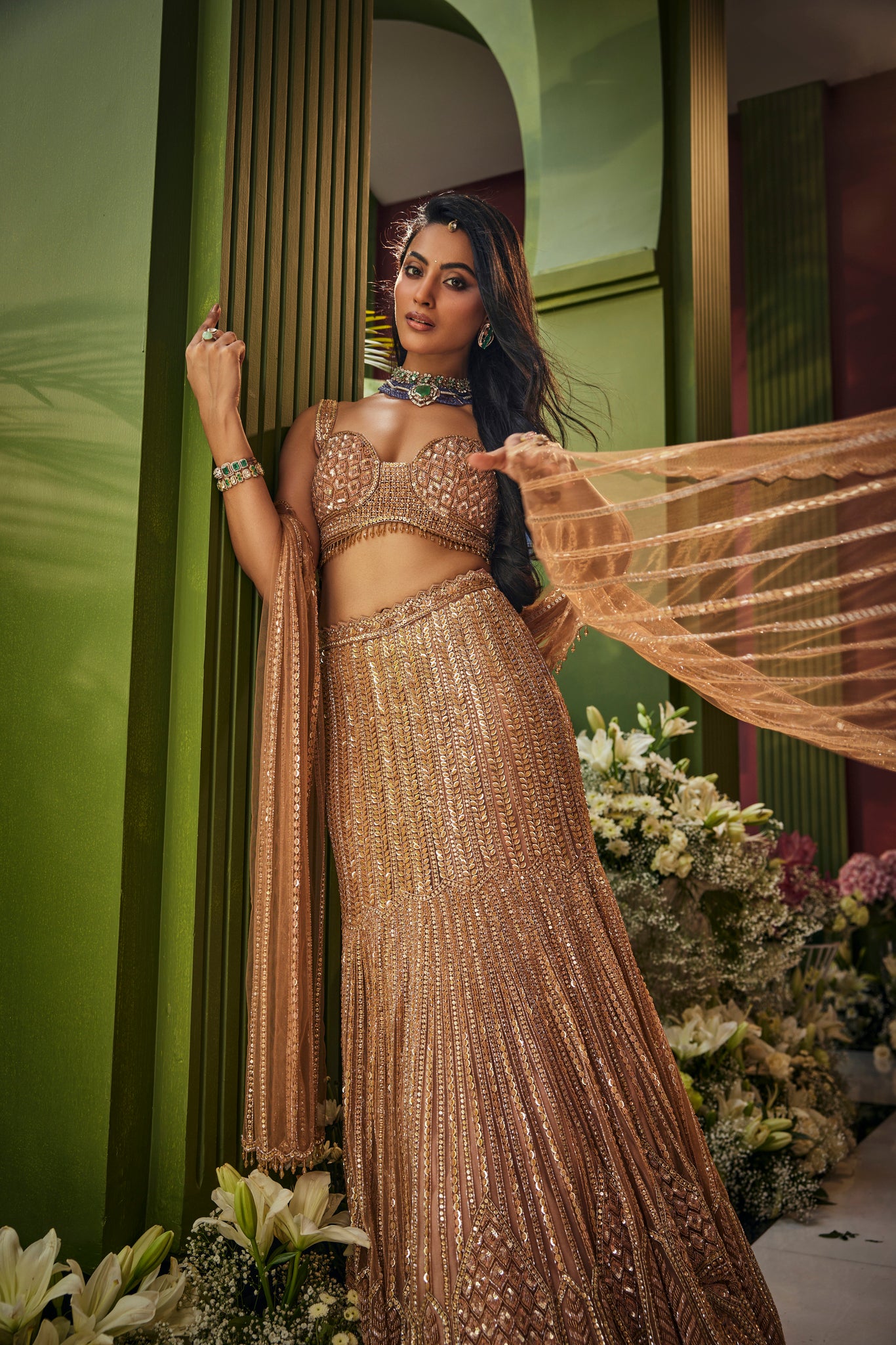 Copper gold fishcut lehenga with geometric embroidery motifs. Paired with a sleeveless blouse and embellished saree drape. This look can also be styled as a lehenga with dupatta