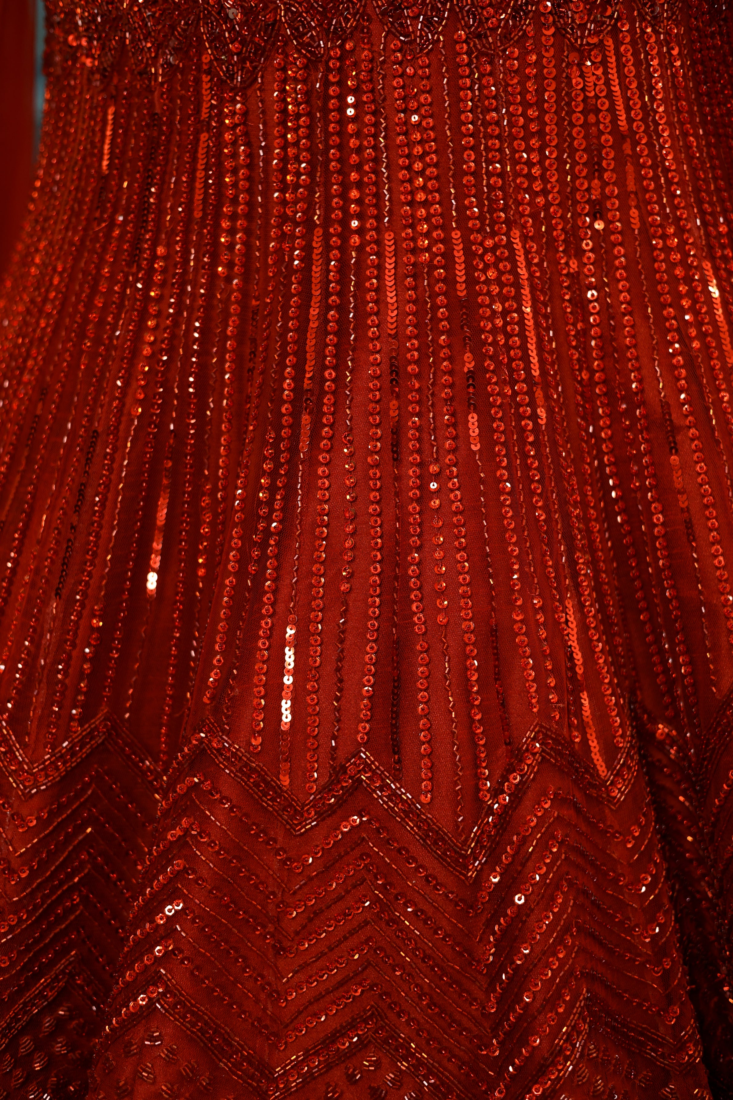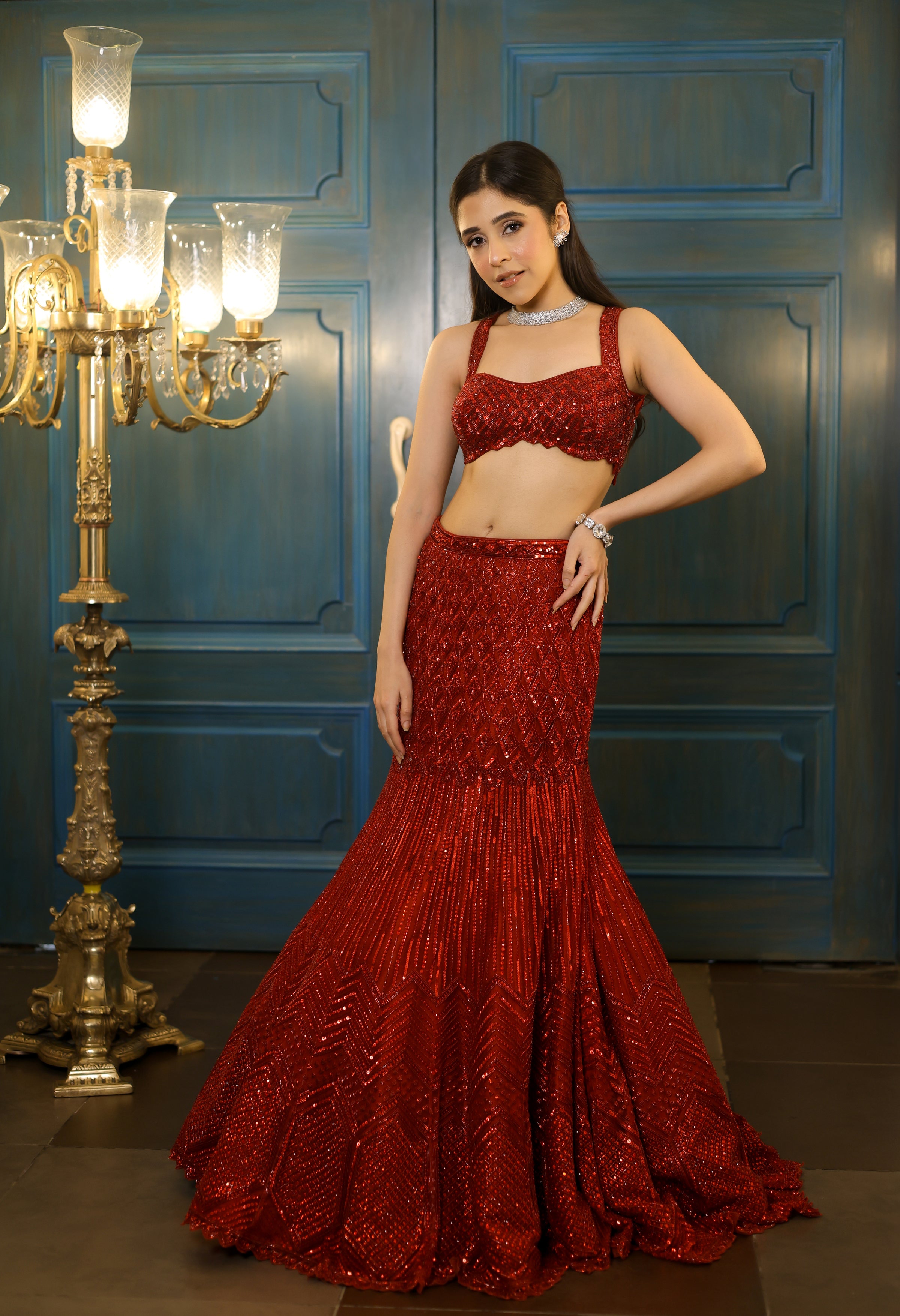 Striking red fishcut lehenga with all over sequin,crystal & cutdana tonal embroidery. Paired with an eye-catching strappy blouse and matching dupatta to complete the set.
