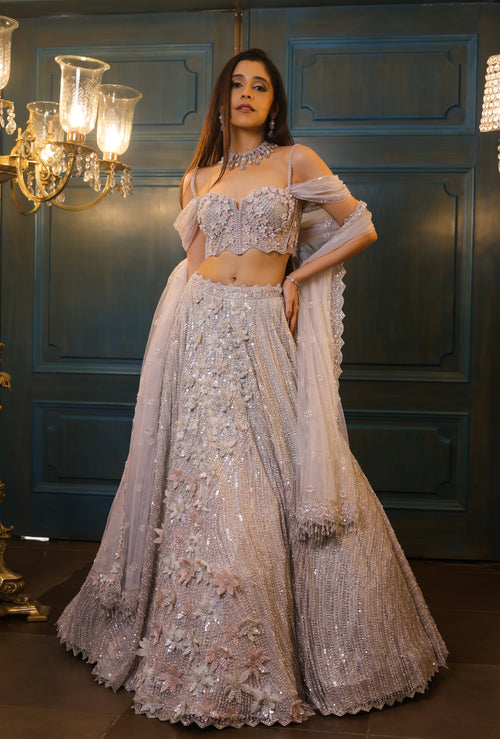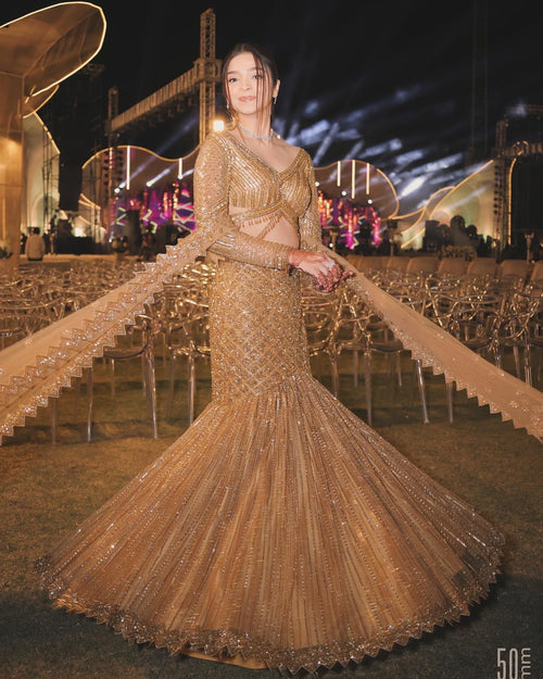 Light Gold Organza Net Embroidered Fish-Cut Lehenga Set