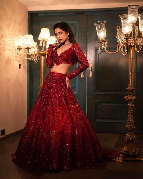 Red Net Sequins Embroidered Fish-Cut Lehenga Set