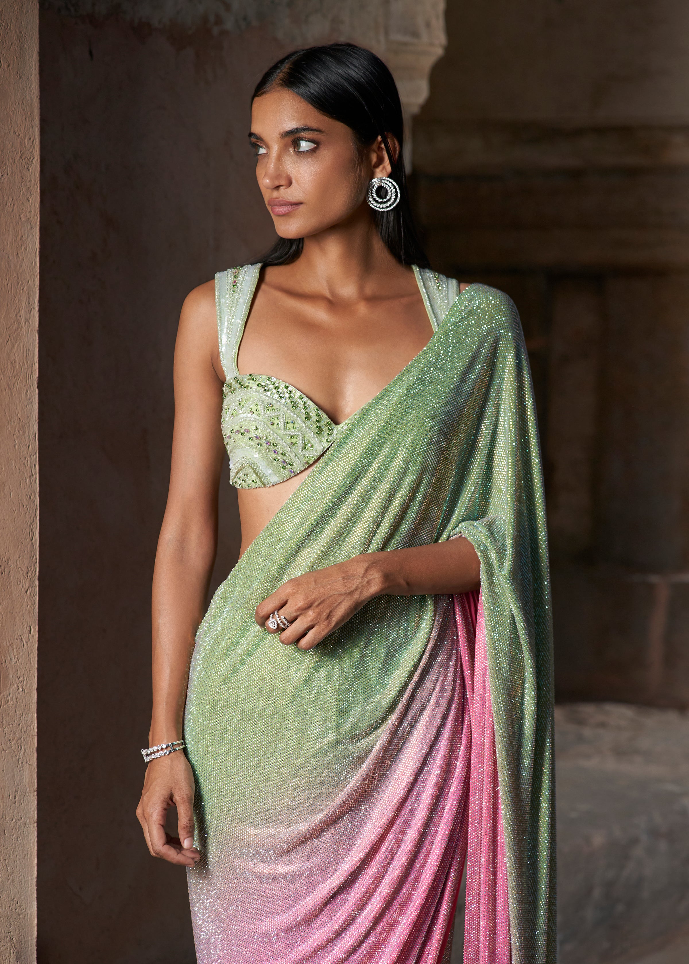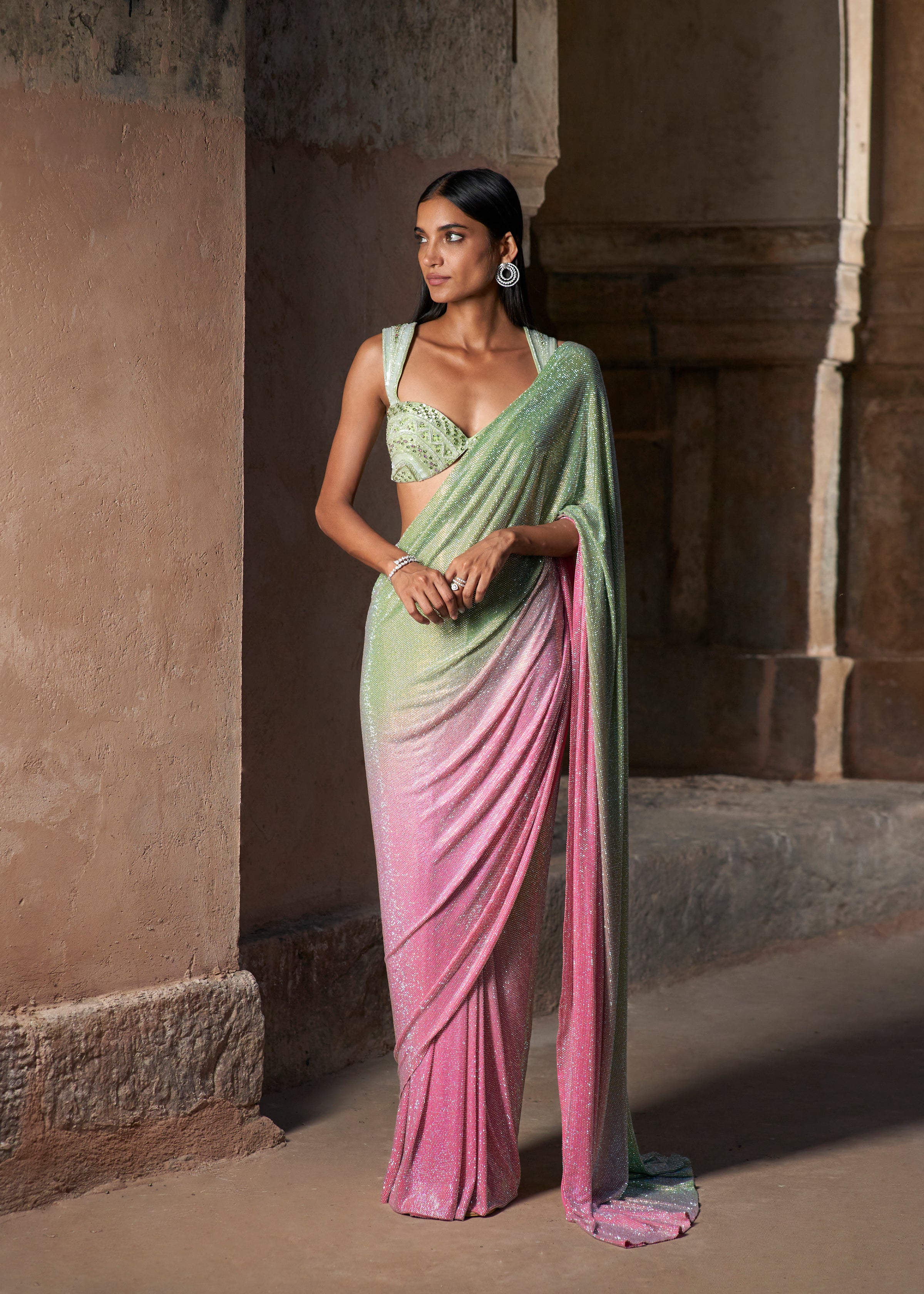 Mint green to cassata pink ombre crystal-embellished saree, paired with a fully stone-embellished mint green embroidered blouse.