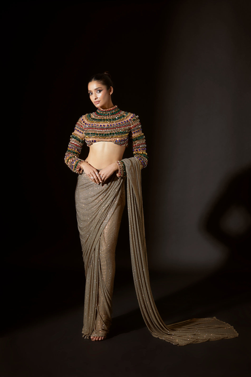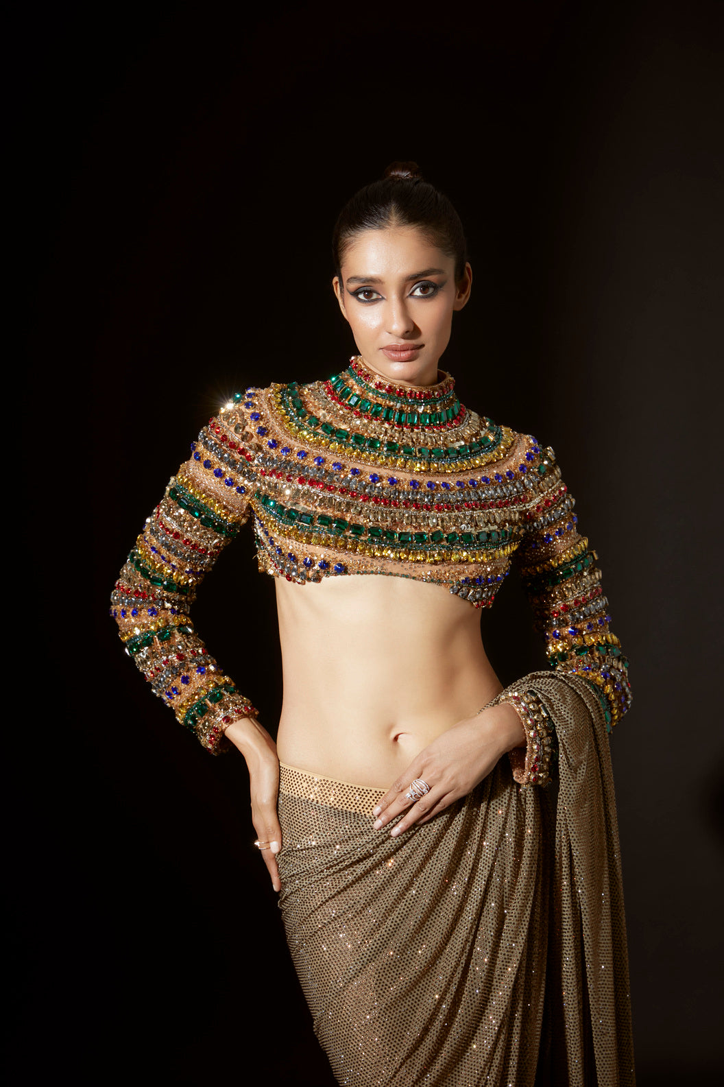 The vibrant multicolored jewel top, adorned with dazzling big crystals, radiates glamour and allure, drawing eyes with its captivating sparkle. paired with dusky gold emebellished prestitched saree.