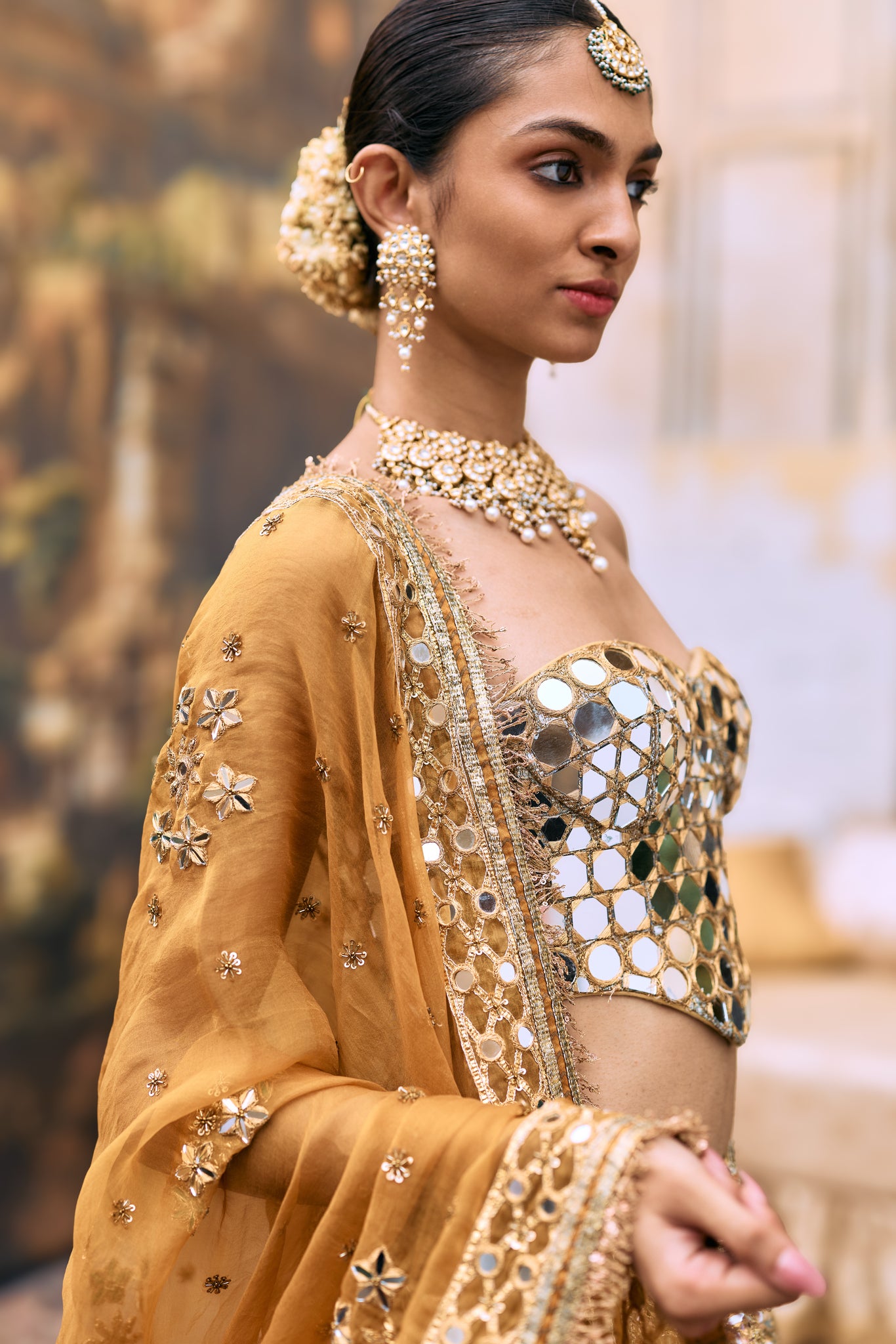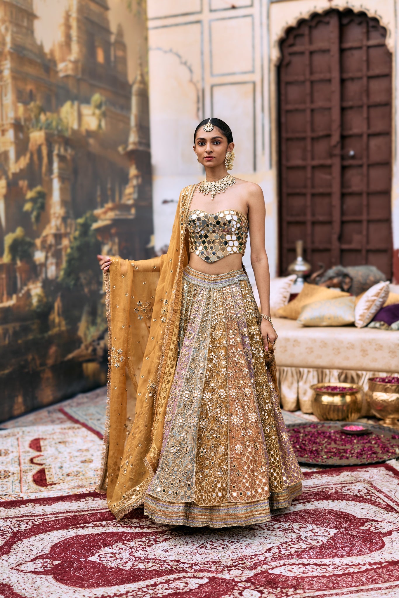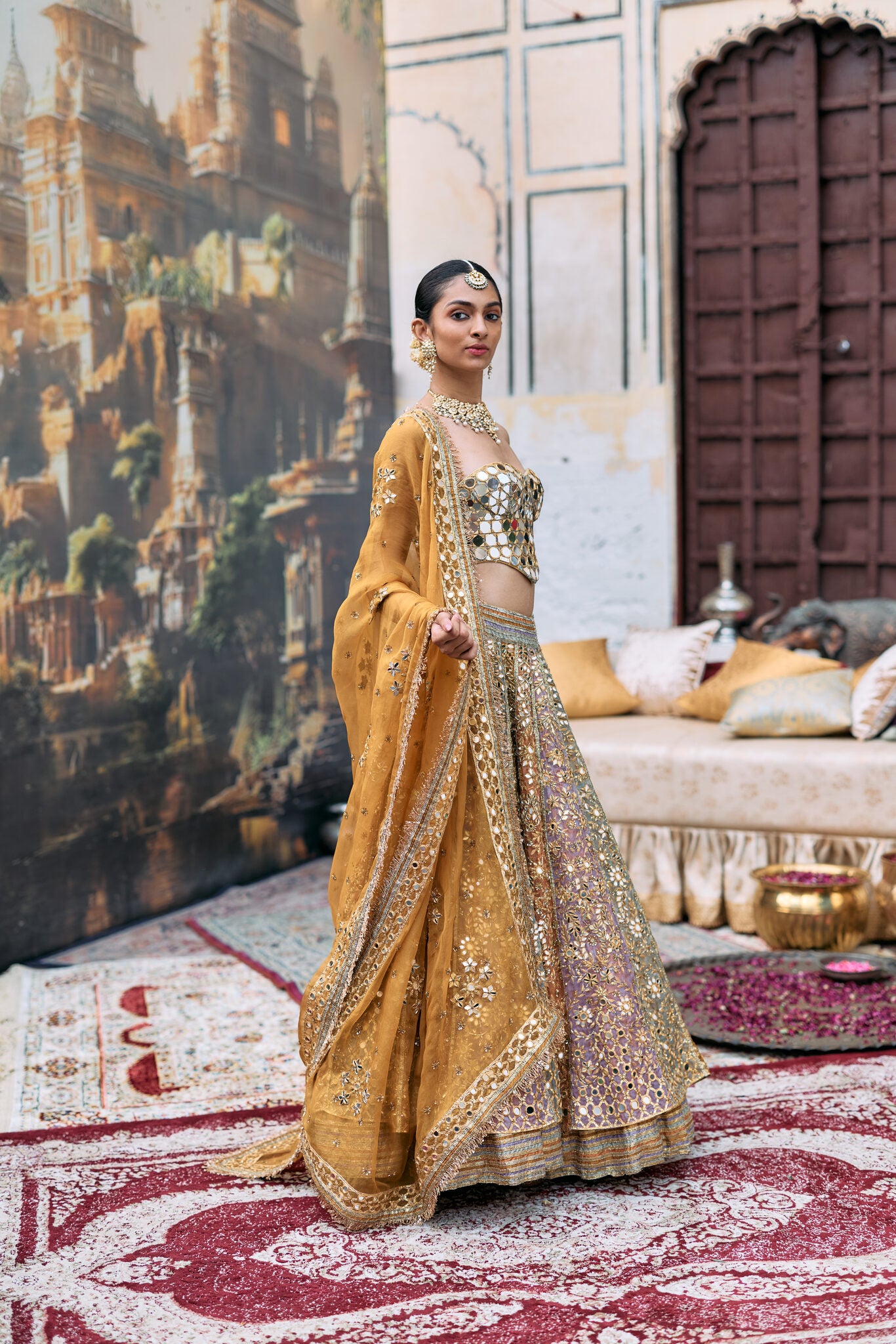 This outfit consists of a multicolor lehenga set in purple, blue, yellow, and orange that has a double layer, paired with a signature gold mirror corset and an orange organza mirror and gota dupatta.