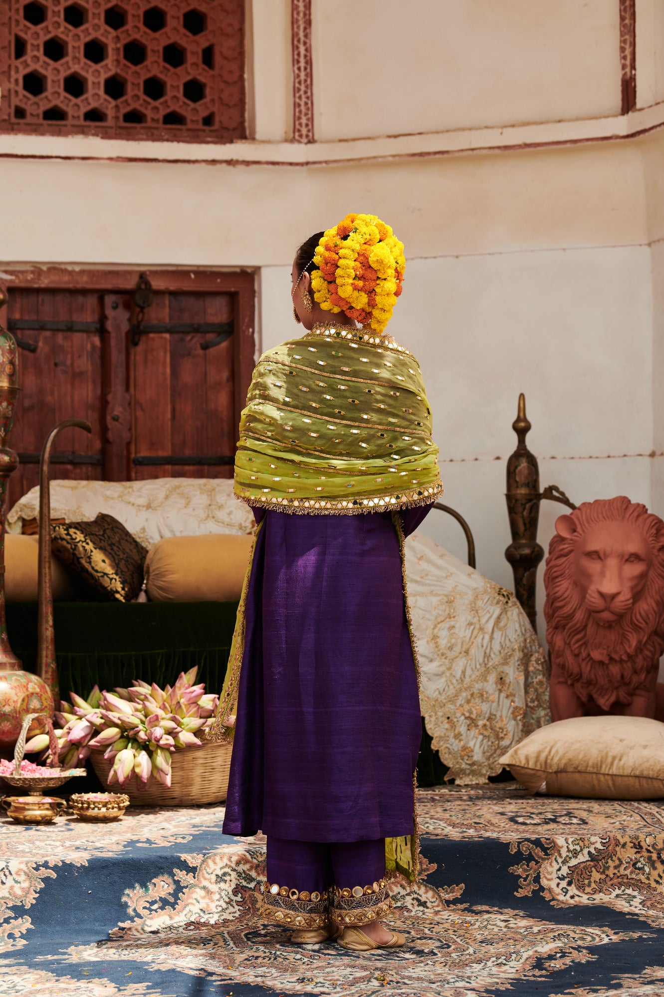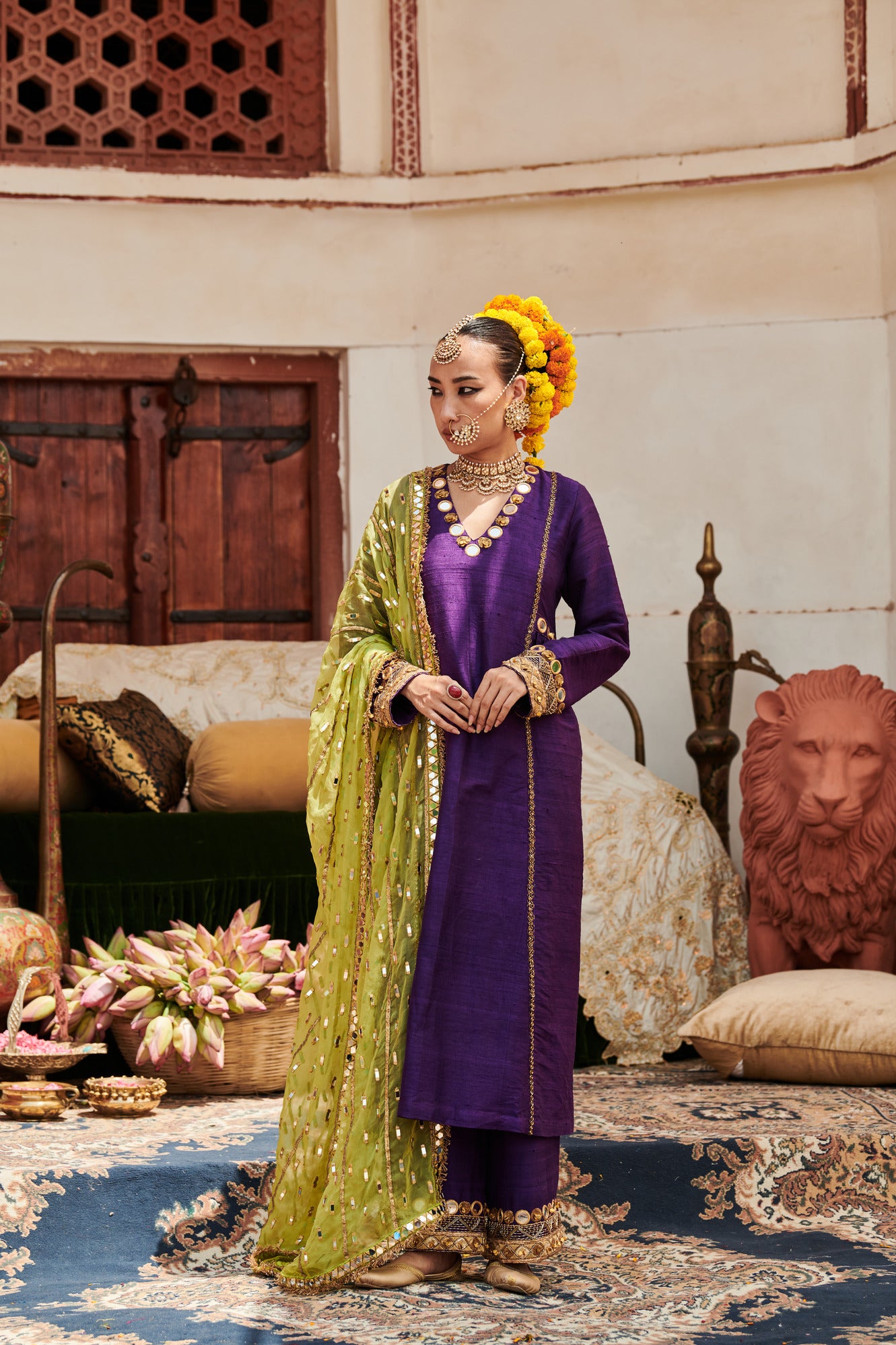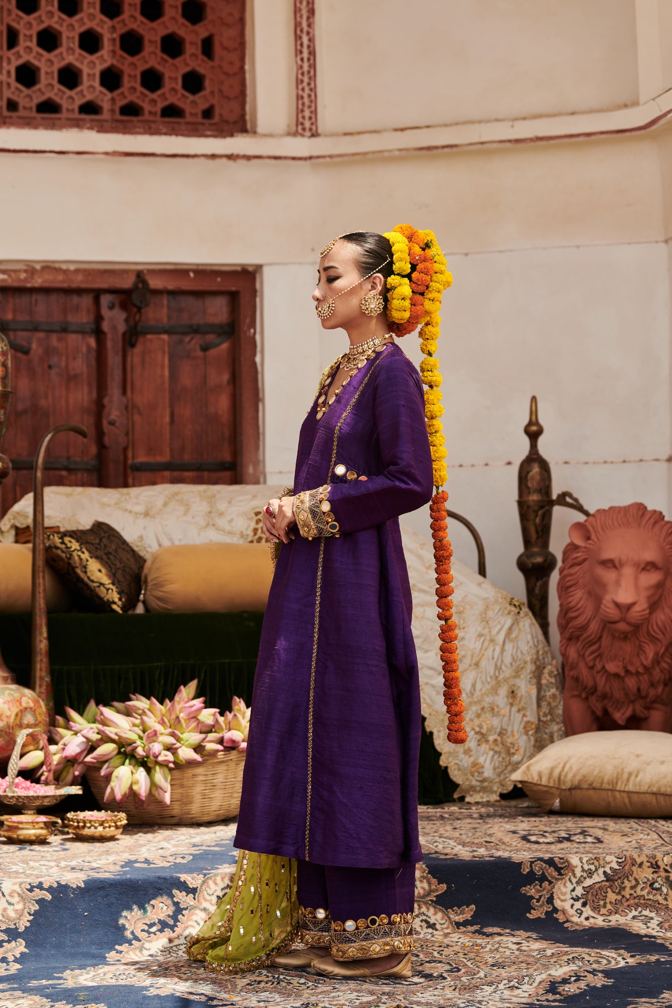 Purple Raw Silk  Sharara set with mirror work on neckline and sleeves paired with  matching pants and contrasting lime green organza dupatta.