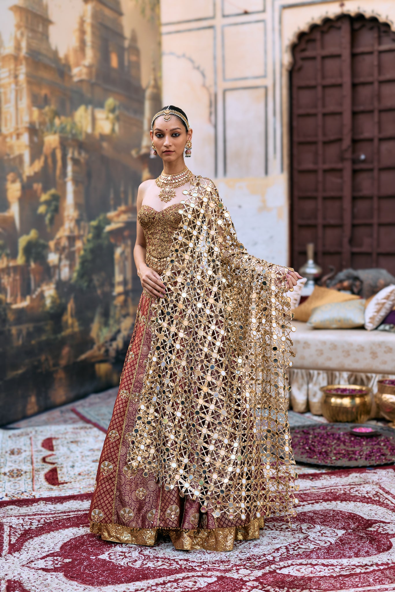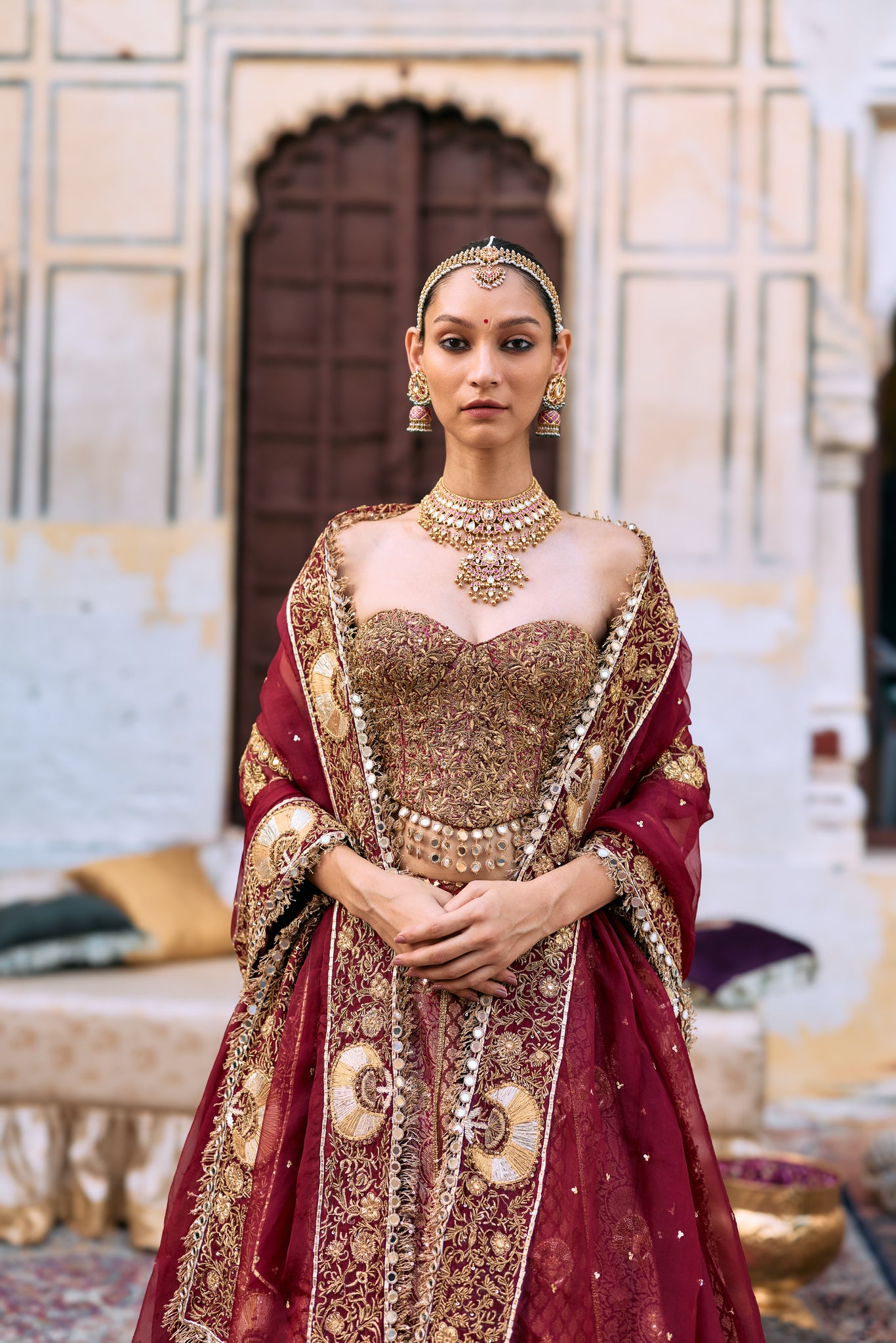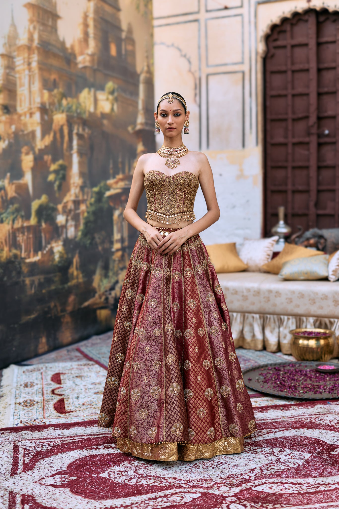 This set consists of a magenta, red, purple and brown panelled embroidered lehenga paired with a panelled intricate embroidered corset and organza embroidered dupatta